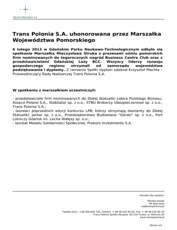 Trans Polonia S.A. uhonorowana przez Marszałka Województwa Pomorskiego 6 lutego 2013 w Gdańskim Parku Naukowo-Technologicznym odbyło się spotkanie Marszałka Mieczysława Struka z prezesami ośmiu pomorskich firm nominowanych do tegorocznych nagród Business Centre Club oraz z przedstawicielami Gdańskiej Loży BCC. Wszyscy liderzy rozwoju gospodarczego regionu otrzymali od samorządu województwa podziękowania i dyplomy. Z ramienia Spółki dyplom odebrał Krzysztof Płachta – Przewodniczący Rady Nadzorczej Trans Polonia S.A. W spotkaniu z marszałkiem uczestniczyli: - przedstawiciele firm nominowanych do Złotej Statuetki Lidera Polskiego Biznesu: Asseco Poland S.A., Stabilator sp. z o.o., STBU Brokerzy Ubezpieczeniowi sp. z o.o., Trans Polonia S.A.; - laureaci poprzednich edycji konkursu LPB, którzy otrzymają diamenty do Złotej Statuetki: Jantar sp. z o.o., Przedsiębiorstwo Budowlane "Górski" sp. z o.o., Port Lotniczy Gdańsk im. Lecha Wałęsy sp. o.o.; - laureat Medalu Solidarności Społecznej: Prokom Investments S.A. Kontakt dla mediów: Monika Jassak PR Specialist [email protected] Telefon kom.: +48 509 855 720, Telefon: + 48 58 533 90 02, Fax: + 48 58 533 90 20 Trans Polonia Spółka Akcyjna, 83-110 Tczew, ul. Rokicka 16 www.transpolonia.pl Strona 1/1 Powered by TCPDF (www.tcpdf.org)