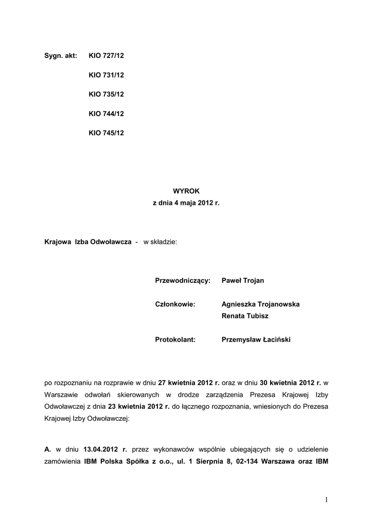 Sygn. akt: KIO 727/12 KIO 731/12 KIO 735/12 KIO 744/12 KIO 745/12 WYROK z dnia 4 maja 2012 r. Krajowa Izba Odwoławcza - w składzie: Przewodniczący: Paweł Trojan Członkowie: Agnieszka Trojanowska Renata Tubisz Protokolant: Przemysław Łaciński po rozpoznaniu na rozprawie w dniu 27 kwietnia 2012 r. oraz w dniu 30 kwietnia 2012 r. w Warszawie odwołań skierowanych w drodze zarządzenia Prezesa Krajowej Izby Odwoławczej z dnia 23 kwietnia 2012 r. do łącznego rozpoznania, wniesionych do Prezesa Krajowej Izby Odwoławczej: A. w dniu 13.04.2012 r. przez wykonawców wspólnie ubiegających się o udzielenie zamówienia IBM Polska Spółka z o.o., ul. 1 Sierpnia 8, 02-134 Warszawa oraz IBM 1 Česká Republika, spol. s r.o., V Parku 2294/4, 148 00 Praga 4, Republika Czeska (sygn. akt KIO 727/12), B. w dniu 13.04.2012 r. przez wykonawców wspólnie ubiegających się o udzielenie zamówienia WASKO S.A., ul. Berbeckiego 6, 44-100 Gliwice oraz Unizeto Technologies S.A., ul. Królowej Korony Polskiej 21, 70-486 Szczecin (sygn. akt KIO 731/12); C. w dniu 13.04.2012 r. przez wykonawców wspólnie ubiegających się o udzielenie zamówienia Sygnity S.A., Al. Jerozolimskie 180, 02-486 Warszawa; GeoInvent S.A..ul. Arabska 9, 03-997 Warszawa; COMP S.A., ul. Jutrzenki 116, 02-230 Warszawa; Enigma Systemy Ochrony Informacji Spółka z o.o., ul. Jutrzenki 116, 02-230 Warszawa oraz ADASA Sistemas S.A., c/Jose Augustin Goyytisolo 30-32, L’Hospitalet de LIobregat 08908 Barcelona, Hiszpania (sygn. akt KIO 735/12), D. w dniu 13.04.2012 r. przez wykonawców wspólnie ubiegających się o udzielenie zamówienia Qumak-Sekom S.A., Al. Jerozolimskie 94, 00-807 Warszawa oraz Polska Wytwórnia Papierów Wartościowych S.A., ul. Sanguszki 1, 00-222 Warszawa (sygn. akt KIO 744/12), E. w dniu 13.04.2012 r. przez wykonawców wspólnie ubiegających się o udzielenie zamówienia Fujitsu Technology Solutions Spółka z o.o., ul. Mszczonowska 4, 02-337 Warszawa oraz LUMENA S.A., ul. Reja 6, 02-053 Warszawa (sygn. akt KIO 745/12) w postępowaniu prowadzonym przez Zamawiającego – Instytut Meteorologii i Gospodarki Wodnej – Państwowy Instytut Badawczy, ul. Podleśna 61, 01-673 Warszawa w trybie przetargu ograniczonego pn.: Projekt, budowa i wdrożenie informatycznego systemu osłony kraju przed nadzwyczajnymi zagrożeniami (ISOK) oraz świadczenie usługi gwarancyjnej po wdrożeniu tego systemu (znak NJ/45/PO/U/GI/ISOK/2011). A. przy udziale wykonawców Konsorcjum AMG.net S.A., ul. Łąkowa 29, 90-554 Łódź ; Bull SAS, Rue Jean Jaures, 78340 Les Clayes-sous-Bois, Francja; Polcom Spółka z o.o., ul. Krakowska 43, 32-050 Skawina oraz GISPartner Spółka z o.o., ul. Kilińskiego 30, 50264 Wrocław zgłaszającego swoje przystąpienie do postępowania odwoławczego o sygn. akt KIO 727/12 po stronie Zamawiającego; 2 przy udziale wykonawcy Hewlett-Packard Polska Spółka z o.o., ul. Szturmowa 2A, 02-678 Warszawa zgłaszającego swoje przystąpienie do postępowania odwoławczego o sygn. akt KIO 727/12 po stronie Zamawiającego; przy udziale wykonawcy Asseco Poland S.A., ul. Olchowa 14, 35-322 Rzeszów zgłaszającego swoje przystąpienie do postępowania odwoławczego o sygn. akt KIO 727/12 po stronie Zamawiającego. B. przy udziale wykonawców Konsorcjum AMG.net S.A., ul. Łąkowa 29, 90-554 Łódź ; Bull SAS, Rue Jean Jaures, 78340 Les Clayes-sous-Bois, Francja; Polcom Spółka z o.o., ul. Krakowska 43, 32-050 Skawina oraz GISPartner Spółka z o.o., ul. Kilińskiego 30, 50264 Wrocław zgłaszającego swoje przystąpienie do postępowania odwoławczego o sygn. akt KIO 731/12 po stronie Zamawiającego; przy udziale wykonawcy Hewlett-Packard Polska Spółka z o.o., ul. Szturmowa 2A, 02-678 Warszawa zgłaszającego swoje przystąpienie do postępowania odwoławczego o sygn. akt KIO 731/12 po stronie Zamawiającego; przy udziale wykonawcy Asseco Poland S.A., ul. Olchowa 14, 35-322 Rzeszów zgłaszającego swoje przystąpienie do postępowania odwoławczego o sygn. akt KIO 731/12 po stronie Zamawiającego. C. przy udziale wykonawców Konsorcjum AMG.net S.A., ul. Łąkowa 29, 90-554 Łódź ; Bull SAS, Rue Jean Jaures, 78340 Les Clayes-sous-Bois, Francja; Polcom Spółka z o.o., ul. Krakowska 43, 32-050 Skawina oraz GISPartner Spółka z o.o., ul. Kilińskiego 30, 50264 Wrocław zgłaszającego swoje przystąpienie do postępowania odwoławczego o sygn. akt KIO 735/12 po stronie Zamawiającego; przy udziale wykonawców wspólnie ubiegających się o udzielenie zamówienia Konsorcjum WASKO S.A., ul. Berbeckiego 6, 44-100 Gliwice oraz Unizeto Technologies S.A., ul. Królowej Korony Polskiej 21, 70-486 Szczecin zgłaszających swoje przystąpienie do postępowania odwoławczego o sygn. akt KIO 735/12 po stronie Zamawiającego; D. przy udziale wykonawców Konsorcjum AMG.net S.A., ul. Łąkowa 29, 90-554 Łódź ; Bull SAS, Rue Jean Jaures, 78340 Les Clayes-sous-Bois, Francja; Polcom Spółka z o.o., ul. 3 Krakowska 43, 32-050 Skawina oraz GISPartner Spółka z o.o., ul. Kilińskiego 30, 50264 Wrocław zgłaszającego swoje przystąpienie do postępowania odwoławczego o sygn. akt KIO 744/12 po stronie Zamawiającego; przy udziale wykonawców wspólnie ubiegających się o udzielenie zamówienia Konsorcjum WASKO S.A., ul. Berbeckiego 6, 44-100 Gliwice oraz Unizeto Technologies S.A., ul. Królowej Korony Polskiej 21, 70-486 Szczecin zgłaszających swoje przystąpienie do postępowania odwoławczego o sygn. akt KIO 744/12 po stronie Zamawiającego; przy udziale wykonawcy Hewlett-Packard Polska Spółka z o.o., ul. Szturmowa 2A, 02-678 Warszawa zgłaszającego swoje przystąpienie do postępowania odwoławczego o sygn. akt KIO 744/12 po stronie Zamawiającego; przy udziale wykonawcy Asseco Poland S.A., ul. Olchowa 14, 35-322 Rzeszów zgłaszającego swoje przystąpienie do postępowania odwoławczego o sygn. akt KIO 744/12 po stronie Zamawiającego. E. przy udziale wykonawców Konsorcjum AMG.net S.A., ul. Łąkowa 29, 90-554