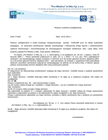 Wszyscy uczestnicy postępowania Znak: P-M/Z/ /12 Data: 16.01.2012 r. Dotyczy: postępowania w trybie przetargu nieograniczonego polegające poniżej 4.845.000 euro na roboty budowlane na wykonaniu pomieszczeń oddziału anestezjologii i intensywnej terapii łącznie z dostosowaniem zaplecza technicznego i komunikacyjnego do obowiązujących wymogów sanitarnych, bhp i ppoż bloku 1F/II budynku szpitala Pro-Medica w Ełku. Znak sprawy: 6640/2011 W imieniu „Pro-Medica” w Ełku Sp. z o. o. informujemy, iż na podstawie art. 38 ust. 1 ustawy z dnia 29 stycznia 2004 r. - Prawo zamówień publicznych (t. jedn. Dz. U. z 2010 r. nr 113, poz. 759 z późniejszymi zmianami ) do Zamawiającego zostały wniesione w terminie na 6 dni przed upływem terminu składania ofert; na 2 dni przed upływem terminu składania ofert - pod warunkiem, że wniosek o wyjaśnienie treści specyfikacji istotnych warunków zamówienia wpłynął do zamawiającego nie później niż do końca dnia, w którym upływa połowa wyznaczonego terminu składania ofert niżej przytoczone pytania: Pyt. Nr 1 do inwestora: W dołączonych do dokumentacji przedmiarach znajdują się klapy dymowe i świetliki proszę o podanie parametrów tych materiałów Odp. Inwestora: ad 1. Klapy dymowe i świetliki dotyczące klatki schodowej K 10 ujęte są w odrębnym projekcie. Nie należy ich uwzględniać. Pyt. Nr 28. Proszę o wyjaśnienie poz. 46. – jest niezrozumiała w opisie. Czy do wyceny należy przyjąć po 1 świetliku i 1 klapie dymowej – czy po 2 świetliki lub 2 klapy dymowe? Odp. Inwestora: ad 28. Do wyceny należy przyjąć 2 klapy dymowe. Wg odpowiedzi na pytanie nr 1 inwestor odpowiada i% klapy dymowe i świetliki należą do innego opracowania natomiast w odpowiedzi na pytanie nr 28 odpowiada i% należy uwzględnić 2 szt. Klap dymowych. Proszę o jednoznaczna odpowiedz czy klapy dymowe wchodzą w zakres zamówienia oraz o podanie ich parametrów technicznych. Na podstawie art. 38 ust. 1 i 2 w/w ustawy Prawo zamówień publicznych w imieniu „Pro-Medica” w Ełku Sp. z o. o. odpowiadamy, że: Ad.28 - Klapy dymowe i świetliki dotyczące klatki schodowej K 10 ujęte są w odrębnym projekcie. Nie należy ich uwzględniać. z poważaniem Sąd Rejonowy w Olsztynie VIII Wydział Gospodarczy Krajowego Rejestru Sądowego nr KRS 0000026179 Kapitał zakładowy 16 609 000,00 PLN REGON 510996861, NIP 848-16-30-309