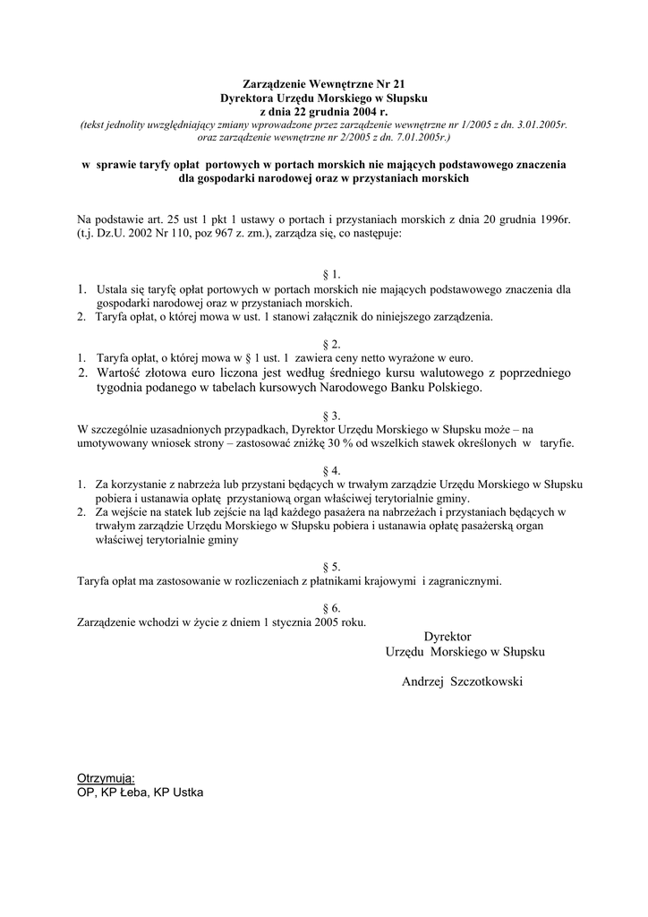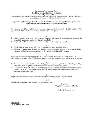 Zarządzenie Wewnętrzne Nr 21 Dyrektora Urzędu Morskiego w Słupsku z dnia 22 grudnia 2004 r. (tekst jednolity uwzględniający zmiany wprowadzone przez zarządzenie wewnętrzne nr 1/2005 z dn. 3.01.2005r. oraz zarządzenie wewnętrzne nr 2/2005 z dn. 7.01.2005r.) w sprawie taryfy opłat portowych w portach morskich nie mających podstawowego znaczenia dla gospodarki narodowej oraz w przystaniach morskich Na podstawie art. 25 ust 1 pkt 1 ustawy o portach i przystaniach morskich z dnia 20 grudnia 1996r. (t.j. Dz.U. 2002 Nr 110, poz 967 z. zm.), zarządza się, co następuje: § 1. 1. Ustala się taryfę opłat portowych w portach morskich nie mających podstawowego znaczenia dla gospodarki narodowej oraz w przystaniach morskich. 2. Taryfa opłat, o której mowa w ust. 1 stanowi załącznik do niniejszego zarządzenia. § 2. 1. Taryfa opłat, o której mowa w § 1 ust. 1 zawiera ceny netto wyrażone w euro. 2. Wartość złotowa euro liczona jest według średniego kursu walutowego z poprzedniego tygodnia podanego w tabelach kursowych Narodowego Banku Polskiego. § 3. W szczególnie uzasadnionych przypadkach, Dyrektor Urzędu Morskiego w Słupsku może – na umotywowany wniosek strony – zastosować zniżkę 30 % od wszelkich stawek określonych w taryfie. § 4. 1. Za korzystanie z nabrzeża lub przystani będących w trwałym zarządzie Urzędu Morskiego w Słupsku pobiera i ustanawia opłatę przystaniową organ właściwej terytorialnie gminy. 2. Za wejście na statek lub zejście na ląd każdego pasażera na nabrzeżach i przystaniach będących w trwałym zarządzie Urzędu Morskiego w Słupsku pobiera i ustanawia opłatę pasażerską organ właściwej terytorialnie gminy § 5. Taryfa opłat ma zastosowanie w rozliczeniach z płatnikami krajowymi i zagranicznymi. § 6. Zarządzenie wchodzi w życie z dniem 1 stycznia 2005 roku. Dyrektor Urzędu Morskiego w Słupsku Andrzej Szczotkowski Otrzymują: OP, KP Łeba, KP Ustka ZAŁĄCZNIK DO ZARZĄDZENIA WEWNĘTRZNEGO nr 21… DYREKTORA URZĘDU MORSKIEGO W SŁUPSKU Z DNIA 22 GRUDNIA 2004 ROKU. I. TARYFA OPŁAT PORTOWYCH W PORTACH MORSKICH NIE MAJĄCYCH PODSTAWOWEGO ZNACZENIA DLA GOSPODARKI NARODOWEJ ORAZ W PRZYSTANIACH MORSKICH. 1. OPŁATY TONAŻOWE 1.1 Opłaty tonażowe 1) Za wejście i wyjście statku do/z portu lub przystani, w których Dyrektor Urzędu Morskiego jest uprawniony do stanowienia i pobierania opłat portowych oraz za zapewnienie odbioru odpadów w celu przekazania ich do odzysku lub unieszkodliwienia pobiera się opłatę uzależnioną od rodzaju i wielkości statków oraz czasu użytkowania infrastruktury portowej w wysokości: 1.1.1 Od statków żeglugi morskiej i śródlądowej, oprócz statków pasażerskich, promów pasażersko towarowych, statków wycieczkowych i rybackich. Długość statku (w metrach) do 50 powyżej 50 1.1.2 stawka ( EUR/1 GT) wejście/wyjście miesięczna 0,3 0,35 1,5 2,0 roczna 6,6 9,0 Od statków pasażerskich, promów pasażersko towarowych, statków wycieczkowych oraz sportowo-rekreacyjnych prowadzących działalność zarobkową Długość statku stawka ( EUR/1 GT) 1)50 metrów i mniej 2)powyżej 50 dobowa 0,2 0,3 miesięczna roczna 1 1,5 6 7,5 1.1.3 Od łodzi rybackich na przystaniach morskich: Długość łodzi stawka (EUR/ 1 GT) ( w metrach) 1) 9 metrów i mniej 2) 10 metrów i mniej 3) powyżej 10 m dobowa 0,1 0,15 0.2 miesięczna 0,5 0,8 1,0 roczna 2,5 3,5 5,0 1.1.4 Od statków rybackich w porcie Rowy i Dźwirzyno: Zanurzenie statku ( w metrach) 1) 0,9 i mniej 2) powyżej 0,9 opłata ( EUR/1 GT) dobowa miesięczna 0,2 0,3 roczna 1 1,5 2,5 5,0 1.1.5 od statków rybackich w porcie Łeba i Ustka Długość statku stawka ( EUR/1 GT) 1) 9 metrów i mniej 2)powyżej 9 dobowa 0,25 0,2 miesięczna 1,5 0,8 roczna 4,0 3,0 1.1.6 Od statków sportowych stawka ( EUR/1 GT) 1.2. dobowa 0,00 miesięczna 0,00 roczna 0,00 Zwyżki i zniżki opłat. 1.2.1. Statki zatrzymujące się na redzie portu i dokonujące tam załadunku lub wyładunku, względnie odprawy pasażerów ponoszą opłaty tonażowe w wysokości 50% stawki zasadniczej. 1.2.2. Statki towarowe żeglugi śródlądowej i morskiej (w tym pchacze i holowniki), statki bez własnego napędu – barki, pontony, krypy, szalupy, dźwigi pływające oraz inne tym podobne,– ponoszą opłaty portowe w wysokości 50 % stawek cennikowych z pkt. 1.1.1. 1.2.3. W razie pierwszej rejestracji statku w porcie opłatę tonażową nalicza się ze stawki rocznej proporcjonalnie do upływu czasu. 1.2.4. W przypadku sezonowego przewozu więcej niż 12 pasażerów przez statki przeznaczone do innych celów, opłatę roczną nalicza się proporcjonalnie do ilości rozpoczętych miesięcy w przewozach pasażerskich i działalności podstawowej. 1.3. Zwolnienia z opłat. 1.3.1. Od uiszczenia opłat tonażowych zwolnione są statki: Marynarki Wojennej, Straży Granicznej, Policji, Wodnego Ochotniczego Pogotowia Ratunkowego oraz naukowo-badawcze i używane do ratownictwa ekologicznego, a także statki: okręgowych inspektoratów rybołówstwa morskiego, hydrograficzne, dozorcze, pożarnicze, telekomunikacyjne, celne, sanitarne, szkolne, pilotowe, statki używane wyłącznie do ratowania życia na morzu oraz statki sportowe o długości całkowitej 8 m i mniej. 1.3.2. Zwolnienie od opłat nie dotyczy statków wymienionych w pkt.1.3.1 z dniem użycia statku do innej działalności niż działalność będąca podstawą zwolnienia 1.3.3. Od wnoszenia do portu w celu: - opłat tonażowych zwolnione są statki wchodzące schronienia przed sztormem, uzupełnienia paliwa, prowiantu i wody, uzyskania pomocy lekarskiej (do 12 godz. pobytu od wejścia), dokonania odprawy graniczo-celnej z wizytą kurtuazyjną, udziału w regatach międzynarodowych lub krajowych, udziału w imprezach międzynarodowych lub krajowych. oraz statki nie mogące wyjść z portu z powodu niskiego stanu wody lub zalodzenia. Po ustąpieniu wymienionych przyczyn statek obowiązany jest opuścić port w ci
