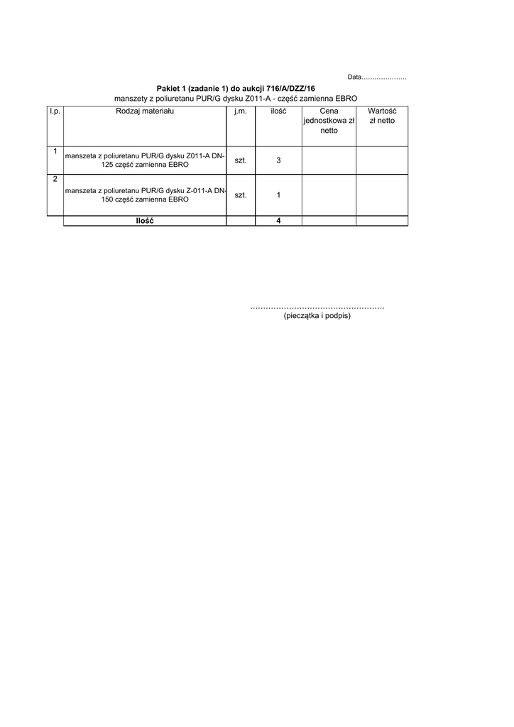 Data………………… Pakiet 1 (zadanie 1) do aukcji 716/A/DZZ/16 manszety z poliuretanu PUR/G dysku Z011-A - część zamienna EBRO l.p. 1 Rodzaj materiału j.m. ilość manszeta z poliuretanu PUR/G dysku Z011-A DN125 część zamienna EBRO szt. 3 manszeta z poliuretanu PUR/G dysku Z-011-A DN150 część zamienna EBRO szt. 1 Cena jednostkowa zł netto Wartość zł netto 2 Ilość 4 ……………………………………………. (pieczątka i podpis)
