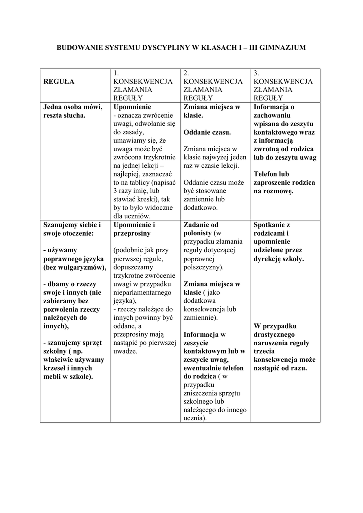 BUDOWANIE SYSTEMU DYSCYPLINY W KLASACH I – III GIMNAZJUM REGUŁA Jedna osoba mówi, reszta słucha. Szanujemy siebie i swoje otoczenie: 1. KONSEKWENCJA ZŁAMANIA REGUŁY Upomnienie - oznacza zwrócenie uwagi, odwołanie się do zasady, umawiamy się, że uwaga może być zwrócona trzykrotnie na jednej lekcji – najlepiej, zaznaczać to na tablicy (napisać 3 razy imię, lub stawiać kreski), tak by to było widoczne dla uczniów. Upomnienie i przeprosiny (podobnie jak przy - używamy poprawnego języka pierwszej regule, (bez wulgaryzmów), dopuszczamy trzykrotne zwrócenie - dbamy o rzeczy uwagi w przypadku nieparlamentarnego swoje i innych (nie języka), zabieramy bez - rzeczy należące do pozwolenia rzeczy innych powinny być należących do oddane, a innych), przeprosiny mają - szanujemy sprzęt nastąpić po pierwszej uwadze. szkolny ( np. właściwie używamy krzeseł i innych mebli w szkole). 2. KONSEKWENCJA ZŁAMANIA REGUŁY Zmiana miejsca w klasie. 3. KONSEKWENCJA ZŁAMANIA REGUŁY Informacja o zachowaniu wpisana do zeszytu Oddanie czasu. kontaktowego wraz z informacją Zmiana miejsca w zwrotną od rodzica klasie najwyżej jeden lub do zeszytu uwag raz w czasie lekcji. Telefon lub Oddanie czasu może zaproszenie rodzica być stosowane na rozmowę. zamiennie lub dodatkowo. Zadanie od polonisty (w przypadku złamania reguły dotyczącej poprawnej polszczyzny). Spotkanie z rodzicami i upomnienie udzielone przez dyrekcję szkoły. Zmiana miejsca w klasie ( jako dodatkowa konsekwencja lub zamiennie). Informacja w zeszycie kontaktowym lub w zeszycie uwag, ewentualnie telefon do rodzica ( w przypadku zniszczenia sprzętu szkolnego lub należącego do innego ucznia). W przypadku drastycznego naruszenia reguły trzecia konsekwencja może nastąpić od razu. Dbamy o bezpieczeństwo swoje i innych: Upomnienie i przeprosiny. Informacja w zeszycie kontaktowym z informacją zwrotną od rodzica lub/i w zeszycie uwag lub telefon do rodzica. Interwencyjne wezwanie rodziców do szkoły, ewentualne zawiadomienie policji lub sądu (trzecia konsekwencja może być zastosowana od razu w przypadku drastycznego naruszenia reguły, na przykład pobicia). Telefonów komórkowych używamy wyłącznie w czasie przerw (na lekcjach są wyłączone lub wyciszone i schowane). Zwrócenie uwagi, polecenie wyłączenia (jeden raz). Zatrzymanie wyłączonego telefonu do końca lekcji tego dnia (można skontaktować się z rodzicem z telefonu ucznia). Informacja w zeszycie kontaktowym z informacją zwrotną od rodzica lub rozmowa telefoniczna z rodzicem. W przypadku trudności z kontaktem zapraszamy rodzica do szkoły na rozmowę. Do szkoły przychodzimy odpowiednio ubrani: - czysto i schludnie, stonowane kolory (wyjątek stanowi piątek), zakryte ramiona, brzuchy i dekolty, - niewidoczny makijaż, - galowy strój wtedy, gdy jest wymagany. Zwrócenie uwagi, polecenie zmycia makijażu. Dodatkowa praca z przedmiotu, na którym miało miejsce zdarzenie. Informacja w zeszycie uwag lub w zeszycie kontaktowym z informacją zwrotną od rodzica. - kontaktujemy się z sobą bez używania agresji - konflikty rozwiązujemy przy pomocy rozmowy. Rozmowa z panią pielęgniarką na temat skutków stosowania nadmiernego makijażu lub skutków niedbania o odzież. Spotkanie i rozmowa z rodzicami i uczniem gabinecie pedagoga lub dyrektora. Miejsce na inną regułę, która może okazać się niezbędna w przyszłości.