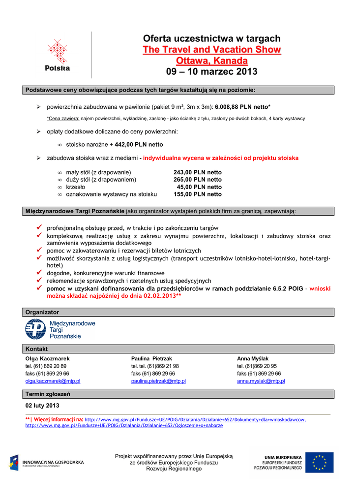 Oferta uczestnictwa w targach The Travel and Vacation Show Ottawa, Kanada 09 – 10 marzec 2013 Podstawowe ceny obowiązujące podczas tych targów kształtują się na poziomie: powierzchnia zabudowana w pawilonie (pakiet 9 m², 3m x 3m): 6.008,88 PLN netto* *Cena zawiera: najem powierzchni, wykładzinę, zasłonę - jako ściankę z tyłu, zasłony po dwóch bokach, 4 karty wystawcy opłaty dodatkowe doliczane do ceny powierzchni: • stoisko naroŜne + 442,00 PLN netto zabudowa stoiska wraz z mediami - indywidualna wycena w zaleŜności od projektu stoiska • • • • mały stół (z drapowanie) duŜy stół (z drapowaniem) krzesło oznakowanie wystawcy na stoisku 243,00 PLN netto 265,00 PLN netto 45,00 PLN netto 155,00 PLN netto Międzynarodowe Targi Poznańskie jako organizator wystąpień polskich firm za granicą, zapewniają: profesjonalną obsługę przed, w trakcie i po zakończeniu targów kompleksową realizację usług z zakresu wynajmu powierzchni, lokalizacji i zabudowy stoiska oraz zamówienia wyposaŜenia dodatkowego pomoc w zakwaterowaniu i rezerwacji biletów lotniczych moŜliwość skorzystania z usług logistycznych (transport uczestników lotnisko-hotel-lotnisko, hotel-targi hotel) dogodne, konkurencyjne warunki finansowe rekomendacje sprawdzonych i rzetelnych usług spedycyjnych pomoc w uzyskani dofinansowania dla przedsiębiorców w ramach poddziałanie 6.5.2 POIG – wnioski moŜna składać najpóźniej do dnia 02.02.2013** Organizator Kontakt Olga Kaczmarek tel. (61) 869 20 89 faks (61) 869 29 66 [email protected] Paulina Pietrzak tel. tel. (61)869 21 98 faks (61) 869 29 66 [email protected] Anna Myślak tel. (61)869 20 95 faks (61) 869 29 66 [email protected] Termin zgłoszeń 02 luty 2013 **| Więcej informacji na: http://www.mg.gov.pl/Fundusze+UE/POIG/Dzialania/Dzialanie+652/Dokumenty+dla+wnioskodawcow, http://www.mg.gov.pl/Fundusze+UE/POIG/Dzialania/Dzialanie+652/Ogloszenie+o+naborze Projekt współfinansowany przez Unię Europejską ze środków Europejskiego Funduszu Rozwoju Regionalnego