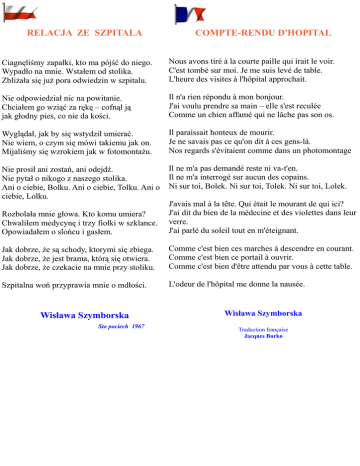 RELACJA ZE SZPITALA COMPTE-RENDU D'HOPITAL Ciagnęliśmy zapałki, kto ma pójść do niego. Wypadło na mnie. Wstałem od stolika. Zbliżała się już pora odwiedzin w szpitalu. Nous avons tiré à la courte paille qui irait le voir. C'est tombé sur moi. Je me suis levé de table. L'heure des visites à l'hôpital approchait. Nie odpowiedział nic na powitanie. Chciałem go wziąć za rękę – cofnął ją jak głodny pies, co nie da kości. Il n'a rien répondu à mon bonjour. J'ai voulu prendre sa main – elle s'est reculée Comme un chien affamé qui ne lâche pas son os. Wyglądał, jak by się wstydził umierać. Nie wiem, o czym się mówi takiemu jak on. Mijaliśmy się wzrokiem jak w fotomontażu. Il paraissait honteux de mourir. Je ne savais pas ce qu'on dit à ces gens-là. Nos regards s'évitaient comme dans un photomontage Nie prosił ani zostań, ani odejdź. Nie pytał o nikogo z naszego stolika. Ani o ciebie, Bolku. Ani o ciebie, Tolku. Ani o ciebie, Lolku. Il ne m'a pas demandé reste ni va-t'en. Il ne m'a interrogé sur aucun des copains. Ni sur toi, Bolek. Ni sur toi, Tolek. Ni sur toi, Lolek. Rozbolała mnie głowa. Kto komu umiera? Chwaliłem medycynę i trzy fiołki w szklance. Opowiadałem o slońcu i gasłem. J'avais mal à la tête. Qui était le mourant de qui ici? J'ai dit du bien de la médecine et des violettes dans leur verre. J'ai parlé du soleil tout en m'éteignant. Jak dobrze, że są schody, ktorymi się zbiega. Jak dobrze, że jest brama, którą się otwiera. Jak dobrze, że czekacie na mnie przy stoliku. Comme c'est bien ces marches à descendre en courant. Comme c'est bien ce portail à ouvrir. Comme c'est bien d'être attendu par vous à cette table. Szpitalna woń przyprawia mnie o mdłości. L'odeur de l'hôpital me donne la nausée. Wisława Szymborska Sto pociech 1967 Wisława Szymborska Traduction française Jacques Burko NIC DWA RAZY JAMAIS DEUX FOIS Nic dwa razy się nie zdarza i nie zdarzy. Z tej przyczyny zrodziliśmy się bez wprawy i pomrzemy bez rutyny. Jamais rien n'arrive deux fois, jamais rien ne se reproduit, nous sommes nés sans bon usage et sans routine mourrons surpris. Choćbyśmy uczniami byli najtępszymi w szkole świata, nic będziemy repetować żadnej zimy ani lata. Serions-nous cancres les plus sots à l'école de l'univers, jamais nous ne redoublerons aucun été aucun hiver. żaden dzień się nie powtórzy, nie ma dwóch podobnych nocy, dwóch tych samych pocałunków, dwóch jednakich spojrzeń w oczy. Pas un des jours ne se répète pas une nuit pareille à l'autre, ni deux baisers tout identiques, ni deux regards de l'un à l'autre. Wczoraj, kiedy twoje imię ktoś wymówił przy mnie glośno, tak mi bylo, jakby róża przez otwarte wpadła okno. Hier quand j'entendis quelqu'un dire ton nom à haute voix, ce fut pour moi comme une rose par la croisée tombant sur moi. Dziś, kiedy jesteśmy razem, odwróciłam twarz ku ścianie. Róża? Jak wygląda róża? Czy to kwiat a może kamień? Aujourd'hui nous étions deux, mais j'ai collé ma face au mur. Rose? A quoi ressemble une rose? Est-ce une fleur ou une pierre dure? Czemu ty się, zła godzino, z niepotrzebnym mieszasz lękiem? Jesteś – a więc musisz minąć. Miniesz – a więc to jest piękne. Et pourquoi donc, heure mauvaise, à ces peurs vaines te mèles-tu? Tu es là et dois passer, ce sera beau de n'être plus. Uśmiechnięci, współobjęci spróbujemy szukać zgody, choć różnimy się od siebie jak dwie krople czystej wody. Dans nos sourires enlacés, nous cherchons une entente sûre, malgré nos grandes différences ainsi que deux gouttes d'eau pure. Wisława Szymborska 1957 Wisława Szymborska