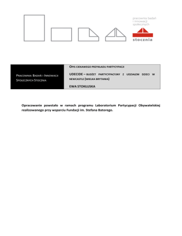 OPIS CIEKAWEGO PRZYKŁADU PARTYCYPACJI PRACOWNIA BADAŃ I INNOWACJI SPOŁECZNYCH STOCZNIA UDECIDE – BUDŻET PARTYCYPACYJNY NEWCASTLE (WIELKA BRYTANIA) Z UDZIAŁEM DZIECI W EWA STOKŁUSKA Opracowanie powstało w ramach programu Laboratorium Partycypacji Obywatelskiej realizowanego przy wsparciu Fundacji im. Stefana Batorego. W SKRÓCIE Organizator: Rada Miasta Newcastle, Zespół Praw Dzieci (Childrens’ Rights Team) Czas trwania: kwiecień - maj2008r. (łącznie 6 tygodni) Co się działo: Dzieci w wieku 8-13 lat zostały zaproszone do decydowania o wydatkowaniu 2,25 miliona funtów ze środków Funduszu na Rzecz Dzieci miasta Newscastle (Children’s Fund). W tym procesie najmłodsi obywatele nie proponowali sami projektów, ale dyskutowali i głosowali nad projektami proponowanymi przez miejskie instytucje i organizacje pozarządowe. Metoda: budżet partycypacyjny – warsztaty, spotkanie opiniujące, głosowanie Przydatna do: włączania najmłodszych obywateli w podejmowanie decyzji o alokacji środków finansowych na projekty skierowane do ich grupy Kontakt: Nick Brereton, [email protected], +44 191 277 3073 HISTORIA Pierwsze działania pod szyldem UDecide (ang. Ty Decydujesz) były elementem pilotażowego programu strategicznego rządu Wielkiej Brytanii w zakresie budżetowania partycypacyjnego w gminach, uruchomionego w 2006r. Do tej pory wzięło w nim udział ponad 150 wspólnot lokalnych z terenu całej Wielkiej Brytanii. W roku 2006 samorząd miasta Newcastle otrzymał kwotę £280,000 ze środków Funduszu Odnowy Sąsiedztw (Neighbourhood Renewal Fund, NRF) na realizację pilotażu budżetu partycypacyjnego. Wykorzystano je na realizację działań na różnych odcinkach – m.in. w obszarze tworzenia budżetów wspólnot lokalnych, wyboru zadań z zakresu przeciwdziałania przestępczości i ochrony środowiska. £120,000 z tej ogólnej sumy miało być przeznaczone na włączenie w decydowanie o wydatkach budżetowych dzieci i młodzieży do lat 19. Pod szyldem UDecide zaanimowano serię wydarzeń (spotkań, warsztatów, głosowań), w ramach 2 których ponad 300 młodych ludzi miało okazję wypowiedzieć się na temat projektów, które chcieliby, by samorząd wcielił w życie. Wśród projektów wytypowanych do realizacji przez samą młodzież, a następnie zatwierdzonych do finansowania przez Radę Miasta, znalazły się m.in. wyposażenie dla zespołu samby ze szkoły specjalnej i młodzieżowego klubu bokserskiego, budowa placów ze sprzętem do ćwiczeń przy szkołach – do użytku uczniów i członków społeczności lokalnych, a także wydanie publikacji o dorastaniu w Newcastle, przygotowanej przez grupę dzieci z mniejszości muzułmańskiej. Co ciekawe, projektami, które zyskiwały największe wsparcie młodych decydentów w procesie głosowania były te, które w największym stopniu odpowiadały na potrzeby grup wykluczonych i nieuprzywilejowanych. Miasto Newcastle już wcześniej podejmowało działania zmierzające do aktywizacji obywatelskiej dzieci i młodzieży i lepszego rozpoznania ich potrzeb. W listopadzie 2005r. Strategiczne Partnerstwo na Rzecz Dzieci i Młodzieży Newcastle (Newcastle Children and Young People’s Strategic Partnership) przygotowało i przedłożyło Radzie Miasta dokument pt. „Na czym nam zależy. Priorytety dzieci i młodzieży dla Newcastle” (What matter to us. Children and young people’s priorities for Newcastle), podsumowujący konsultacje z tą grupą, w których wzięło udział ponad 2000 młodych mieszkańców Newcastle i na podstawie których zdiagnozowano potrzeby i wyznaczono najważniejsze obszary działania dla instytucji miejskich pracujących ich na rzecz. W 2006r. przeprowadzono pilotażowy projekt budżetowania z zaangażowaniem dzieci i młodzieży, w trakcie którego decydowali oni o rozdysponowaniu £30,000 na projekty aktywizacyjne. PRZEBIEG W 2008 roku Rada Trustu na Rzecz Dzieci miasta Newcastle (Newcastle Children’s Trust), organu strategicznego skupiającego przedstawicieli władz lokalnych oraz organizacji i instytucji działających na rzecz dzieci, poddała pod decyzję młodych ludzi £2,25 miliona środków z rządowego Funduszu na Rzecz Dzieci – przeznaczone na działania zorientowane na podnoszenie własnej wartości u dzieci, zwiększanie obecności w szkole oraz przeciwdziałanie przestępczości. Działania były skierowane do dzieci w wieku od 8 do 13 lat. Założeniami projektu było zaangażowanie do udziału w nim możliwie dużej grupy dzieci, włączenie tych dzieci, które będą faktycznie korzystać z funduszy, o których decydowano oraz danie im realnej władzy decyzyjnej. Prace w projekcie koordynował Zespół Praw Dzieci (Children’s Rights Team) przy Radzie Miasta Newcastle, a jego partnerami w procesie były szkoły podstawowe ze wszystkich dzielnic miasta oraz instytucje i organizacje pracujące z dziećmi (łącznie 39). Każdy partner wspierał grupę młodych ludzi ze swojej instytucji w uczestnictwie w projekcie, współpracując 3 z Zespołem. Prace w poszczególnych obszarach miasta koordynowali przydzieleni do nich menadżerowie działań lokalnych.1 2 Członkowie UDecide Crew Na początku procesu z dzieci zaangażowanych wcześniej w projekt animacyjny Dzieci Mają Głos (Children’s Society’s 3 Voices) wyłoniono Dziecięcą Grupę Sterującą - ‘UDecide Crew’, która współpracowała z zespołem urzędników przy opracowywaniu kolejnych działań w procesie, np. konsultując ich pomysły na wydarzenia i spotkania, oceniając na ile mogą być atrakcyjne dla ich rówieśników. Uczniowie w trakcie warsztatu w szkole Działania realizowane były w trzech rundach. W pierwszej, członkowie Zespołu, przy wsparciu przedstawicieli poszczególnych instytucji partnerskich (nauczycieli, pracowników socjalnych itd.) prowadzili warsztaty wprowadzające z uczniami w szkołach. Ze względu na obszar tematyczny, którego dotyczyć miały projekty objęte bu