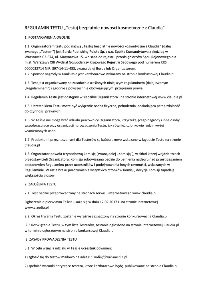 REGULAMIN TESTU „Testuj bezpłatnie nowości kosmetyczne z Claudią” 1. POSTANOWIENIA OGÓLNE 1.1. Organizatorem testu pod nazwą „Testuj bezpłatnie nowości kosmetyczne z Claudią” (dalej zwanego „Testem”) jest Burda Publishing Polska Sp. z o.o. Spółka Komandytowa z siedzibą w Warszawie 02-674, ul. Marynarska 15, wpisana do rejestru przedsiębiorców Sądu Rejonowego dla m.st. Warszawy XIII Wydział Gospodarczy Krajowego Rejestru Sądowego pod numerem KRS 0000032714 NIP: 897-14-11-483, zwana dalej Burda lub Organizatorem. 1.2. Sponsor nagrody w Konkursie jest każdorazowo wskazany na stronie konkursowej Claudia.pl 1.3. Test jest organizowany na zasadach określonych niniejszym regulaminem (dalej zwanym „Regulaminem”) i zgodnie z powszechnie obowiązującymi przepisami prawa. 1.4. Regulamin Testu jest dostępny w siedzibie Organizatora i na stronie internetowej www.claudia.pl 1.5. Uczestnikiem Testu może być wyłącznie osoba fizyczna, pełnoletnia, posiadająca pełną zdolność do czynności prawnych. 1.6. W Teście nie mogą brać udziału pracownicy Organizatora, Przyrzekającego nagrody i inne osoby współpracujące przy organizacji i prowadzeniu Testu, jak również członkowie rodzin wyżej wymienionych osób. 1.7. Produktami przeznaczonymi dla Testerów są każdorazowo wskazane w layoucie Testu na stronie Claudia.pl 1.8. Organizator powoła trzyosobową komisję (zwaną dalej „Komisją”), w skład której wejdzie trzech przedstawicieli Organizatora. Komisja zobowiązana będzie do pełnienia nadzoru nad przestrzeganiem postanowień Regulaminu przez uczestników i podejmowania innych czynności, wskazanych w Regulaminie. W razie braku porozumienia wszystkich członków Komisji, decyzje Komisji zapadają większością głosów. 2. ZAŁOŻENIA TESTU 2.1. Test będzie przeprowadzony na stronach serwisu internetowego www.claudia.pl. Ogłoszenie o pierwszym Teście ukaże się w dniu 17.02.2017 r. na stronie internetowej www.claudia.pl 2.2. Okres trwania Testu zostanie wyraźnie zaznaczony na stronie konkursowej na Claudia.pl 2.3 Rozwiązanie Testu, w tym lista Testerów, zostanie ogłoszone na stronie internetowej Claudia.pl w terminie ogłoszonym na stronie konkursowej Claudia.pl 3. ZASADY PROWADZENIA TESTU 3.1. W celu wzięcia udziału w Teście uczestnik powinien: 1) zgłosić się do testów mailowo na adres: [email protected] 2) spełniać warunki dotyczące testera, które każdorazowo będę publikowane na stronie Claudia.pl 3.2. Jeden uczestnik może wziąć udział w Teście tylko jeden raz. 3.3. Ilość osób biorących udział w teście będzie każdorazowo określona na stronie informującej o Teście na Claudia.pl 3.4. Testerzy otrzymają prywatną wiadomość na skrzynkę pocztową, z której wysłali zgłoszenie do Testów z informacją o przyznaniu produktów i instrukcją dotyczącą dalszych etapów testowania. 3.5. Testerzy, którzy potwierdzili swój udział w teście zobowiązują się do przygotowania krótkiej opinii na temat produktu i na zakończenie testowania zobowiązują się do udzielenie możliwie wyczerpujących odpowiedzi na pytania każdorazowo zawarte w layouciue informującym o teście. 3.6. W przypadku, jeżeli opinia o produkcie stanowi utwór, w rozumieniu ustawy z dnia 4 lutego 1994 r. o prawie autorskim i prawach pokrewnych, Testerzy niniejszym udzielają Organizatorowi oraz sponsorowi nagrody niewyłącznej, nieodpłatnej licencji do przesłanej opinii, zwanej dalej „Utworem”, bez ograniczeń czasowych lub terytorialnych, wraz z prawem do sublicencji na rzecz osób trzecich, na następujących polach eksploatacji: 1) zwielokrotnianie określoną techniką egzemplarzy Utworu, w tym techniką drukarską, reprograficzną, zapisu magnetycznego oraz techniką cyfrową; 2) wprowadzanie do obrotu, użyczenie lub najem oryginału albo egzemplarzy Utworu; 3) publiczne wykonanie, wystawienie, wyświetlenie, odtworzenie oraz nadawanie i reemitowanie, jak również publiczne udostępnianie Utworu w taki sposób, aby każdy mógł mieć do niego dostęp w miejscu i w czasie przez siebie wybranym; 4) wykorzystanie Utworu i jego fragmentów dla potrzeb prowadzenia promocji i reklamy Organizatora oraz Przyrzekającego nagrody i produktów Organizatora oraz Przyrzekającego nagrody, we wszelkich formach reklamowych, w tym: w formie reklamy prasowej, telewizyjnej, kinowej, zewnętrznej i internetowej, na dowolnych stronach i domenach internetowych i w serwisach mobilnych, w materiałach i gadżetach 3 promocyjnoreklamowych, i innych formach promocji na polach eksploatacji wskazanych w pkt. 1 do 5; 5) wykonywanie autorskiego prawa zależnego do Utworu (rozporządzanie i korzystanie z opracowania Utworu) wraz z prawem do zezwalania na wykonywanie zależnego prawa autorskiego do Utworu, na wskazanych w pkt. 1 do 4 polach eksploatacji. 3.7. W przypadku, jeżeli opinia stanowi utwór, w rozumieniu ustawy z dnia 4 lutego 1994 r. o prawie autorskim i prawach pokrewnych, Tester niniejszym upoważnia Organizatora oraz Sponsora nagrody do wykonywania w jego imieniu następujących autorskich praw osobistych w stosunku do opinii: prawa do nieoznaczania imieniem i nazwiskiem lub pseudonimem autora; prawa decydowania o pierwszym udostępnieniu publiczności (jeśli ma zastosowanie). 3.8. W przypadku, jeżeli opinia określona w pkt 3.8. stanowi utwór, w rozumieniu ustawy z dnia 4 lutego 1994 r. o prawie autorskim i prawach pokrewnych, Tester, na zasadzie art. 921 § 3 Kodeksu cywilnego, z chwilą wydania Testerowi produktu, przenosi na Organizatora oraz Przyrzekającego nagrody całość wyłącznych i nieorganicznych autorskich praw majątkowych do opinii, na wszystkich znanych w chwili przeniesienia praw polach eksploatacji, w szczególności na polach eksploatacji wymienionych w pkt 3.5 ppkt 1) do 5) powyżej. Jednocześnie Tester oświadcza, że nie zachowuje prawa zezwalania na wykonywanie zależnego prawa autorskiego do opinii. 3.9. 