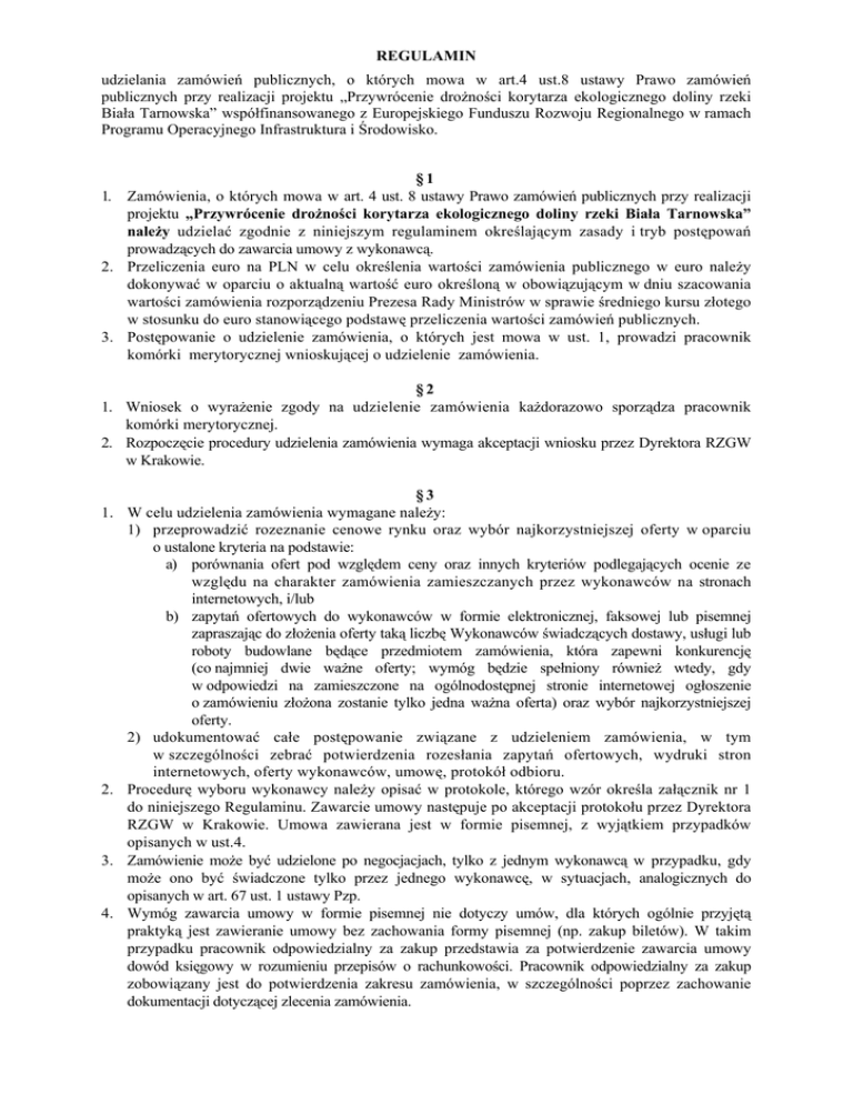 REGULAMIN udzielania zamówień publicznych, o których mowa w art.4 ust.8 ustawy Prawo zamówień publicznych przy realizacji projektu „Przywrócenie drożności korytarza ekologicznego doliny rzeki Biała Tarnowska” współfinansowanego z Europejskiego Funduszu Rozwoju Regionalnego w ramach Programu Operacyjnego Infrastruktura i Środowisko. §1 1. Zamówienia, o których mowa w art. 4 ust. 8 ustawy Prawo zamówień publicznych przy realizacji projektu „Przywrócenie drożności korytarza ekologicznego doliny rzeki Biała Tarnowska” należy udzielać zgodnie z niniejszym regulaminem określającym zasady i tryb postępowań prowadzących do zawarcia umowy z wykonawcą. 2. Przeliczenia euro na PLN w celu określenia wartości zamówienia publicznego w euro należy dokonywać w oparciu o aktualną wartość euro określoną w obowiązującym w dniu szacowania wartości zamówienia rozporządzeniu Prezesa Rady Ministrów w sprawie średniego kursu złotego w stosunku do euro stanowiącego podstawę przeliczenia wartości zamówień publicznych. 3. Postępowanie o udzielenie zamówienia, o których jest mowa w ust. 1, prowadzi pracownik komórki merytorycznej wnioskującej o udzielenie zamówienia. §2 1. Wniosek o wyrażenie zgody na udzielenie zamówienia każdorazowo sporządza pracownik komórki merytorycznej. 2. Rozpoczęcie procedury udzielenia zamówienia wymaga akceptacji wniosku przez Dyrektora RZGW w Krakowie. §3 1. W celu udzielenia zamówienia wymagane należy: 1) przeprowadzić rozeznanie cenowe rynku oraz wybór najkorzystniejszej oferty w oparciu o ustalone kryteria na podstawie: a) porównania ofert pod względem ceny oraz innych kryteriów podlegających ocenie ze względu na charakter zamówienia zamieszczanych przez wykonawców na stronach internetowych, i/lub b) zapytań ofertowych do wykonawców w formie elektronicznej, faksowej lub pisemnej zapraszając do złożenia oferty taką liczbę Wykonawców świadczących dostawy, usługi lub roboty budowlane będące przedmiotem zamówienia, która zapewni konkurencję (co najmniej dwie ważne oferty; wymóg będzie spełniony również wtedy, gdy w odpowiedzi na zamieszczone na ogólnodostępnej stronie internetowej ogłoszenie o zamówieniu złożona zostanie tylko jedna ważna oferta) oraz wybór najkorzystniejszej oferty. 2) udokumentować całe postępowanie związane z udzieleniem zamówienia, w tym w szczególności zebrać potwierdzenia rozesłania zapytań ofertowych, wydruki stron internetowych, oferty wykonawców, umowę, protokół odbioru. 2. Procedurę wyboru wykonawcy należy opisać w protokole, którego wzór określa załącznik nr 1 do niniejszego Regulaminu. Zawarcie umowy następuje po akceptacji protokołu przez Dyrektora RZGW w Krakowie. Umowa zawierana jest w formie pisemnej, z wyjątkiem przypadków opisanych w ust.4. 3. Zamówienie może być udzielone po negocjacjach, tylko z jednym wykonawcą w przypadku, gdy może ono być świadczone tylko przez jednego wykonawcę, w sytuacjach, analogicznych do opisanych w art. 67 ust. 1 ustawy Pzp. 4. Wymóg zawarcia umowy w formie pisemnej nie dotyczy umów, dla których ogólnie przyjętą praktyką jest zawieranie umowy bez zachowania formy pisemnej (np. zakup biletów). W takim przypadku pracownik odpowiedzialny za zakup przedstawia za potwierdzenie zawarcia umowy dowód księgowy w rozumieniu przepisów o rachunkowości. Pracownik odpowiedzialny za zakup zobowiązany jest do potwierdzenia zakresu zamówienia, w szczególności poprzez zachowanie dokumentacji dotyczącej zlecenia zamówienia.