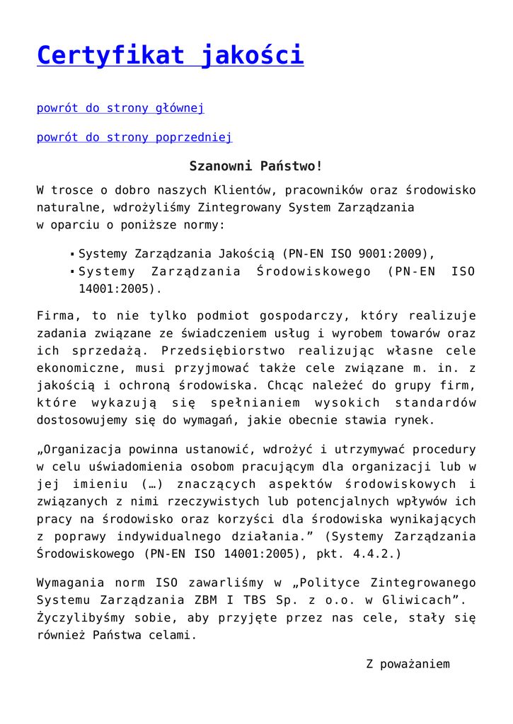 Certyfikat jakości powrót do strony głównej powrót do strony poprzedniej Szanowni Państwo! W trosce o dobro naszych Klientów, pracowników oraz środowisko naturalne, wdrożyliśmy Zintegrowany System Zarządzania w oparciu o poniższe normy: Systemy Zarządzania Jakością (PN-EN ISO 9001:2009), Systemy Zarządzania Środowiskowego (PN-EN ISO 14001:2005). Firma, to nie tylko podmiot gospodarczy, który realizuje zadania związane ze świadczeniem usług i wyrobem towarów oraz ich sprzedażą. Przedsiębiorstwo realizując własne cele ekonomiczne, musi przyjmować także cele związane m. in. z jakością i ochroną środowiska. Chcąc należeć do grupy firm, które wykazują się spełnianiem wysokich standardów dostosowujemy się do wymagań, jakie obecnie stawia rynek. „Organizacja powinna ustanowić, wdrożyć i utrzymywać procedury w celu uświadomienia osobom pracującym dla organizacji lub w jej imieniu (…) znaczących aspektów środowiskowych i związanych z nimi rzeczywistych lub potencjalnych wpływów ich pracy na środowisko oraz korzyści dla środowiska wynikających z poprawy indywidualnego działania.” (Systemy Zarządzania Środowiskowego (PN-EN ISO 14001:2005), pkt. 4.4.2.) Wymagania norm ISO zawarliśmy w „Polityce Zintegrowanego Systemu Zarządzania ZBM I TBS Sp. z o.o. w Gliwicach”. Życzylibyśmy sobie, aby przyjęte przez nas cele, stały się również Państwa celami. Z poważaniem Prezes ZBM I TBS Sp. z o.o. Certyfikat Systemu Zarządzania Jakością zgodnego z wymaganiami normy PN-EN ISO 9001:2009 Certyfikat Systemu Zarządzania Środowiskowego zgodnego z wymaganiami normy PN-EN ISO 14001:2005