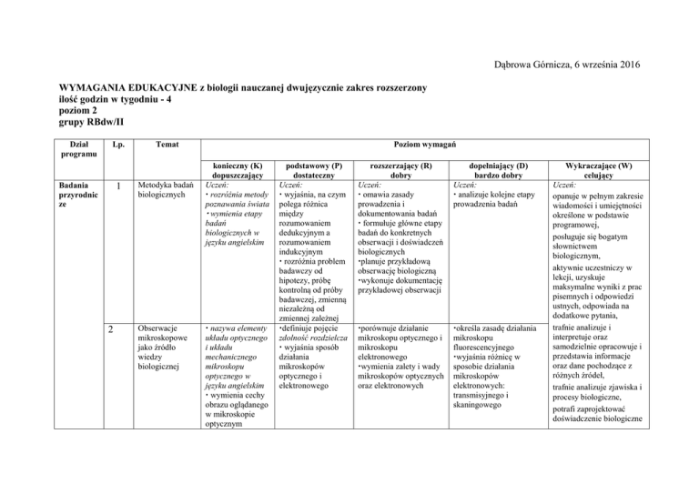 Dąbrowa Górnicza, 6 września 2016 WYMAGANIA EDUKACYJNE z biologii nauczanej dwujęzycznie zakres rozszerzony ilość godzin w tygodniu - 4 poziom 2 grupy RBdw/II Dział programu Lp. Badania przyrodnic ze 1 2 Poziom wymagań Temat Metodyka badań biologicznych Obserwacje mikroskopowe jako źródło wiedzy biologicznej konieczny (K) dopuszczający Uczeń: rozróżnia metody poznawania świata wymienia etapy badań biologicznych w języku angielskim nazywa elementy układu optycznego i układu mechanicznego mikroskopu optycznego w języku angielskim wymienia cechy obrazu oglądanego w mikroskopie optycznym podstawowy (P) dostateczny Uczeń: wyjaśnia, na czym polega różnica między rozumowaniem dedukcyjnym a rozumowaniem indukcyjnym rozróżnia problem badawczy od hipotezy, próbę kontrolną od próby badawczej, zmienną niezależną od zmiennej zależnej definiuje pojęcie zdolność rozdzielcza wyjaśnia sposób działania mikroskopów optycznego i elektronowego rozszerzający (R) dobry Uczeń: omawia zasady prowadzenia i dokumentowania badań formułuje główne etapy badań do konkretnych obserwacji i doświadczeń biologicznych planuje przykładową obserwację biologiczną wykonuje dokumentację przykładowej obserwacji dopełniający (D) bardzo dobry Uczeń: analizuje kolejne etapy prowadzenia badań porównuje działanie mikroskopu optycznego i mikroskopu elektronowego wymienia zalety i wady mikroskopów optycznych oraz elektronowych określa zasadę działania mikroskopu fluorescencyjnego wyjaśnia różnicę w sposobie działania mikroskopów elektronowych: transmisyjnego i skaningowego Wykraczające (W) celujący Uczeń: opanuje w pełnym zakresie wiadomości i umiejętności określone w podstawie programowej, posługuje się bogatym słownictwem biologicznym, aktywnie uczestniczy w lekcji, uzyskuje maksymalne wyniki z prac pisemnych i odpowiedzi ustnych, odpowiada na dodatkowe pytania, trafnie analizuje i interpretuje oraz samodzielnie opracowuje i przedstawia informacje oraz dane pochodzące z różnych źródeł, trafnie analizuje zjawiska i procesy biologiczne, potrafi zaprojektować doświadczenie biologiczne Chemiczne podstawy życia Składniki nieorganiczne organizmów klasyfikuje związki chemiczne na organiczne i nieorganiczne wymienia związki budujące organizm klasyfikuje pierwiastki na makroelementy i mikroelementy wymienia pierwiastki biogenne nazywa wiązania i oddziaływania chemiczne w języku angielskim wymienia funkcje wody wymienia funkcje soli mineralnych omawia znaczenie wybranych makro- i mikroelementów określa znaczenie i występowanie wybranych typów wiązań i oddziaływań chemicznych omawia budowę cząsteczki wody określa objawy niedoboru wybranych makro- i mikroelementów charakteryzuje budowę różnych typów wiązań chemicznych charakteryzuje właściwości fizykochemiczne wody uzasadnia znaczenie soli mineralnych dla organizmów rysuje modele różnych typów wiązań chemicznych wykazuje związek między budową cząsteczki wody i właściwościami a jej rolą w organizmie 2 Budowa i znaczenie węglowodanów wymienia cechy i funkcje głównych grup węglowodanów klasyfikuje sacharydy i podaje przykłady wymienia właściwości mono, oligo- i polisacharydów klasyfikuje monosacharydy charakteryzuje i porównuje budowę wybranych polisacharydów porównuje budowę chemiczną mono-, oligoi polisacharydów planuje doświadczenie mające na celu wykrycie glukozy omawia powstawanie form pierścieniowych monosacharydów ilustruje powstawanie wiązania Oglikozydowego zapisuje wzory wybranych węglowodanów 3 Lipidy – budowa wymienia określa kryterium klasyfikacji sacharydów wyjaśnia, w jaki sposób powstaje wiązanie Oglikozydowe omawia występowanie i znaczenie wybranych mono-, oligo- i polisacharydów wyjaśnia, na czym wymienia kryteria porównuje poszczególne 1 i zinterpretować jego wyniki, formułuje problemy i rozwiązuje je w sposób twórczy, trafnie dobierając liczne przykłady i znaczenie funkcje lipidów klasyfikuje lipidy ze względu na budowę cząsteczki omawia znaczenie poszczególnych grup lipidów polega różnica między tłuszczami nasyconymi a tłuszczami nienasyconymi klasyfikacji tłuszczowców charakteryzuje budowę lipidów prostych, złożonych i izoprenowych uzasadnia znaczenie cholesterolu planuje doświadczenie, którego celem jest wykrycie lipidów grupy lipidów omawia budowę fosfolipidów i ich rozmieszczenie w błonie biologicznej analizuje budowę triglicerydu 4 Białka – główny budulec organizmu podaje kryteria klasyfikacji białek wskazuje wiązanie peptydowe wyjaśnia, na czym polega i w jakich warunkach zachodzi koagulacja i denaturacja białek charakteryzuje grupy białek ze względu na pełnione funkcje, liczbę aminokwasów w łańcuchu i strukturę oraz obecność elementów nieaminokwasowych zapisuje wzór ogólny aminokwasów zapisuje reakcję powstawania dipeptydu charakteryzuje strukturę 1-, 2-, 3- i 4-rzędową białek analizuje budowę aminokwasów klasyfikuje aminokwasy ze względu na charakter podstawników porównuje białka fibrylarne i globularne porównuje proces koagulacji i denaturacji białek planuje doświadczenie mające na celu wykrycie wiązań peptydowych 5 Budowa i rola kwasów nukleinowych nazywa grypy białek ze względu na pełnione funkcje, liczbę aminokwasów w łańcuchu strukturę oraz obecność elementów nieaminokwasowyc h w języku angielskim wymienia przykładowe białka i ich funkcje omawia budowę białek rozpoznaje struktury przestrzenne białek wymienia właściwości białek charakteryzuje budowę pojedynczego nukleotydu DNA i RNA omawia rolę wyjaśnia, na czym polega komplementarność zasad definiuje pojęcia: podwójna helisa, charakteryzuje budowę chemiczną i przestrzenną cząsteczki DNA i RNA porównuje budowę i rolę DNA z budową i rolą RNA rozróżnia zasady azotowe nazywa i wskazuje wiązania w cząsteczce DNA Komórka – podstawow 