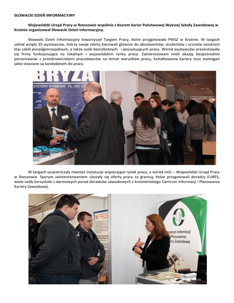 SŁOWACKI DZIEŃ INFORMACYJNY Wojewódzki Urząd Pracy w Rzeszowie wspólnie z biurem karier Państwowej Wyższej Szkoły Zawodowej w Krośnie organizował Słowacki Dzień Informacyjny. Słowacki Dzień Informacyjny towarzyszył Targom Pracy, które przygotowała PWSZ w Krośnie. W targach udział wzięło 35 wystawców, którzy swoje oferty kierowali głównie do absolwentów, studentów i uczniów ostatnich klas szkół ponadgimnazjalnych, a także osób bezrobotnych i poszukujących pracy. Wśród wystawców prezentowały się firmy funkcjonujące na lokalnym i wojewódzkim rynku pracy. Zainteresowani mieli okazję bezpośrednio porozmawiać z przedstawicielami pracodawców na temat warunków pracy, kształtowania kariery oraz wymagań jakie stawiane są kandydatom do pracy. W targach uczestniczyły również instytucje wspierające rynek pracy, a wśród nich – Wojewódzki Urząd Pracy w Rzeszowie. Sporym zainteresowaniem cieszyły się oferty pracy za granicą, które przygotowali doradcy EURES, wiele osób korzystało z darmowych porad doradców zawodowych z krośnieńskiego Centrum Informacji i Planowania Kariery Zawodowej. Zainteresowaniem cieszył się również Słowacki Dzień Informacyjny. - Dzięki współpracy służb zatrudniania województwa podkarpackiego i Preszowskiego Kraju, która polega między innymi na wymianie i upowszechnianiu informacji na temat rynków pracy dziś możemy gościć doradców EURES z Humennego i Michalowiec . Wierzę, że ta wizyta będzie owocna dla wszystkich, którzy decydują się na zatrudnienie w rejonach przygranicznych – zaznaczył podczas otwarcia targów Tadeusz Gospodarczyk, wicedyrektor ds. Rynku Pracy Wojewódzkiego Urzędu Pracy w Rzeszowie. Jakie wymagania stawiają słowaccy przedsiębiorcy? Jak kształtuje się rynek pracy naszych sąsiadów – na te i wiele innych pytań dotyczących zatrudniania, odbywania praktyk oraz staży w rejonach przygranicznych odpowiedzi udzielali słowaccy doradcy EURES. – Takie spotkania są bardzo ważne szczególnie dla osób, które zamieszkują tereny przygraniczne – mówiła Mirosława Hilovska, doradca EURES z Humennego. - Wiele osób zainteresowanych było prowadzeniem własnej działalności gospodarczej na terenie Słowacji, ale też pytało o warunki życia i pracy w naszym kraju. Dla uatrakcyjnienia targów Biuro Karier zorganizowało dla młodych ludzi losowania ciekawych i wartościowych nagród.