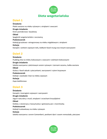 Dieta wegetariańska Dzień 1 Śniadanie Płatki owsiane na mleku ryżowym z otrębami i owocami Drugie śniadanie Krem pomidorowo- bazyliowy Obiad Spaghetti wegetariańskie z soczewicą Podwieczorek Koktajl gruszkowo- winogronowy na mleku migdałowym z otrębami Kolacja Kanapki z serkiem sojowym tofu, kiełkami fasoli mung oraz innymi warzywami Dzień 2 Śniadanie Pudding chia na mleku kokosowym z owocami i wiórkami kokosowymi Drugie śniadanie Sałatka warzywna z pleśniowym serem ryżowym i ziarnami sezamu, bułka owsiana Obiad Gulasz z fasoli adzuki z pieczarkami, warzywami i ryżem brązowym Podwieczorek Koktajl z awokado i kiwi na mleku sojowym Kolacja Zupa kalafiorowa Dzień 3 Śniadanie Kanapki z twarogiem sojowym i warzywami Drugie śniadanie Jogurt naturalny z musli, otrębami i orzechami brazylijskimi Obiad Kotlety z ciecierzycy z kaszą kuskus i gotowany por z marchewką Podwieczorek Koktajl truskawkowy na mleku ryżowym Kolacja Sałatka warzywna z serem Camembert, pestkami dyni i sosem remoulade, pieczywo Dzień 4 Śniadanie Kasza jaglana z owocami i orzechami Drugie śniadanie Sałatka warzywna z serem Lazur i pestkami dyni, pieczywo Obiad Kotleciki z czerwonej fasoli z dodatkiem pieczarek i rukoli, pieczone ziemniaki i surówka Podwieczorek Koktajl borówkowy na mleku migdałowym z płatkami migdałów Kolacja Zupa ogórkowa na wywarze warzywnym, pieczywo Dzień 5 Śniadanie Sałatka warzywna z fasolą mung, pieczywo Drugie śniadanie Sałatka owocowa Obiad Wegetariańskie gołąbki z jarmużem w sosie pomidorowym, kasza jaglana i starte buraki Podwieczorek Koktajl ananasowy z jagodami goji Kolacja Spaghetti szpinakowe