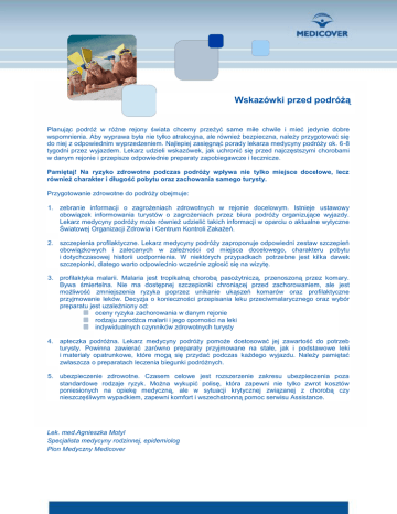 Wskazówki przed podróżą Planując podróż w różne rejony świata chcemy przeżyć same miłe chwile i mieć jedynie dobre wspomnienia. Aby wyprawa była nie tylko atrakcyjna, ale również bezpieczna, należy przygotować się do niej z odpowiednim wyprzedzeniem. Najlepiej zasięgnąć porady lekarza medycyny podróży ok. 6-8 tygodni przez wyjazdem. Lekarz udzieli wskazówek, jak uchronić się przed najczęstszymi chorobami w danym rejonie i przepisze odpowiednie preparaty zapobiegawcze i lecznicze. Pamiętaj! Na ryzyko zdrowotne podczas podróży wpływa nie tylko miejsce docelowe, lecz również charakter i długość pobytu oraz zachowania samego turysty. Przygotowanie zdrowotne do podróży obejmuje: 1. zebranie informacji o zagrożeniach zdrowotnych w rejonie docelowym. Istnieje ustawowy obowiązek informowania turystów o zagrożeniach przez biura podróży organizujące wyjazdy. Lekarz medycyny podróży może również udzielić takich informacji w oparciu o aktualne wytyczne Światowej Organizacji Zdrowia i Centrum Kontroli Zakażeń. 2. szczepienia profilaktyczne. Lekarz medycyny podróży zaproponuje odpowiedni zestaw szczepień obowiązkowych i zalecanych w zależności od miejsca docelowego, charakteru pobytu i dotychczasowej historii uodpornienia. W niektórych przypadkach potrzebne jest kilka dawek szczepionki, dlatego warto odpowiednio wcześnie zgłosić się na wizytę. 3. profilaktyka malarii. Malaria jest tropikalną chorobą pasożytniczą, przenoszoną przez komary. Bywa śmiertelna. Nie ma dostępnej szczepionki chroniącej przed zachorowaniem, ale jest możliwość zmniejszenia ryzyka poprzez unikanie ukąszeń komarów oraz profilaktyczne przyjmowanie leków. Decyzja o konieczności przepisania leku przeciwmalarycznego oraz wybór preparatu jest uzależniony od: oceny ryzyka zachorowania w danym rejonie rodzaju zarodźca malarii i jego oporności na leki indywidualnych czynników zdrowotnych turysty 4. apteczka podróżna. Lekarz medycyny podróży pomoże dostosować jej zawartość do potrzeb turysty. Powinna zawierać zarówno preparaty przyjmowane na stałe, jak i podstawowe leki i materiały opatrunkowe, które mogą się przydać podczas każdego wyjazdu. Należy pamiętać zwłaszcza o preparatach leczenia biegunki podróżnych. 5. ubezpieczenie zdrowotne. Czasem celowe jest rozszerzenie zakresu ubezpieczenia poza standardowe rodzaje ryzyk. Można wykupić polisę, która zapewni nie tylko zwrot kosztów poniesionych na opiekę medyczną, ale w sytuacji krytycznej związanej z chorobą czy nieszczęśliwym wypadkiem, zapewni komfort i wszechstronną pomoc serwisu Assistance. Lek. med.Agnieszka Motyl Specjalista medycyny rodzinnej, epidemiolog Pion Medyczny Medicover