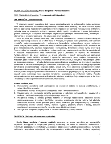 Praca Socjalna i Pomoc Rodzinie CZAS TRWANIA (ilość godzin)