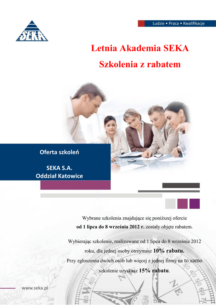 Letnia Akademia SEKA Szkolenia z rabatem Oferta szkoleń SEKA S.A. Oddział Katowice Wybrane szkolenia znajdujące się poniŜszej ofercie od 1 lipca do 8 września 2012 r. zostały objęte rabatem. Wybierając szkolenie, realizowane od 1 lipca do 8 września 2012 roku, dla jednej osoby otrzymasz 10% rabatu. Przy zgłoszeniu dwóch osób lub więcej z jednej firmy na to samo szkolenie uzyskasz 15% rabatu. Letnia Akademia SEKA PRAWO PRACY I UBEZPIECZENIA SPOŁECZNE Oferta szkoleń OCHRONA DANYCH OSOBOWYCH PRACOWNIKÓW I MONITORING W ŚRODOWISKU PRACY Termin: 27.07.2012 Koszt: 330 zł – 10% upust w tym materiały szkoleniowe REKRUTACJA I SELEKCJA Termin: 26-27.07.2012 Koszt: 340 zł – 10% upust w tym materiały szkoleniowe oraz lunch ODPOWIEDZIALNOŚC HR MENAGERA – WYBRANE ASPEKTY PRAKTYCZNE Termin: 10.08.2012 Koszt: 300 zł – 10% upust w tym materiały szkoleniowe oraz lunch ZARZĄDZANIE ZESPOŁEM – OD REKRUTACJI DO ZWOLNIEŃ Termin: 23-24.08.2012 Koszt: 330 zł – 10% upust w tym materiały szkoleniowe OCHRONA ŚRODOWISKA ZAGADNIENIA I PROBLEMY Z ZAKRESU GOSPODARKI ODPADAMI W PRZEDSIĘBIORSTWIE Termin: 05.09.2012 Koszt: 270 zł – 10% upust w tym materiały szkoleniowe INDYWIDUALNE WARSZTATY Z ZAKRESU OCHRONY ŚRODOWISKA Termin: 07.08.2012 Koszt: 450 zł – 10% upust w tym materiały szkoleniowe SZKOLENIA ZAWODOWE KOSZTORYSOWANIE ROBÓT BUDOWLANYCH Termin: 03-05.09.2012 Koszt: 600 zł – 10% upust w tym materiały szkoleniowe PIERWSZA POMOC PIERWSZA POMOC DLA RODZICÓW I OPIEKUNÓW DZIECI Termin: 17.08.2012 Koszt: 90 zł – 10% upust Kalendarium szkoleń otwartych VII – XII.2012 (szkolenia poza promocją) BEZPIECZEŃSTWO I HIGIENA PRACY Szkolenia organizowane w trybie „otwartym” lub w trybie „zamkniętym” PIERWSZA POMOC W SYTUACJACH ZAGROśENIA w godz. 9.00-13.00 Termin: 30.07 lub 22.08 lub 25.09 lub 23.10 lub 27.11 lub 11.12.2012 Koszt: 150 zł SZKOLENIE OKRESOWE PRACOWNIKÓW SŁUśBY BHP I OSÓB WYKONUJĄCYCH ZADANIA TEJ SŁUśBY w godz. 9.00-15.00 Termin: 02 i 05.10.2012 Koszt: 590 zł, w tym materiały szkoleniowe SZKOLENIE OKRESOWE PRACODAWCÓW I INNYCH OSÓB KIERUJĄCYCH PRACOWNIKAMI w godz. 9.00-15.30 Termin: 20 i 27.08 lub 10 i 17.09 lub 15 i 22.10 lub 12 i 19.11 lub 10 i 17.12 Koszt: 270 zł SZKOLENIE OKRESOWE PRACOWNIKÓW INśYNIERYJNOTECHNICZNYCH w godz. 9.00-15.30 Termin: 20 i 27.08 lub 10 i 17.09 lub 15 i 22.10 lub 12 i 19.11 lub 10 i 17.12 Koszt: 260 zł SZKOLENIE OKRESOWE PRACOWNIKÓW ADMINISTRACYJNOBIUROWYCH oraz SZKOLENIE OKRESOWE PRACOWNIKÓW NA STANOWISKACH ROBOTNICZYCH w godz. 9.00-15.30 Termin: 07.08 lub 28.08 lub 04.09 lub 18.09 lub 09.10 lub 26.10 lub 06.11 Koszt: 80 zł METODYKA PROWADZENIA INSTRUKTAśU STANOWISKOWEGO w godz. 9.00 - 15.00 Termin: 28.09.2012 Koszt: 250 zł w tym materiały szkoleniowe SZKOLENIA ZAWODOWE KURS DLA OSÓB ZAJMUJĄCYCH SIĘ EKSPLOATACJĄ URZĄDZEŃ I INSTALACJI DO I POWYśEJ 1 kV (SEP) Termin: 27.09.2012 Koszt szkolenia: 300 zł + opłata za egzamin UDT 150 zł /osobę Oferta szkoleń zawodowych organizowanych na zamówienie Szkolenia realizowane są w uzgodnionych terminach u zleceniodawcy • Kurs kierowcy wózków jezdniowych o napędzie silnikowym zasilaniu elektrycznym i spalinowym (gazowym) • Kurs zawodowy kierowcy wózka unoszącego akumulatorowego sterowanego z poziomu roboczego Koszt uczestnictwa zaleŜy od ilości osób • Obsługa suwnic I i II stopnia • Szkolenie w zakresie obsługi, wymiany butli gazowych w wózkach jezdniowych • Szkolenie dla osób zajmujących się eksploatacją urządzeń i instalacji do i powyŜej 1 kV (SEP) • Kurs obsługi dźwigów towarowych i towarowo-osobowych • Kurs obsługi podestów ruchomych • Kurs obsługi Ŝurawi stacjonarnych i przyściennych Ŝurawików warsztatowych Studia podyplomowe z Prawa Pracy SEKA S.A. we współpracy z WyŜszą Szkołą Zarządzania Personelem w Warszawie organizuje studia podyplomowe z zakresu Prawa Pracy. Miejsce szkolenia: SEKA S.A. Katowice, ul. Skargi 8 Termin: 10 spotkań weekendowych: 20-21.10.2012; 17-18.11.2012; 89.12.2012; 5-6.01.2012; 19-20.01.2013; 2-3.02.2013; 16-17.03.2013; 12-13.04.2013; 17-18.05.2013; 8.06.2013 Koszt: płatne w dwóch ratach po 1700 zł (łączny koszt 3400 zł) Pozdrawiam Katarzyna Mzyk SEKA S.A. Oddział Katowice ul. Piotra Skargi 8 40-091 Katowice tel. 32 203 69 70, fax. 32 258 65 10, kom. 510-068-163 www.seka.pl [email protected]