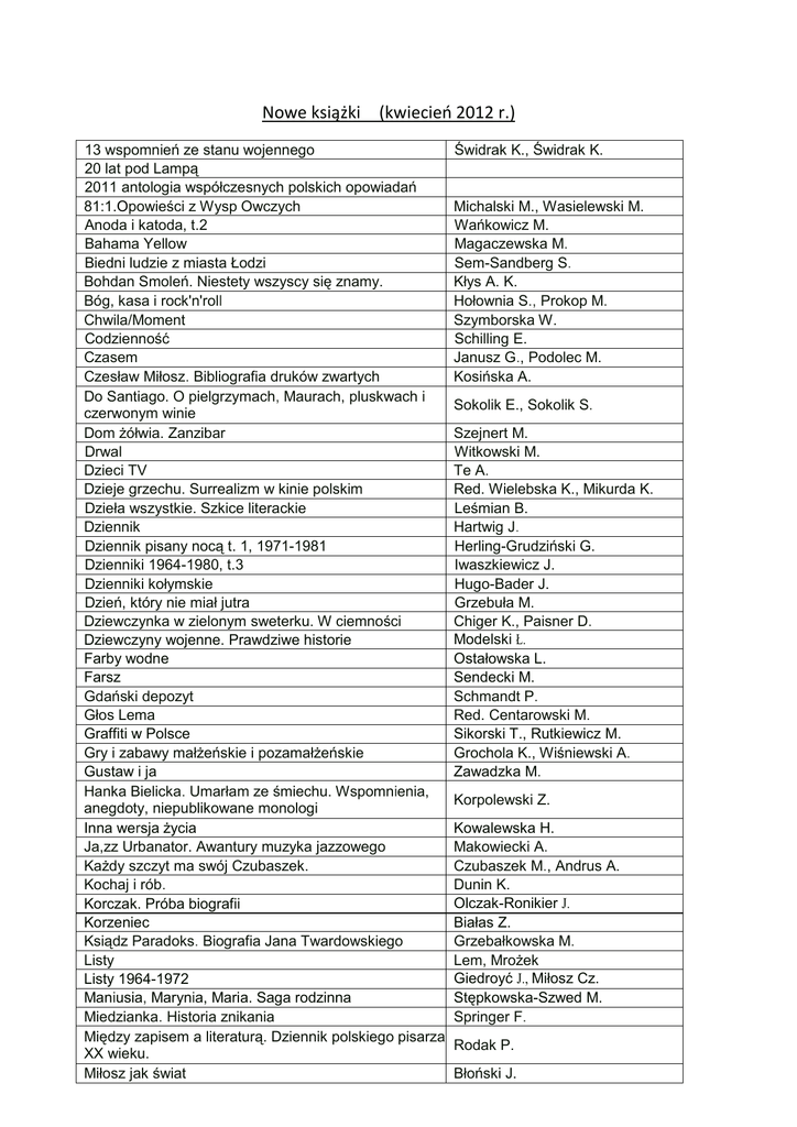 Nowe książki (kwiecień 2012 r.) 13 wspomnień ze stanu wojennego 20 lat pod Lampą 2011 antologia współczesnych polskich opowiadań 81:1.Opowieści z Wysp Owczych Anoda i katoda, t.2 Bahama Yellow Biedni ludzie z miasta Łodzi Bohdan Smoleń. Niestety wszyscy się znamy. Bóg, kasa i rock'n'roll Chwila/Moment Codzienność Czasem Czesław Miłosz. Bibliografia druków zwartych Do Santiago. O pielgrzymach, Maurach, pluskwach i czerwonym winie Dom żółwia. Zanzibar Drwal Dzieci TV Dzieje grzechu. Surrealizm w kinie polskim Dzieła wszystkie. Szkice literackie Dziennik Dziennik pisany nocą t. 1, 1971-1981 Dzienniki 1964-1980, t.3 Dzienniki kołymskie Dzień, który nie miał jutra Dziewczynka w zielonym sweterku. W ciemności Dziewczyny wojenne. Prawdziwe historie Farby wodne Farsz Gdański depozyt Głos Lema Graffiti w Polsce Gry i zabawy małżeńskie i pozamałżeńskie Gustaw i ja Hanka Bielicka. Umarłam ze śmiechu. Wspomnienia, anegdoty, niepublikowane monologi Inna wersja życia Ja,zz Urbanator. Awantury muzyka jazzowego Każdy szczyt ma swój Czubaszek. Kochaj i rób. Korczak. Próba biografii Korzeniec Ksiądz Paradoks. Biografia Jana Twardowskiego Listy Listy 1964-1972 Maniusia, Marynia, Maria. Saga rodzinna Miedzianka. Historia znikania Między zapisem a literaturą. Dziennik polskiego pisarza XX wieku. Miłosz jak świat Świdrak K., Świdrak K. Michalski M., Wasielewski M. Wańkowicz M. Magaczewska M. Sem-Sandberg S. Kłys A. K. Hołownia S., Prokop M. Szymborska W. Schilling E. Janusz G., Podolec M. Kosińska A. Sokolik E., Sokolik S. Szejnert M. Witkowski M. Te A. Red. Wielebska K., Mikurda K. Leśmian B. Hartwig J. Herling-Grudziński G. Iwaszkiewicz J. Hugo-Bader J. Grzebuła M. Chiger K., Paisner D. Modelski Ł. Ostałowska L. Sendecki M. Schmandt P. Red. Centarowski M. Sikorski T., Rutkiewicz M. Grochola K., Wiśniewski A. Zawadzka M. Korpolewski Z. Kowalewska H. Makowiecki A. Czubaszek M., Andrus A. Dunin K. Olczak-Ronikier J. Białas Z. Grzebałkowska M. Lem, Mrożek Giedroyć J., Miłosz Cz. Stępkowska-Szwed M. Springer F. Rodak P. Błoński J. Miłość nas rozumie. Miłość we Wrocławiu Mówi Warszawa Mr. Pebble i Gruda Murzynek B. Najpiękniejsze opowiadania z nieoczekiwanym zakończeniem Nasierowska Foto biografia Nie wierzę w życie pozaradiowe Niebieski ptak. Nieobjęta ziemia Nikt nie jest samotną wyspą, ale wszyscy bardzo się staramy O czym nie mówią nam poloniści Okno z widokiem Opowieści wigilijne o wieczerzy, kolędach, Herodzie ... ORWO antologia Ostatni sprawiedliwy Papierem w system. Prasa drugoobiegowa w PRL Paryski spadek Piesek przydrożny Poczet królowych polskich Podróże małe i duże czyli jak zostaliśmy światowcami Pogrzeb po polsku Polska szkoła animacji Polskie, ArcyPolskie Portret podwójny Powieści Powrót do Poziomki Prowincja pełna słońca Przelot bocianów Resztki nowoczesności Rozmowy z Rafałem Rubryki start i zysków Sad Siedlisko Skerco Solo Sonia, która za dużo chciała Stan wojenny, stan codzienny. 101 ważnych spraw Świat w pigułce czyli Teksas jest większy od Francji Tamtego lata. Zatajona historia Polaków W jednej walizce. Polska arystokracja ma emigracji w Kanadzie + Cd z filmem dokumentalnym "Raj utracony, raj odzyskany" W kanałach Lwowa. W niewoli sowieckiej W odbiciu W pośpiechu Wbrew sobie rozmowy z Tadeuszem Różewiczem Wiersze Władysław Hasior Tischner J. autor projektu Kochan M. Ziomecki M. Liskowacki A. D. Gruza J. Turowska Z. Niedźwiecki M. Wojasz P. Miłosz Cz. Bobrowska N. Zdziechiewicz A. Kordei M. Gil-Kołakowska E., Szareyko H. Oprac. Hartwich A., WolnyHamkało A. Matuszkiewicz I. Red. Marcinkiewicz M., Ligarski S. Grocholska E. Miłosz Cz. Szczygielski M. Mann W., Materna K. Różewicz T. Sitkiewicz P. Werner A. Miłosz Cz., Iwaszkiewicz J. Świetlicki M. Michalak K. Enerlich K. Kowalewska H. Czapliński P. Żurowski A. Dehnel J. Marciniuk A. Majewski J. Liskowacki A.D. Raduńska S. Głowacki J. Zasada St. Kraśko P. Goworzycki S. N. Gołembiowska B. Marshall R. Młynarski B. Małecki J. Konwicki T. Stolarczyk J. Świetlicki M. Szczygieł-Gajewska M. Włoskie szpilki Wpływowe kobiety Drugiej Rzeczypospolitej Wszystko co było - jest. Wszystko z miłości Wtedy. Rozmowy z Jackiem Bocheńskim. Zagrać Marię. Zapach drzewa sandałowego w ostatnich dniach XX wieku Ziarno prawdy Żony opozycjonistów TulIi M.. Koper S. Krużdan J. Ligocka R. Bogucka T., Trznadel J., Kozyra G. i in. Szczepkowska J. Mróz W. Miłoszewski Z. Poppek A. Audiobooki: Cafe Museum Drwal Dziennik 1954 Dziennik, wybór 1962-1989 Moje Indie Zagrać Marię Makłowicz R. Witkowski M. Tyrmand L. Mrożek Sł. Kret J. Szczepkowska J. Książki dla dzieci i młodzieży: Czy wojna jest dla dziewczyn? Felix, Net i Nika oraz Gang Niewidzialnych Ludzi Felix, Net i Nika oraz Pałac Snów Felix, Net i Nika oraz Świat Zero Felix, Net i Nika oraz Teoretycznie Możliwa Katastrofa Magowie ze Wschodu Opowieść pod strasznym tytułem Przygody Baltazara Gąbki. Trylogia Szaleńczaki Wierzę w jeże Beręsewicz P. Kosik R. Kosik R. Kosik R. Kosik R. Staff L. Niemczuk J. Pagaczewski St. Niemczuk J. Sumińska D. Podręczniki: Język Polski dla cudzoziemców. Ćwiczenia dla początkujących Liczebnik też się liczy! Poziom średni ogólny. Pasieka M. Mędak S. Powiedz to po polsku. Poziom Al Drwal-Straszakowa K., Martyniuk W. Ten, ta, to. Ćwiczenia nie tylko gramatyczne dla cudzoziemców. Lechowicz J., Podsiadły J.