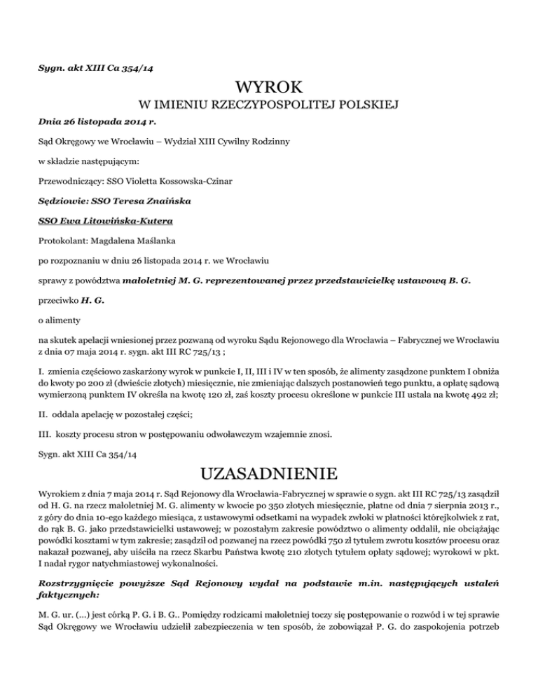 Sygn. akt XIII Ca 354/14 WYROK W IMIENIU RZECZYPOSPOLITEJ POLSKIEJ Dnia 26 listopada 2014 r. Sąd Okręgowy we Wrocławiu – Wydział XIII Cywilny Rodzinny w składzie następującym: Przewodniczący: SSO Violetta Kossowska-Czinar Sędziowie: SSO Teresa Znaińska SSO Ewa Litowińska-Kutera Protokolant: Magdalena Maślanka po rozpoznaniu w dniu 26 listopada 2014 r. we Wrocławiu sprawy z powództwa małoletniej M. G. reprezentowanej przez przedstawicielkę ustawową B. G. przeciwko H. G. o alimenty na skutek apelacji wniesionej przez pozwaną od wyroku Sądu Rejonowego dla Wrocławia – Fabrycznej we Wrocławiu z dnia 07 maja 2014 r. sygn. akt III RC 725/13 ; I. zmienia częściowo zaskarżony wyrok w punkcie I, II, III i IV w ten sposób, że alimenty zasądzone punktem I obniża do kwoty po 200 zł (dwieście złotych) miesięcznie, nie zmieniając dalszych postanowień tego punktu, a opłatę sądową wymierzoną punktem IV określa na kwotę 120 zł, zaś koszty procesu określone w punkcie III ustala na kwotę 492 zł; II. oddala apelację w pozostałej części; III. koszty procesu stron w postępowaniu odwoławczym wzajemnie znosi. Sygn. akt XIII Ca 354/14 UZASADNIENIE Wyrokiem z dnia 7 maja 2014 r. Sąd Rejonowy dla Wrocławia-Fabrycznej w sprawie o sygn. akt III RC 725/13 zasądził od H. G. na rzecz małoletniej M. G. alimenty w kwocie po 350 złotych miesięcznie, płatne od dnia 7 sierpnia 2013 r., z góry do dnia 10-ego każdego miesiąca, z ustawowymi odsetkami na wypadek zwłoki w płatności którejkolwiek z rat, do rąk B. G. jako przedstawicielki ustawowej; w pozostałym zakresie powództwo o alimenty oddalił, nie obciążając powódki kosztami w tym zakresie; zasądził od pozwanej na rzecz powódki 750 zł tytułem zwrotu kosztów procesu oraz nakazał pozwanej, aby uiściła na rzecz Skarbu Państwa kwotę 210 złotych tytułem opłaty sądowej; wyrokowi w pkt. I nadał rygor natychmiastowej wykonalności. Rozstrzygnięcie powyższe Sąd Rejonowy wydał na podstawie m.in. następujących ustaleń faktycznych: M. G. ur. (...) jest córką P. G. i B. G.. Pomiędzy rodzicami małoletniej toczy się postępowanie o rozwód i w tej sprawie Sąd Okręgowy we Wrocławiu udzielił zabezpieczenia w ten sposób, że zobowiązał P. G. do zaspokojenia potrzeb małoletniej M. G. po 500 zł miesięcznie, poczynając od dnia 12 lutego 2013 r. Powódka w marcu 2013 r. złożyła do komornika sądowego wniosek o wszczęcie postępowania egzekucyjnego. W toku w/w postępowania od dłużnika wyegzekwowano na rzecz wierzycielki ok. 1590 zł. W sprawie o rozwód udzielono dalszego zabezpieczenia i postanowieniem z dnia 3 marca 2014 r. zobowiązano ojca małoletniej do łożenia na zaspokojenie jej potrzeb o 100 zł więcej, poczynając od 3 marca 2014 r. Zobowiązany nie łożył systematycznie zasądzonej kwoty i nie w pełnej wysokości, powodując narastające zadłużenie. Małoletnia uczęszcza do żłobka, za które jej matka płaci ok. 450 zł miesięcznie. Małoletnia często się przeziębia, ponadto stwierdzono u niej m.in. rumień, alergię pokarmową, uczulenie na jajko kurze, rumianek, laktozę. Jest pod opieką lekarza pediatry, gastrologa, laryngologa, ma skierowanie do ortopedy. W ocenie jej matki, miesięczny koszt utrzymania małoletniej to 1200- 1300 zł. Matka małoletniej M. z zawodu jest historykiem sztuki, jest zatrudniona na czas nieokreślony w Teatrze Polskim we W., jako rzemieślnik teatralny- malarz z miesięcznym wynagrodzeniem kwocie 2374 zł brutto, tj. 1600 zł netto. Z tego wynagrodzenia zakład pracy potrąca ok.550 zł miesięcznie za wynajem mieszkania służbowego. Po dokonaniu wszystkich opłat przedstawicielce ustawowej małoletniej pozostaje na utrzymanie 700-800 zł miesięcznie. Płaci także po 110 zł za energię, na swoje wyżywienie wydaje 400 zł miesięcznie, spłaca kredyt studencki po 300 zł oraz posiada dług spadkowy po zmarłej matce w wys. 20 000 zł. B. K.- G. spłaca także samodzielnie zaciągnięty na zakup mieszkania małżonków kredyt w wys. 120 000 zł, aktualnie bank ustala wysokość rat spłaty pozostałego kredytu. Matka małoletniej korzysta z pomocy swoich koleżanek, które przekazują jej ubrania dla córki, żywność. Przedstawicielka ustawowa nie pobiera na rzecz małoletniej z Funduszu Alimentacyjnego alimentów. Wobec ojca małoletniej prowadzone jest nadal postępowanie egzekucyjne w przedmiocie alimentów ale jest w części bezskuteczne. Pozwana jest babcią ojczystą małoletniej, ma 58 lat. Współpracuje ze spółką (...) SA na podstawie umowy zlecania jako przedstawiciel handlowy w firmie pożyczkowej z miesięcznym dochodem w wys. 3000 zł miesięcznie. W 2012 r. osiągnęła dochód wys. 36 177 zł. H. G. pomimo stwierdzonego nadciśnienia tętniczego nie leczy się farmakologicznie. Zamieszkuje w nieruchomości swoich rodziców wraz z nimi i dwoma dorosłymi synami. Rodzice pozwanej są na emeryturze i mają z tego tytułu dochód w wys. 2600 zł miesięcznie, matka pozwanej jeszcze dodatkowo pracuje z uwagi na spłatę pożyczki, którą pobrała na przebudowę domu. Ojciec małoletniej- P. G. nie pracuje, nie ponosi żadnych kosztów utrzymania domu, w którym ze swoją rodziną generacyjną zamieszkuje. Pozwana ponosi wszystkie koszty utrzymania domu, w którym zamieszkuje łącznie 5 dorosłych osób a koszt ten wynosi 850 zł miesięcznie, na zakup opału wydaje 7000 zł rocznie, za energię elektryczną musi zapłacić dodatkowo 1000 zł. Spłaca trzy pożyczki w łącznej kwocie po 1725 zł miesięcznie. Babcia małoletniej poza zabezpieczoną w trakcie niniejszego procesu ratą alimentacyjną w kwocie po 150 zł, przekazywała na rzecz wnuczki prezenty w postaci ubrania i żywności o wartości do 200 zł a część prezentów oszacowanych na 600 zł nie udało się jej przekazać z uwagi na złe relacje z matką dziecka. Przy tak ustalonym stanie faktycznym, po dokonaniu wykładni treści 