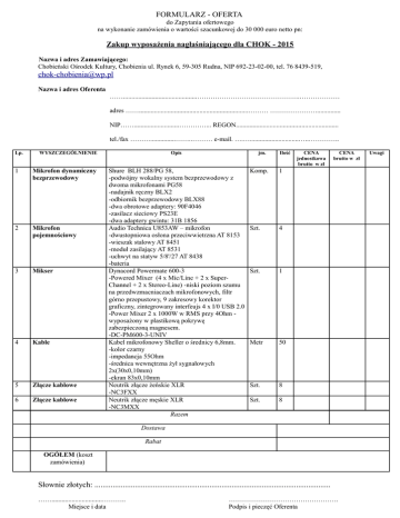 FORMULARZ - OFERTA do Zapytania ofertowego na wykonanie zamówienia o wartości szacunkowej do 30 000 euro netto pn: Zakup wyposażenia nagłaśniającego dla CHOK - 2015 Nazwa i adres Zamawiającego: Chobieński Ośrodek Kultury, Chobienia ul. Rynek 6, 59-305 Rudna, NIP 692-23-02-00, tel. 76 8439-519, [email protected] Nazwa i adres Oferenta ……............................................……………………………………….……………… adres …….................................................................……… ………………….............. NIP……...........................…………... REGON............................................................. tel./fax ………...............……..……… e-mail. ….….............................…..………….. Lp. WYSZCZEGÓLNIENIE 1 Mikrofon dynamiczny bezprzewodowy 2 Mikrofon pojemnościowy 3 Mikser 4 Kable 5 Złącze kablowe 6 Złącze kablowe Opis jm. Shure BLH 288/PG 58, -podwójny wokalny system bezprzewodowy z dwoma mikrofonami PG58 -nadajnik ręczny BLX2 -odbiornik bezprzewodowy BLX88 -dwa obrotowe adaptery: 90F4046 -zasilacz sieciowy PS23E -dwa adaptery gwintu: 31B 1856 Audio Technica U853AW – mikrofon -dwustopniowa osłona przeciwwietrzna AT 8153 -wieszak stalowy AT 8451 -moduł zasilający AT 8531 -uchwyt na statyw 5/8'/27 AT 8438 -bateria Dynacord Powermate 600-3 -Powered Mixer (4 x Mic/Line + 2 x SuperChannel + 2 x Stereo-Line) -niski poziom szumu na przedwzmacniaczach mikrofonowych, filtr górno przepustowy, 9 zakresowy korektor graficzny, zintegrowany interfeujs 4 x I/0 USB 2.0 -Power Mixer 2 x 1000W w RMS przy 4Ohm wyposażony w plastikową pokrywę zabezpieczoną magnesem. -DC-PM600-3-UNIV Kabel mikrofonowy Sheller o średnicy 6,8mm. -kolor czarny -impedancja 55Ohm -średnica wewnętrzna żył sygnałowych 2x(30x0,10mm) -ekran 83x0,10mm Neutrik złącze żeńskie XLR -NC3FXX Neutrik złącze męskie XLR -NC3MXX Razem Ilość Komp. 1 Szt. 4 Szt. 1 Metr 50 Szt. 8 Szt. 8 CENA jednostkowa brutto w zł CENA brutto w zł Dostawa Rabat OGÓŁEM (koszt zamówienia) Słownie złotych: ..................................................................................................................... ……..............................……….. Miejsce i data …………………………………………. Podpis i pieczęć Oferenta Uwagi ZAPYTANIE OFERTOWE na zakup wyposażenia nagłaśniającego dla CHOK – 2015 zgodnie z art. 4 pkt 8 ustawy z dnia 29 stycznia 2004r. Prawo zamówień publicznych na wykonanie zamówienia o wartości szacunkowej do 30 000 euro netto Chobieński Ośrodek Kultury zwraca się z zapytaniem ofertowym o cenę na zakup, dostawę wyposażenia I. Zamawiający Chobieński Ośrodek Kultury Adres: Chobienia ul. Rynek 6, 59-305 Rudna tel. 76 843 95 19, 76 843 95 09 fax 76 843 95 19 NIP: 692-23-02-008 REGON: 390950200 II. Przedmiot zapytania ofertowego Przedmiotem zamówienia jest dostawa fabrycznie nowych urządzeń i materiałów do CHOK wyszczególnionych w szczegółowym opisie przedmiotu zamówienia, stanowiącym załącznik do zapytania ofertowego. III. Termin realizacji 1. Dostawa będzie zrealizowana w terminie do 17.12.2015 r. IV. Warunki realizacji 1. Wyposażenie oraz materiały dostarczone będzie na koszt Dostawcy, zgodnie z zamówieniem złożonym przez Zamawiającego w formie pisemnej, faksowej lub elektronicznej. 2. Cena określona w ofercie powinna obejmować wszystkie koszty związane z realizacją przedmiotu zamówienia. 3. Rozliczenie transakcji nastąpi przelewem na konto podane na fakturze w ciągu 14 dni od dnia otrzymania prawidłowo wystawionej faktury przez Dostawcę. 4. Zamawiający może zamknąć postępowanie bez wybrania żadnej oferty, w przypadku, gdy żadna ze złożonych ofert nie odpowiada warunkom określonym przez Zamawiającego. 5. Zamawiający zastrzega, że ilości artykułów wskazanych w szczegółowym opisie przedmiotu zamówienia są ilościami szacunkowymi służącymi do skalkulowania ceny oferty, porównania ofert oraz wyboru najkorzystniejszej oferty. 6. Zamawiający wyraża zgodę na składanie ofert częściowych. 7. Chobieński Ośrodek Kultury zaznacza, iż Dostawca może ulec zmianie w przypadku naruszenia zasad określonych w niniejszym zapytaniu. V. Forma składania ofert Ofertę należy złożyć na formularzu stanowiącym załącznik nr 1 do zapytania ofertowego – Formularz ofertowy. VI. Miejsce składania ofert 1. Ofertę należy dostarczyć do Chobieńskiego Ośrodka Kultury: − email na adres: [email protected], osobiście lub pocztą na adres: Chobienia ul. Rynek 6, 59-305 Rudna, z dopiskiem „Oferta na zakup wyposażenia nagłaśniającego dla CHOK - 2015” 2. Ofertę należy złożyć do dnia 19.11.2015 r. Na adres email: [email protected] 3. O wyborze najkorzystniejszej oferty wybrany oferent zostanie poinformowany drogą mailową. VII. Kryteria wyboru oferty Kryterium oceny ofert: 100% cena brutto. VIII. Opis sposobu przygotowania oferty W ofercie należy podać cenę jednostkową brutto oraz wartość, zgodnie z podanymi jednostkami miary. Oferta musi zawierać nazwę, numer NIP, Regon, oraz dane kontaktowe (adres, telefon, e-mail) Oferenta. Osoba uprawniona do kontaktu z oferentami: Katarzyna Przeworska tel. 76 8439-519, 76 8439509 Dyrektor Chobieńskiego Ośrodka Kultury Katarzyna Przeworska