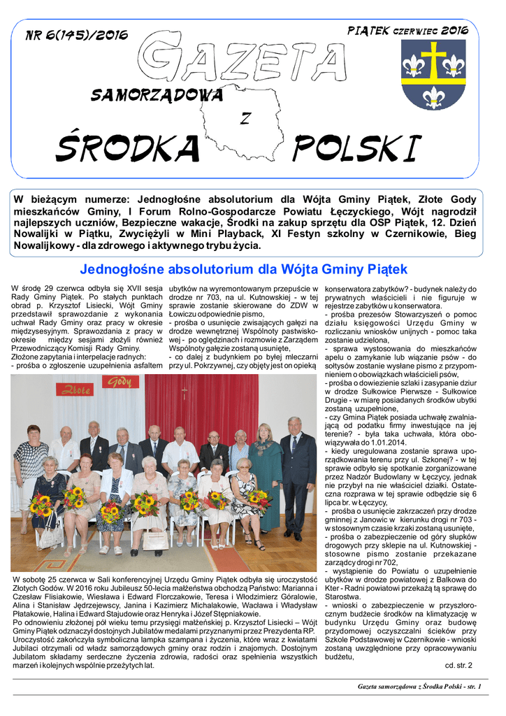 W bie cym numerze: Jednog ne absolutorium dla Wójta Gminy Pi tek, Z ote Gody mieszka ców Gminy, I Forum Rolno-Gospodarcze Powiatu czyckiego, Wójt nagrodzi najlepszych uczniów, Bezpieczne wakacje, rodki na zakup sprz tu dla OSP Pi tek, 12. Dzie Nowalijki w Pi tku, Zwyci yli w Mini Playback, XI Festyn szkolny w Czernikowie, Bieg Nowalijkowy - dla zdrowego i aktywnego trybu ycia. Jednog ne absolutorium dla Wójta Gminy Pi tek rod 29 czerwca odby a si XVII sesja Rady Gminy Pi tek. Po sta ych punktach obrad p. Krzysztof Lisiecki, Wójt Gminy przedstawi sprawozdanie z wykonania uchwa Rady Gminy oraz pracy w okresie mi dzysesyjnym. Sprawozdania z pracy w okresie mi dzy sesjami z yli równie Przewodnicz cy Komisji Rady Gminy. one zapytania i interpelacje radnych: - pro ba o zg oszenie uzupe nienia asfaltem ubytków na wyremontowanym przepu cie w drodze nr 703, na ul. Kutnowskiej - w tej sprawie zostanie skierowane do ZDW w owiczu odpowiednie pismo, - pro ba o usuni cie zwisaj cych ga zi na drodze wewn trznej Wspólnoty pastwiskowej - po ogl dzinach i rozmowie z Zarz dem Wspólnoty ga zie zostan usuni te, - co dalej z budynkiem po by ej mleczarni przy ul. Pokrzywnej, czy obj ty jest on opiek W sobot 25 czerwca w Sali konferencyjnej Urz du Gminy Pi tek odby a si uroczysto otych Godów. W 2016 roku Jubileusz 50-lecia ma stwa obchodz Pa stwo: Marianna i Czes aw Flisiakowie, Wies awa i Edward Florczakowie, Teresa i W odzimierz Góralowie, Alina i Stanis aw J drzejewscy, Janina i Kazimierz Michalakowie, Wac awa i W adys aw atakowie, Halina i Edward Stajudowie oraz Henryka i Józef St pniakowie. Po odnowieniu z onej pó wieku temu przysi gi ma skiej p. Krzysztof Lisiecki – Wójt Gminy Pi tek odznaczy dostojnych Jubilatów medalami przyznanymi przez Prezydenta RP. Uroczysto zako czy a symboliczna lampka szampana i yczenia, które wraz z kwiatami Jubilaci otrzymali od w adz samorz dowych gminy oraz rodzin i znajomych. Dostojnym Jubilatom sk adamy serdeczne yczenia zdrowia, rado ci oraz spe nienia wszystkich marze i kolejnych wspólnie prze ytych lat. konserwatora zabytków? - budynek nale y do prywatnych w cicieli i nie figuruje w rejestrze zabytków u konserwatora. - pro ba prezesów Stowarzysze o pomoc dzia u ksi gowo ci Urz du Gminy w rozliczaniu wniosków unijnych - pomoc taka zostanie udzielona, - sprawa wystosowania do mieszka ców apelu o zamykanie lub wi zanie psów - do so tysów zostanie wys ane pismo z przypomnieniem o obowi zkach w cicieli psów, - pro ba o dowiezienie szlaki i zasypanie dziur w drodze Su kowice Pierwsze - Su kowice Drugie - w miar posiadanych rodków ubytki zostan uzupe nione, - czy Gmina Pi tek posiada uchwa zwalniaod podatku firmy inwestuj ce na jej terenie? - by a taka uchwa a, która obowi zywa a do 1.01.2014. - kiedy uregulowana zostanie sprawa uporz dkowania terenu przy ul. Szkonej? - w tej sprawie odby o si spotkanie zorganizowane przez Nadzór Budowlany w czycy, jednak nie przyby na nie w ciciel dzia ki. Ostateczna rozprawa w tej sprawie odb dzie si 6 lipca br. w czycy, - pro ba o usuni cie zakrzacze przy drodze gminnej z Janowic w kierunku drogi nr 703 w stosownym czasie krzaki zostan usuni te, - pro ba o zabezpieczenie od góry s upków drogowych przy sklepie na ul. Kutnowskiej stosowne pismo zostanie przekazane zarz dcy drogi nr 702, - wyst pienie do Powiatu o uzupe nienie ubytków w drodze powiatowej z Balkowa do Kter - Radni powiatowi przeka spraw do Starostwa. - wnioski o zabezpieczenie w przysz orocznym bud ecie rodków na klimatyzacj w budynku Urz du Gminy oraz budow przydomowej oczyszczalni cieków przy Szkole Podstawowej w Czernikowie - wnioski zostan uwzgl dnione przy opracowywaniu bud etu, cd. str. 2 Gazeta samorz dowa z rodka P olski - str. 1 I Forum RolnoGospodarcze Powiatu czyckiego W niedziel 5 czerwca w Pi tku odby o si I Forum Rolno-Gospodarcze Powiatu czyckiego. Miejsce Forum nie by o przypadkowe. Gmina Pi tek s ynie w kraju z produkcji najwy szej jako ci nowalijek. To w nie z okolic Geometrycznego rodka Polski trafiaj na nasze sto y pierwsze, najsmaczniejsze nowalijki. Producenci dominuj cych w gminie upraw nowalijek maj w Pi tku swoje wi to Dzie Nowalijki. Przy okazji tego wi ta Pi tek sta si równie miejscem I Forum Rolno-Gospodarczego skierowanego w ównej mierze do producentów warzyw. Na wydarzenie to zaproszeni zostali przede wszystkim rolnicy – producenci warzyw z terenu powiatu czyckiego. Wydarzenie otworzyli – pan Wojciech Zdziarski – Starosta Powiatu czyckiego oraz pan Krzysztof Lisiecki – Wójt Gminy Pi tek. Szereg prezentacji i prelekcji rozpocz o wyst pienie pana Piotra Jab skiego ze Starostwa Powiatowego czycy po wi cone pr oce som stworzenia oferty towarowej powiatu czyckiego. O mo liwo ciach uzyskania wsp ar cia i zakr esach d zia Regionalnego Biura Urz du Marsza kowskiego Województwa ódzkiego w Brukseli – mówi pan Marcin Podgórski, Dyrektor Regionalnego Biura Województwa ódzkiego w Brukseli. Du ym zainteresowaniem s uchaczy cieszy o si tak e wyst pienie przedstawiciela Departamentu ds. Przedsi biorczo ci Urz du Marsza kowskiego Województwa ódzkiego na temat innowacyjnego rolnictwa i przetwórstwa rolnospo ywczego, jako jednej z Regionalnych Inteligentnych Specjalizacji Województwa ódzkiego. Uczestnicy I Forum Rolno-Gospodarczego Powiatu czyckiego wys uchali m.in. prezentacji na temat: metod biologicznych w produkcji warzyw wysokiej jako ci prelegent: pani Ewa Szewczyk, G ówny Specjalista ds. Ogrodnictwa i Ro lin Okopowych w ódzkim O rodku Doradztwa Rolniczego z s. w Bratoszewicach, oferty ódzkiego Rynku Hurtowego "Zjazdowa" S.A. i wspó pracy z Klastrem ywno ci Wysokiej Jako ci przedstawionej przez pana Karola Karolaka, Wiceprezesa Zarz du ódzkiego Rynku Hurtowego „Zjazdowa” S.A., stosowania nasion uszlachetnionych jak sposobu na lepszy plon wraz z prezentacj oferty firmy PNOS z O arowa Mazowieckiego oraz innych. Gazeta samorz dowa z rodka Polski - str. 2 Bezpieczne wakacje Mimo braku oficjalnych 