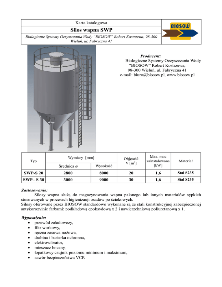 Karta katalogowa Silos wapna SWP Biologiczne Systemy Oczyszczania Wody “BIOSOW” Robert Kostrzewa, 98-300 Wieluń, ul. Fabryczna 41 Producent: Biologiczne Systemy Oczyszczania Wody “BIOSOW” Robert Kostrzewa, 98-300 Wieluń, ul. Fabryczna 41 e-mail: [email protected], www.biosow.pl Typ Wymiary [mm] Objętość V [m3] Max. moc zainstalowana [kW] Materiał Średnica ø Wysokość SWP-S 20 2800 8000 20 1,6 Stal S235 SWP– S 30 3000 9000 30 1,6 Stal S235 Zastosowanie: Silosy wapna służą do magazynowania wapna palonego lub innych materiałów sypkich stosowanych w procesach higienizacji osadów po ściekowych. Silosy oferowane przez BIOSOW standardowo wykonane są ze stali konstrukcyjnej zabezpieczonej antykorozyjnie farbami: podkładową epoksydową x 2 i nawierzchniową poliuretanową x 1. Wyposażenie: przewód załadowczy, filtr workowy, ręczna zasuwa nożowa, drabina i barierka ochronna, elektrowibrator, mieszacz boczny, łopatkowy czujnik poziomu minimum i maksimum, zawór bezpieczeństwa VCP.