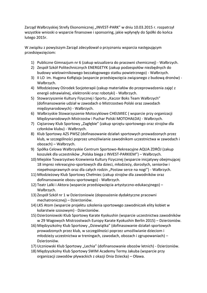 Zarząd Wałbrzyskiej Strefy Ekonomicznej „INVEST-PARK” w dniu 10.03.2015 r. rozpatrzył wszystkie wnioski o wsparcie finansowe i sponsoring, jakie wpłynęły do Spółki do kooca lutego 2015r. W związku z powyższym Zarząd zdecydował o przyznaniu wsparcia następującym przedsięwzięciom: 1) Publiczne Gimnazjum nr 6 (zakup wizualizera do pracowni chemicznej) - Wałbrzych. 2) Zespół Szkół Politechnicznych ENERGETYK (zakup podzespołów niezbędnych do budowy wielowirnikowego bezzałogowego statku powietrznego) - Wałbrzych. 3) II LO im. Hugona Kołłątaja (wsparcie przedsięwzięcia związanego z budową dronów) Wałbrzych. 4) Młodzieżowy Ośrodek Socjoterapii (zakup materiałów do przeprowadzenia zajęd z energii odnawialnej, elektroniki oraz robotyki) - Wałbrzych. 5) Stowarzyszenie Kultury Fizycznej i Sportu „Kaczor Boks Team Wałbrzych” (dofinansowanie udział w zawodach o Mistrzostwo Polski oraz zawodach międzynarodowych) - Wałbrzych. 6) Wałbrzyskie Stowarzyszenie Motocyklowe CHEŁMIEC ( wsparcie przy organizacji Międzynarodowych Mistrzostw i Puchar Polski MOTOHAŁDA) - Wałbrzych. 7) Ciężarowy Klub Sportowy „Zagłębie” (zakup sprzętu sportowego oraz strojów dla członków klubu) - Wałbrzych. 8) Klub Sportowy AZS PWSZ (dofinasowanie działao sportowych prowadzonych przez klub, w szczególności poprzez umożliwianie zawodnikom uczestnictwa w zawodach i obozach) – Wałbrzych. 9) Spółka Celowa Wałbrzyskie Centrum Sportowo-Rekreacyjne AQUA ZDRÓJ (zakup koszulek dla uczestników „Polska biega z INVEST-PARKIEM”) – Wałbrzych. 10) Miejskie Towarzystwo Krzewienia Kultury Fizycznej (wsparcie inicjatywy obejmującej 18 imprez rekreacyjno-sportowych dla dzieci, młodzieży, dorosłych, seniorów i niepełnosprawnych oraz dla całych rodzin „Postaw serce na nogi”) - Wałbrzych. 11) Młodzieżowy Klub Sportowy Chełmiec (zakup strojów dla zawodników oraz dofinansowanie obozu sportowego) - Wałbrzych. 12) Teatr Lalki i Aktora (wsparcie przedsięwzięcia artystyczno-edukacyjnego) – Wałbrzych. 13) Zespół Szkół nr 1 w Dzierżoniowie (doposażenie dydaktyczne pracowni mechatronicznej) – Dzierżoniów. 14) LKS Atom (wsparcie projektu szkolenia sportowego zawodniczek elity kobiet w kolarstwie szosowym) - Dzierżoniów. 15) Dzierżoniowski Klub Sportowy Karate Kyokushin (wsparcie uczestnictwa zawodników w 29 Wagowych Mistrzostwach Europy Karate Kyokushin Berlin 2015) – Dzierżoniów. 16) Międzyszkolny Klub Sportowy „Dziewiątka” (dofinasowanie działao sportowych prowadzonych przez klub, w szczególności poprzez umożliwianie dzieciom i młodzieży uczestnictwa w treningach, zawodach, obozach i zgrupowaniach) – Dzierżoniów. 17) Uczniowski Klub Sportowy „Lechia” (dofinansowanie obozów letnich) - Dzierżoniów. 18) Międzyszkolny Klub Sportowy SWIM Academy Termy Jakuba (wsparcie przy organizacji zawodów pływackich z okazji Dnia Dziecka) – Oława. 19) I Liceum Ogólnokształcące im. Jana Kasprowicza (wsparcie przy organizacji Olimpiady Innowacji Technicznych i Wynalazczości) – Świdnica. 20) Młodzieżowy Dom Kultury im. Mieczysława Kozara – Słobódzkiego (wsparcie przedsięwzięcia związanego z budową drona) – Świdnica. 21) Świdnicki Klub Piłki Ręcznej „Świdnica” (wsparcie organizacji Festiwalu Piłki Ręcznej Świdnica Cup 2013) – Świdnica. 22) Uczniowski Klub Sportowy „Judoka” Imbranowice (wsparcie przy organizacji VI Otwartych Mistrzostw Judo oraz sportowych obozów letnich) – Żarów. 23) Polskie Stowarzyszenie HAIDONG GUMDO (wsparcie przy organizacji obozu sportowego) – Jaszkowa Górna. 24) Gmina Kłodzko (wsparcie przy organizacji XV Polsko-Czeskich Szkolnych Drużynowych Biegów o Puchar Wójta Gminy Kłodzko) – Kłodzko. 25) Ludowy Klub Sportowy „Iskra” (wsparcie przy organizacji XII Ludowego Biegu Górskiego o Puchar Koniczynki) - Jaszkowa Górna. 26) Gmina Nowa Ruda (wsparcie dla projektu skupiającego się na aktywizacji ruchowej dzieci i młodzieży w postaci doposażenia istniejącej ścieżki zdrowia urządzeniami Outdoor fitness) – Nowa Ruda. 27) Gmina Strzelin (wsparcie przy organizacji IV Biegu Wzgórz Strzelioskich). 28) Nyski Ośrodek Rekreacji (wsparcie przy organizacji III Biegu Ulicznego „Szlakiem Zabytków Nysy”) – Nysa. 29) Park Naukowo-Technologiczny (wsparcie warsztatów dla początkujących robotyków) – Opole. 30) Zespół Szkół Zawodowych im. Stanisława Staszica w Szprotawie (wsparcie przy organizacji XVII edycji Wojewódzkiego Konkursu o Tytuł Najlepszego Ślusarza Ziemi Lubuskiej) – Szprotawa. 31) Centrum Kultury w Jedlinie-Zdroju (wsparcie przy organizacji Międzynarodowego Turnieju Centrope Cup Polska 2015) – Jedlina Zdrój. 32) Stowarzyszenie Aktywnośd Kobiet (wsparcie przy organizacji konferencji „Gospodarka jest kobietą”) – Wrocław. Informujemy, że na naszej stronie w zakładce „o strefie/usługi dodatkowe/sponsoring” znajdują się dokumenty do pobrania oraz szczegółowe zasady sponsoringu. Bardzo prosimy wszelkie podania kierowad do WSSE na wskazanych wzorach.