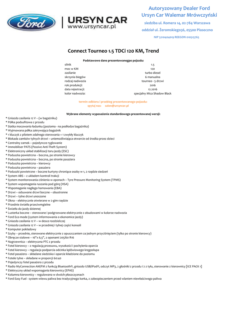 Autoryzowany Dealer Ford Ursyn Car Walemar Mrówczyński siedziba ul. Romera 14, 02-784 Warszawa oddział ul. Żeromskiego36, 05500 Piaseczno NIP 5210404019 REEGON 010515765 Connect Tourneo 1.5 TDCi 120 KM, Trend Podstawowe dane prezentowanegpo pojazdu: silnik 1.5 moc w KM 120 zasilanie turbo diesel skrzynia biegów 6 manualna rodzaj nadwozia tourneo - 5 drzwi rok produkcji: 2016 data rejestracji: 12.2016 kolor nadwozia: specjalny Mica Shadow Black termin odbioru i przebieg prezentowanego pojazdu: spytaj nas: [email protected] Wybrane elementy wyposażenia standardowego prezentowanej wersji: * Gniazdo zasilania 12 V – (w bagażniku) * Półka podsufitowa z przodu * Siatka mocowania ładunku (pozioma - na podłodze bagażnika) * Wyjmowana półka zakrywająca bagażnik * 1 kluczyk z pilotem zdalnego sterowania + 1 zwykły kluczyk * Blokada zamków tylnych drzwi – uniemożliwiająca otwarcie od środka przez dzieci * Centralny zamek – pojedyncze ryglowanie * Immobiliser PATS (Passive Anti-Theft System) * Elektroniczny układ stabilizacji toru jazdy (ESC) * Poduszka powietrzna – boczna, po stronie kierowcy * Poduszka powietrzna – boczna, po stronie pasażera * Poduszka powietrzna – kierowcy * Poduszka powietrzna – pasażera * Poduszki powietrzne – boczne kurtyny chroniące osoby w 1, 2 rzędzie siedzeń * System ABS – z układem kontroli trakcji * System monitorowania ciśnienia w oponach – Tyre Pressure Monitoring System (TPMS) * System wspomagania ruszania pod górę (HSA) * Wspomaganie nagłego hamowania (EBA) * Drzwi – odsuwane drzwi boczne – obustronne * Drzwi – tylne drzwi unoszone * Okna – elektrycznie otwierane w 2-gim rzędzie * Przednie światła przeciwmgielne * Światła do jazdy dziennej * Lusterka boczne – sterowane i podgrzewane elektrycznie z obudowami w kolorze nadwozia * Ford Eco mode (system informowania o ekonomice jazdy) * Gniazdo zasilania 12 V – w desce rozdzielczej * Gniazdo zasilania 12 V – w przedniej i tylnej części konsoli * Komputer pokładowy * Szyby – przednie, sterowane elektrycznie z opuszczaniem za jednym przyciśnięciem (tylko po stronie kierowcy) * Obręcze stalowe – 16"x 6,5", z oponami 205/60 R16 * Nagrzewnica – elektryczna PTC z przodu * Fotel kierowcy – z regulacją przesuwu, wysokości i pochylenia oparcia * Fotel kierowcy – regulacja podparcia odcinka lędźwiowego kręgosłupa * Fotel pasażera – składane siedzisko i oparcie kładzione do poziomu * Fotele tylne – składane w proporcji 60:40 * Pojedynczy fotel pasażera z przodu * Radio MyConnection AM/FM z funkcją Bluetooth®, gniazdo USB/iPod®, odczyt MP3, 2 głośniki z przodu i 2 z tyłu, sterowanie z kierownicy [ICE PACK 1] * Elektryczny układ wspomagania kierownicy (EPAS) * Kolumna kierownicy – regulowana w dwóch płaszczyznach * Ford Easy Fuel - system wlewu paliwa bez tradycyjnego korka, z zabezpieczeniem przed wlaniem niewłaściwego paliwa Aktualna cena nowego pojazdu: 84 132,00 Wyposażenie opcjonalne oferowanego egzemplarza: * Autoalarm 1 250,00 * Czujniki parkowania tył 800,00 * Lakier specjalny Mica Shadow Black 1 415,00 * Elektrycznie ogrzewana przednia szyba i lusterka boczne 738,00 * Koło zapasowe z obręczą stalową 332,10 * Pakiet kluczyków 2 221,00 * Relingi dachowe z poprzeczkami 984,00 * Elementy Pakietu Komfort 1: Klimatyzacja manualna Tempomat z regulowalnym ogranicznikiem prędkości i kierownica czteroramienna pokryta skórą 3 690,00 775,00 * Pakiet siedzeń 25: fotele ogrzewane regulacja fotela kierowcy na 4 sposoby: przesuw przód/tył, pochylenie oparcia, regulacja wysokości, regulacja podparcia kręgosłupa składany fotel pasażera; kieszeń za oparciem fotela kierowcy 615,00 Cena nowego egzemplarza wraz z wyposażeniem opcjonalnym: brutto 94 952,10 Cena oferowanego egzemplarza: brutto 77 900,00 Zyskujesz w stosunku do nowego auta aż: Skontaktuj sie z nami pod adresem: [email protected] salon Ursynów 22 644-75-75 salon Piaseczno 22 73-55-900 17 052,10 Dokładamy wszelkich starań aby opisy produktów były wolne od błędów, jednakże zastrzegamy sobie prawo do pomyłki. Zdjęcia produktów są zdjęciami poglądowymi i mogą różnić się nieznacznie od produktu fizycznego. Zawarte w niniejszym wydawnictwie informacje nie stanowią zapewnienia w rozumieniu art. 4 ust. 3 i 4 Ustawy z dnia 27 lipca 2002 roku o szczególnych warunkach sprzedaży oraz o zmianie Kodeksu Cywilnego (dalej „Ustawa”), a także nie stanowią opisu towaru w rozumieniu art. 4 ust. 2 Ustawy. Zamontowane wyposażenie dodatkowe może powodować zastąpienie wyposażenia standardowego lub brak możliwości montażu elementów stanowiących wyposażenie standardowe lub opcjonalne danej wersji modelowej Niniejsze wydawnictwo nie stanowi oferty w rozumieniu art. 66 Kodeksu Cywilnego.