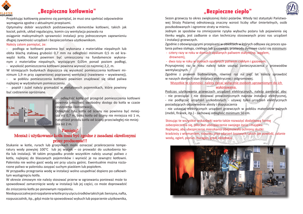 „Bezpieczna kotłownia” Projektując kotłownię powinno się pamiętać, że musi ona spełniać odpowiednie wymagania zgodne z aktualnymi przepisami. Optymalny dobór wszystkich podstawowych elementów kotłowni, takich jak kocioł, palnik, układ regulacyjny, komin czy wentylacja pozwala na osiąganie maksymalnych sprawności instalacji przy jednoczesnym zapewnieniu długiej żywotności urządzeń i bezpieczeństwa użytkownikom. Należy zatem pamiętać, że: - podłoga w kotłowni powinna być wykonana z materiałów niepalnych lub obita blachą stalową grubości 0,7 mm na odległości minimum 0,5 m od krawędzi kotła. Kocioł powinien być umieszczony na fundamencie wykonanym z materiałów niepalnych, wystającym 0,05m ponad poziom podłogi, - wysokość pomieszczenia kotłowni powinna wynosić co najmniej 2,2, m. W istniejących budynkach dopuszcza się wysokość pomieszczenia kotłowni minimum 1,9 m przy zapewnionej poprawnej wentylacji (nawiewno – wywiewnej), w pobliżu pomieszczenia kotłowni powinien znajdować się skład paliwa najlepiej w wydzielonym pomieszczeniu. - popiół i żużel należy gromadzić w metalowych pojemnikach, które powinny być codziennie opróżniane. - odległość kotła od przegród pomieszczenia kotłowni powinna umożliwić swobodny dostęp do kotła w czasie czyszczenia i konserwacji. Odległość tyłu kotła od ściany nie powinna być mniejsza niż 0,7 m, boku kotła od ściany nie mniejsza niż 1 m, natomiast przodu kotła od ściany przeciwległej nie mniejsza niż 2 m. Pamiętaj! Montaż i użytkowanie kotła musi być zgodne z zasadami określonymi przez producenta!!! Stukanie w kotle, rurach lub grzejnikach może oznaczać przekroczenie temperatury wody powyżej 100°C lub jej wyciek – co prowadzi do uszkodzenia kotła lub instalacji. W takim przypadku przede wszystkim należy usunąć paliwo z kotła, najlepiej do blaszanych pojemników i wynieść je na zewnątrz kotłowni. Paleniska nie wolno gasić wodą ani przy użyciu gaśnic. Ewentualnie można rozżarzone paliwo w palenisku zasypać suchym piaskiem lub popiołem. W przypadku przegrzania wodę w instalacji wolno uzupełniać dopiero po całkowittym wystygnięciu kotła. W okresie zimowym nie należy stosować przerw w ogrzewaniu ponieważ może to spowodować zamarznięcie wody w instalacji lub jej części, co może doprowadzić do zniszczenia kotła po ponownym rozpaleniu. Niedopuszczalne jest rozpalanie w kotle przy użyciu środków takich jak: benzyna, nafta, rozpuszczalnik, itp., gdyż może to spowodować wybuch lub poparzenie użytkownika, „Bezpieczne ciepło” Sezon grzewczy to okres zwiększonej ilości pożarów. Wtedy też statystyki Państwowej Straży Pożarnej odnotowują znaczny wzrost liczby ofiar śmiertelnych, osób poszkodowanych i ogromne straty w mieniu. Jednym ze sposbów na zmniejszenie ryzyka wybuchu pożaru lub pojawienia się tlenku węgla, jest zadbanie o stan techniczny stosowanych przez nas urządzeń i instalacji grzewczych. Zgodnie z obowiązującymi przepisami w obiektach w których odbywa się proces spalania paliwa stałego, ciekłego lub gazowego, przewody dymowe czyści się minimum: - cztery razy w roku w domach opalanych paliwem stałym(np. węglem, drewnem), - dwa razy w roku w domach opalanych paliwem ciekłym i gazowym. Przynajmniej raz w roku należy także usunąć zanieczyszczenia z przewodów wentylacyjnych. Zgodnie z prawem budowlanym, również raz na pięć lat należy sprawdzić w naszych domach stan instalacji elektrycznej i odgromowej. Wszystkie te czynności należy zlecać wyłącznie osobom uprawnionym do ich wykonywania. Podczas użytkowania grzewczych urządzeń elektrycznych, należy pamiętać aby: - nie przeciążać i nie stosować prowizorycznych napraw instalacji elektrycznej, - nie podłączać urządzeń uszkodzonych - używaj tylko urządzeń elektrycznych posiadających odpowiednie atesty i dopuszczenia - nie ustawiaj elektrycznych urządzeń grzewczych w pobliżu materiałów palnych (mebli, firanek, itp.) - zachowaj odległość minimum 50 cm. Stosując te wszystkie wskazówki warto także rozważyć dodatkową formę zabezpieczenia się, jaka jest ubezpieczenie swojego życia i majątku. Najlepiej, aby ubezpiczenie mieszkania obejmowało ochroną skutki: kradzieży z włamaniem, rabunku oraz zdarzeń losowych takich jak powódź, zalanie wodą, ogień, piorun, huragan, grad, eksplozja.
