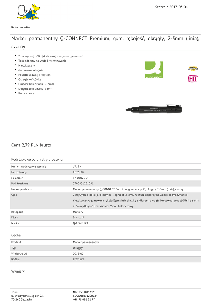 Szczecin 2017-03-04 Karta produktu: Marker permanentny Q-CONNECT Premium, gum. rękojeść, okrągły, 2-3mm (linia), czarny Z najwyższej półki jakościowej - segment „premium” Tusz odporny na wodę i rozmazywanie Nietoksyczny Gumowana rękojeść Posiada skuwkę z klipsem Okrągła końcówka Grubość linii pisania: 2-3mm Długość linii pisania: 350m Kolor czarny Cena 2,79 PLN brutto Podstawowe parametry produktu Numer produktu w systemie 17199 Nr dostawcy KF26105 Nr Celcen 17-01026-7 Kod kreskowy 5705831261051 Nazwa produktu Marker permanentny Q-CONNECT Premium, gum. rękojeść, okrągły, 2-3mm (linia), czarny Opis Z najwyższej półki jakościowej - segment „premium”; tusz odporny na wodę i rozmazywanie; nietoksyczny; gumowana rękojeść; posiada skuwkę z klipsem; okrągła końcówka; grubość linii pisania: 2-3mm; długość linii pisania: 350m; kolor czarny Kategoria Markery Klasa Standard Marka Q-CONNECT Cecha Produkt Marker permenentny Typ Okrągły W ofercie od 2013-02 Rodzaj Premium Wymiary Toris ul. Władysława Jagieły 9/1 70-260 Szczecin NIP: 8521011619 REGON: 811220024 +48 91 482 51 77 Szczecin 2017-03-04 Karta katalogowa produktu cd. Marker permanentny Q-CONNECT Premium, gum. rękojeść, okrągły, 2-3mm (linia), czarny Końcówka (mm) 2-3 Grubość linii (mm) 2-3 Dł. linii (m) 350 Wspólny słownik zamówień CPV 30192125-3 Pisaki Certyfikaty Hit Hit Nowy produkt w ofercie Standard Kolor Kolor Czarny Pozostałe zdjęcia produktu Serdecznie zapraszamy do współpracy Toris zespół. Toris ul. Władysława Jagieły 9/1 70-260 Szczecin NIP: 8521011619 REGON: 811220024 +48 91 482 51 77