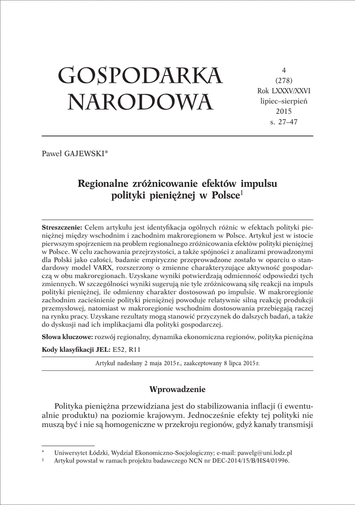 Paweł Gajewski, Regionalne zróżnicowanie efektów impulsu polityki pieniężnej w Polsce Gospodarka narodowa 27 4 (278) Rok LXXXV/XXVI lipiec–sierpień 2015 s. 27–47 Paweł GAJEWSKI* Regionalne zróżnicowanie efektów impulsu polityki pieniężnej w Polsce1 Streszczenie: Celem artykułu jest identyfikacja ogólnych różnic w efektach polityki pieniężnej między wschodnim i zachodnim makroregionem w Polsce. Artykuł jest w istocie pierwszym spojrzeniem na problem regionalnego zróżnicowania efektów polityki pieniężnej w Polsce. W celu zachowania przejrzystości, a także spójności z analizami prowadzonymi dla Polski jako całości, badanie empiryczne przeprowadzone zostało w oparciu o standardowy model VARX, rozszerzony o zmienne charakteryzujące aktywność gospodarczą w obu makroregionach. Uzyskane wyniki potwierdzają odmienność odpowiedzi tych zmiennych. W szczególności wyniki sugerują nie tyle zróżnicowaną siłę reakcji na impuls polityki pieniężnej, ile odmienny charakter dostosowań po impulsie. W makroregionie zachodnim zacieśnienie polityki pieniężnej powoduje relatywnie silną reakcję produkcji przemysłowej, natomiast w makroregionie wschodnim dostosowania przebiegają raczej na rynku pracy. Uzyskane rezultaty mogą stanowić przyczynek do dalszych badań, a także do dyskusji nad ich implikacjami dla polityki gospodarczej. Słowa kluczowe: rozwój regionalny, dynamika ekonomiczna regionów, polityka pieniężna Kody klasyfikacji JEL: E52, R11 Artykuł nadesłany 2 maja 2015 r., zaakceptowany 8 lipca 2015 r. Wprowadzenie Polityka pieniężna przewidziana jest do stabilizowania inflacji (i ewentualnie produktu) na poziomie krajowym. Jednocześnie efekty tej polityki nie muszą być i nie są homogeniczne w przekroju regionów, gdyż kanały transmisji * 1 Uniwersytet Łódzki, Wydział Ekonomiczno-Socjologiczny; e-mail: [email protected] Artykuł powstał w ramach projektu badawczego NCN nr DEC-2014/15/B/HS4/01996. 28 GOSPODARKA NARODOWA nr 4/2015 działają mniej lub bardziej efektywnie w zależności od m.in.: istniejącej struktury przemysłowej, sytuacji demograficznej, wzorców konsumpcyjnych, a także wielu zmiennych związanych z sektorem przedsiębiorstw. W konsekwencji polityka pieniężna może dość istotnie wpływać na dynamikę makroekonomiczną poszczególnych regionów. Wprawdzie ani jej ramy instytucjonalne, ani narzędzia nie stwarzają szerokich możliwości świadomego uwzględniania przestrzennej asymetrii efektów polityki pieniężnej, ale wiedza o zróżnicowanych przestrzennie efektach polityki pieniężnej może pomóc w lepszej kontroli celów polityki gospodarczej kraju i wzmocnić efektywność koordynacji różnych segmentów tej polityki. Z wielu wcześniejszych badań wyłania się obraz Polski jako kraju o silnym regionalnym zróżnicowaniu ekonomicznym i społecznym na wielu płaszczyznach, co powinno czynić problem asymetrii efektów polityki pieniężnej ważnym przedmiotem zainteresowania dla ekonomii stosowanej i polityki ekonomicznej. Tymczasem jest ona jedynym dużym krajem UE, w którym empiryczne analizy w tym obszarze nie były dotychczas podejmowane. Celem artykułu jest próba wskazania ogólnych różnic w reakcjach na impulsy polityki pieniężnej w dwóch wyodrębnionych na potrzeby badania makroregionów, z jednej strony charakteryzujących się odmiennymi charakterystykami mogącymi wpływać na mechanizm transmisji polityki pieniężnej, a z drugiej – o relatywnie wysokiej wewnętrznej homogeniczności. Wnioski są formułowane na podstawie przebiegu funkcji reakcji na impuls wygenerowanych z oszacowanego modelu VARX. Wykorzystana metoda jest z jednej strony mocno osadzona w literaturze poświęconej skutkom impulsów pieniężnych, a z drugiej – spójna z wcześniejszymi analizami empirycznymi prowadzonymi m.in. dla Polski jako całości. Struktura artykułu jest następująca. Druga część zawiera przegląd literatury. Trzecia część poświęcona jest identyfikacji dwóch makroregionów (wschodniego i zachodniego) oraz omówieniu danych statystycznych wykorzystywanych w badaniu empirycznym. W czwartej części zaprezentowano metodę empiryczną. Piąta część przedstawia wyniki analiz empirycznych. W szóstej części znajduje się podsumowanie i wnioski. Przegląd literatury Z teoretycznego punktu widzenia problem regionalnego zróżnicowania efektów polityki pieniężnej można rozpatrywać w odniesieniu do teorii optymalnego obszaru walutowego (TOOW), wywodzącej się z prac Mundella [1961], McKinnona [1963] i Kenena [1969], a następnie była rozwijana w innych opracowaniach2. W świetle tej teorii uczestnictwo w unii walutowej 2 Na przestrzeni lat teoria ta ewoluowała w różnych kierunkach. Szczegółowe omówienie TOOW i jej rozszerzeń wykracza jednak poza zakres artykułu, natomiast można je znaleźć w pracach m.in. Piłat [2012; 2014]. Paweł Gajewski, Regionalne zróżnicowanie efektów impulsu polityki pieniężnej w Polsce 29 wiąże się z ryzykiem zarówno występowania szoków asymetrycznych, jak i asymetrycznej odpowiedzi na szoki wspólne. Asymetria szoków może być związana z odmiennymi strukturami ekonomicznymi, różnym stopniem otwartości gospodarek i dywersyfikacji ich rynków zbytu, a także różnicami regulacyjnymi, przekładającymi się np. na stopień sztywności rynków pracy i produktu. Wszystkie te odmienności mogą skutkować obniżeniem korelacji cykli koniunkturalnych i generować nieadekwatność wspólnej polityki pieniężnej dla poszczególnych krajów i regionów. W nawiązaniu do TOOW, wiele opracowań podejmowało problem napięć związanych ze wspólną polityką pieniężną w krajach UGiW. Clarida i in. [1998] dowodzą występowania znacznych napięć polityki pieniężnej w Wielkiej Brytanii, Francji i Włoszech jeszcze w latach 80. i na początku lat 90. XX wieku, czyli wprawdzie przed utworzeniem UGiW, ale już w warunkach 