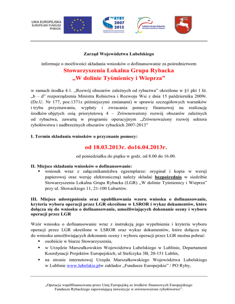 Zarząd Województwa Lubelskiego informuje o możliwości składania wniosków o dofinansowanie za pośrednictwem Stowarzyszenia Lokalna Grupa Rybacka ,,W dolinie Tyśmienicy i Wieprza” w ramach środka 4.1. ,,Rozwój obszarów zależnych od rybactwa” określone w §1 pkt 1 lit. „b – d” rozporządzenia Ministra Rolnictwa i Rozwoju Wsi z dnia 15 października 2009r. (Dz.U. Nr 177, poz.1371z późniejszymi zmianami) w sprawie szczegółowych warunków i trybu przyznawania, wypłaty i zwracania pomocy finansowej na realizację środków objętych osią priorytetową 4 – Zrównoważony rozwój obszarów zależnych od rybactwa, zawartą w programie operacyjnym „Zrównoważony rozwój sektora rybołówstwa i nadbrzeżnych obszarów rybackich 2007-2013” I. Termin składania wniosków o przyznanie pomocy: od 18.03.2013r. do16.04.2013r. od poniedziałku do piątku w godz. od 8.00 do 16.00. II. Miejsce składania wniosków o dofinansowanie: wniosek wraz z załącznikami(dwa egzemplarze: oryginał i kopia w wersji papierowej oraz wersję elektroniczną) należy składać bezpośrednio w siedzibie Stowarzyszenia Lokalna Grupa Rybacka (LGR) ,,W dolinie Tyśmienicy i Wieprza” przy ul. Słowackiego 11, 21-100 Lubartów. III. Miejsce udostępnienia oraz opublikowania wzoru wniosku o dofinansowanie, kryteria wyboru operacji przez LGR określone w LSROR i wykaz dokumentów, które dołącza się do wniosku o dofinansowanie, umożliwiających dokonanie oceny i wyboru operacji przez LGR Wzór wniosku o dofinansowanie wraz z instrukcją jego wypełnienia i kryteria wyboru operacji przez LGR określone w LSROR oraz wykaz dokumentów, które dołącza się do wniosku umożliwiających dokonanie oceny i wyboru operacji przez LGR można pobrać: osobiście w biurze Stowarzyszenia, w Urzędzie Marszałkowskim Województwa Lubelskiego w Lublinie, Departament Koordynacji Projektów Europejskich, ul Stefczyka 3B, 20-151 Lublin, na stronie internetowej Urzędu Marszałkowskiego Województwa Lubelskiego w Lublinie www.lubelskie.plw zakładce „Fundusze Europejskie” / PO Ryby, „Operacja współfinansowana przez Unię Europejską ze środków finansowych Europejskiego Funduszu Rybackiego zapewniającą inwestycje w zrównoważone rybołówstwo”. na stronie internetowej Stowarzyszenia Lokalna Grupa Rybacka ,,W dolinie Tyśmienicy i Wieprza” www.lgr-lubelskie.pl,w zakładce „Nabory wniosków” IV. Limit dostępnych środków na konkurs w ramach środka 4.1. ,,Rozwój obszarów zależnych od rybactwa” określone w §1 pkt 1: lit. b – restrukturyzacja lub reorientacja działalności gospodarczej, lub dywersyfikacja zatrudnienia osób mających pracę związaną z sektorem rybactwa, w drodze tworzenia dodatkowych miejsc pracy poza tym sektorem dla sektora społecznego i gospodarczego: 900 000,00 zł; lit. c – podnoszenie wartości produktów rybactwa, rozwój usług na rzecz społeczności zamieszkującej obszary zależne od rybactwa dla sektora społecznego i gospodarczego:900 000,00 zł; lit. d – ochrona środowiska lub dziedzictwa przyrodniczego na obszarach zależnych od rybactwa w celu utrzymania jego atrakcyjności lub przywrócenia potencjału produkcyjnego sektora rybactwa, w przypadku jego zniszczenia w wyniku klęski żywiołowej dla sektora publicznego:200 000,00 zł; dla sektora społecznego i gospodarczego:600 000,00 zł. V. Dodatkowe informacje: Więcej informacji o sposobie ubiegania się o dofinansowanie można uzyskać w biurze Stowarzyszenia LGR „W dolinie Tyśmienicy i Wieprza” ul. Słowackiego 11, 21-100 Lubartów, tel. 81 85 10 222, kom. 533 363 332, email: [email protected] w Urzędzie Marszałkowskim Województwa Lubelskiego w Lublinie, ul. Stefczyka 3B, 20-151 Lublin, tel. 81 44 16 881, email: [email protected] „Operacja współfinansowana przez Unię Europejską ze środków finansowych Europejskiego Funduszu Rybackiego zapewniającą inwestycje w zrównoważone rybołówstwo”.