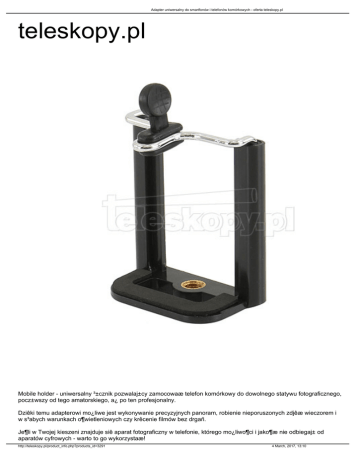 Adapter uniwersalny do smartfonów i telefonów komórkowych - oferta teleskopy.pl teleskopy.pl Mobile holder - uniwersalny ³±cznik pozwalaj±cy zamocowaæ telefon komórkowy do dowolnego statywu fotograficznego, pocz±wszy od tego amatorskiego, a¿ po ten profesjonalny. Dziêki temu adapterowi mo¿liwe jest wykonywanie precyzyjnych panoram, robienie nieporuszonych zdjêæ wieczorem i w s³abych warunkach o¶wietleniowych czy krêcenie filmów bez drgañ. Je¶li w Twojej kieszeni znajduje siê aparat fotograficzny w telefonie, którego mo¿liwo¶ci i jako¶æ nie odbiegaj± od aparatów cyfrowych - warto to go wykorzystaæ! http://teleskopy.pl/product_info.php?products_id=3291 4 March, 2017, 13:10 Adapter uniwersalny do smartfonów i telefonów komórkowych - oferta teleskopy.pl • zakres regulacji klamry do smartfona (szer.): 5,5 - 8 cm • wymiary: 70 mm (wysoko¶æ), 56 mm (szeroko¶æ) • metalowy gwint statywowy 1/4 cala • uchwyt wy³o¿ony gum± antypo¶lizgow± Ciekawostka Po zamocowaniu adaptera na gwincie 1/4 cala na tubie optycznej teleskopu (wiele teleskopów taki gwint posiada) i zainstalowaniu oprogramowania na smartfon, mo¿na uzyskaæ "rêczny system naprowadzania na obiekt", zwany z angielskiego PushTo (pchnij do). Przyk³adowe oprogramowanie: SkEye, na system Android lub SkySafari, p³atne, od 2,99 USD, na iOS i Android. http://teleskopy.pl/product_info.php?products_id=3291 4 March, 2017, 13:10
