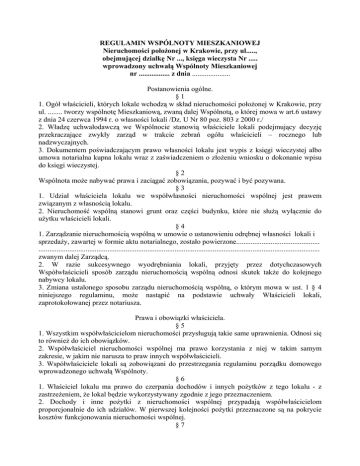 REGULAMIN WSPÓLNOTY MIESZKANIOWEJ Nieruchomości położonej w Krakowie, przy ul....., obejmującej działkę Nr ..., księga wieczysta Nr ..... wprowadzony uchwałą Wspólnoty Mieszkaniowej nr ................. z dnia ..................... Postanowienia ogólne. §1 1. Ogół właścicieli, których lokale wchodzą w skład nieruchomości położonej w Krakowie, przy ul. ........ tworzy wspólnotę Mieszkaniową, zwaną dalej Wspólnotą, o której mowa w art.6 ustawy z dnia 24 czerwca 1994 r. o własności lokali /Dz. U Nr 80 poz. 803 z 2000 r./ 2. Władzę uchwałodawczą we Wspólnocie stanowią właściciele lokali podejmujący decyzję przekraczające zwykły zarząd w trakcie zebrań ogółu właścicieli – rocznego lub nadzwyczajnych. 3. Dokumentem poświadczającym prawo własności lokalu jest wypis z księgi wieczystej albo umowa notarialna kupna lokalu wraz z zaświadczeniem o złożeniu wniosku o dokonanie wpisu do księgi wieczystej. §2 Wspólnota może nabywać prawa i zaciągać zobowiązania, pozywać i być pozywana. §3 1. Udział właściciela lokalu we współwłasności nieruchomości wspólnej jest prawem związanym z własnością lokalu. 2. Nieruchomość wspólną stanowi grunt oraz części budynku, które nie służą wyłącznie do użytku właścicieli lokali. §4 1. Zarządzanie nieruchomością wspólną w umowie o ustanowieniu odrębnej własności lokali i sprzedaży, zawartej w formie aktu notarialnego, zostało powierzone.............................................. ........................................................................................................................................................... zwanym dalej Zarządcą. 2. W razie sukcesywnego wyodrębniania lokali, przyjęty przez dotychczasowych Współwłaścicieli sposób zarządu nieruchomością wspólną odnosi skutek także do kolejnego nabywcy lokalu. 3. Zmiana ustalonego sposobu zarządu nieruchomością wspólną, o którym mowa w ust. 1 § 4 niniejszego regulaminu, może nastąpić na podstawie uchwały Właścicieli lokali, zaprotokołowanej przez notariusza. Prawa i obowiązki właściciela. §5 1. Wszystkim współwłaścicielom nieruchomości przysługują takie same uprawnienia. Odnosi się to również do ich obowiązków. 2. Współwłaściciel nieruchomości wspólnej ma prawo korzystania z niej w takim samym zakresie, w jakim nie narusza to praw innych współwłaścicieli. 3. Współwłaściciele lokali są zobowiązani do przestrzegania regulaminu porządku domowego wprowadzonego uchwałą Wspólnoty. §6 1. Właściciel lokalu ma prawo do czerpania dochodów i innych pożytków z tego lokalu - z zastrzeżeniem, że lokal będzie wykorzystywany zgodnie z jego przeznaczeniem. 2. Dochody i inne pożytki z nieruchomości wspólnej przypadają współwłaścicielom proporcjonalnie do ich udziałów. W pierwszej kolejności pożytki przeznaczone są na pokrycie kosztów funkcjonowania nieruchomości wspólnej. §7 1. Właściciel ponosi wydatki związane z utrzymaniem jego lokalu oraz uczestniczy w kosztach zarządu związanych z utrzymaniem nieruchomości wspólnej. 2. Na koszty zarządu nieruchomością wspólną składają się w szczególności: a/ wydatki na remonty i bieżącą konserwację; b/ opłaty za dostawę energii elektrycznej, gazu i wody, w części wspólnej, oraz antenę zbiorczą i domofony; c/ ubezpieczenia, podatki i inne opłaty publicznoprawne, chyba że są pokrywane bezpośrednio przez właścicieli lokali; d/ wydatki na utrzymanie porządku i czystości; e/ wynagrodzenie zarządcy; 3.Wyodrębniony fundusz remontowy Wspólnoty powstaje z zaliczek wnoszonych przez właścicieli lokali. Środki zgromadzone na funduszu remontowym mogą być wykorzystywane na podstawie uchwały Wspólnoty, z uwzględnieniem postanowień zawartych w ust. 8 i 9 § 7 niniejszego regulaminu. 4. Na pokrycie kosztów zarządu nieruchomością wspólną i fundusz remontowy właściciele uiszczają zaliczki w formie bieżących opłat, płatne z góry do 10 dnia każdego miesiąca. 5. Wpłat należy dokonywać na rachunek bankowy Wspólnoty albo do kasy Zarządcy. 6. Od zaległości w uiszczaniu opłat, o których mowa w ust. 4 § 7 niniejszego regulaminu, będą naliczane odsetki ustawowe. 7. W przypadku podwyższenia przez dostawców cen za usługi oraz opłat wpływających na wysokość kosztów zarządu, opłata należna od właścicieli lokali ulegnie od dnia podwyżek proporcjonalnemu wzrostowi. O każdej regulacji Zarządca powiadomi właścicieli lokali. 8. W przypadku wystąpienia konieczności wykonania prac przekraczających zakres bieżącej konserwacji, Zarządca może samodzielnie podjąć decyzję o wykonaniu robót i pokryciu z funduszu remontowego, z jednoczesnym powiadomieniem właścicieli lokali tworzących wspólnotę. 9. Zarządcy przysługuje prawo zaspokajania z funduszu remontowego wszelkich ciążących na Wspólnocie, jak również na poszczególnych jej członkach, zobowiązań z tytułu wykonywania zarządu. Nie zwalnia to Zarządcy z obowiązku dochodzenia w postępowaniu sądowym zapłaty tych należności, w celu uzupełnienia funduszu remontowego. §8 1. Na żądanie Zarządcy właściciel lokalu jest zobowiązany zezwalać na wstęp do lokalu, Ilekroć jest to niezbędne do przeprowadzenia konserwacji, remontu albo usunięcia awarii w nieruchomości wspólnej. 2. Właściciel lokalu ma obowiązek podania Zarządcy swojego adresu do korespondencji. Właściciel, który nie powiadomił Zarządcy o zmianie miejsca pobytu lub adresu do korespondencji, ponosi odpowiedzialność za szkody, jakie mogą wynikać z braku takiej informacji. Prawa i obowiązki Zarządcy. §9 1. Zarządca, któremu zarząd nieruchomością wspólną powierzono w sposób określony w art. 18 ust. 1 ustawy z dnia 24 czerwca 1994 r. o własności lokali – podejmuje decyzje samodzielnie we wszystkich czynnościach w zakresie zwykłego zarządu. 2. Do podj