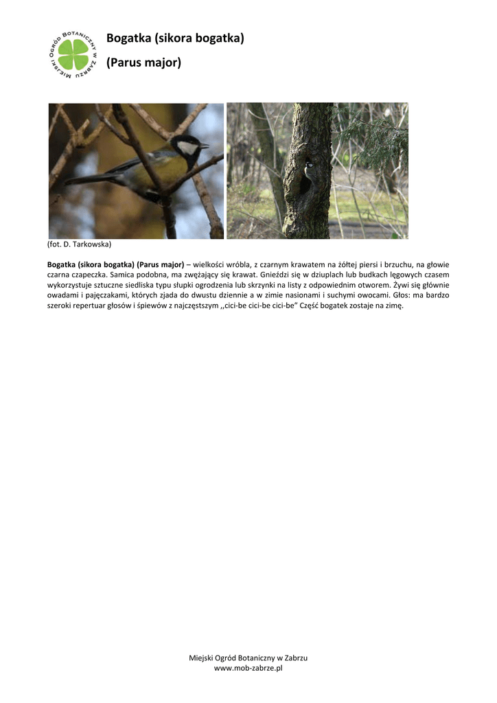 Bogatka (sikora bogatka) (Parus major) (fot. D. Tarkowska) Bogatka (sikora bogatka) (Parus major) – wielkości wróbla, z czarnym krawatem na żółtej piersi i brzuchu, na głowie czarna czapeczka. Samica podobna, ma zwężający się krawat. Gnieździ się w dziuplach lub budkach lęgowych czasem wykorzystuje sztuczne siedliska typu słupki ogrodzenia lub skrzynki na listy z odpowiednim otworem. Żywi się głównie owadami i pajęczakami, których zjada do dwustu dziennie a w zimie nasionami i suchymi owocami. Głos: ma bardzo szeroki repertuar głosów i śpiewów z najczęstszym ,,cici‐be cici‐be cici‐be” Część bogatek zostaje na zimę. Miejski Ogród Botaniczny w Zabrzu www.mob‐zabrze.pl