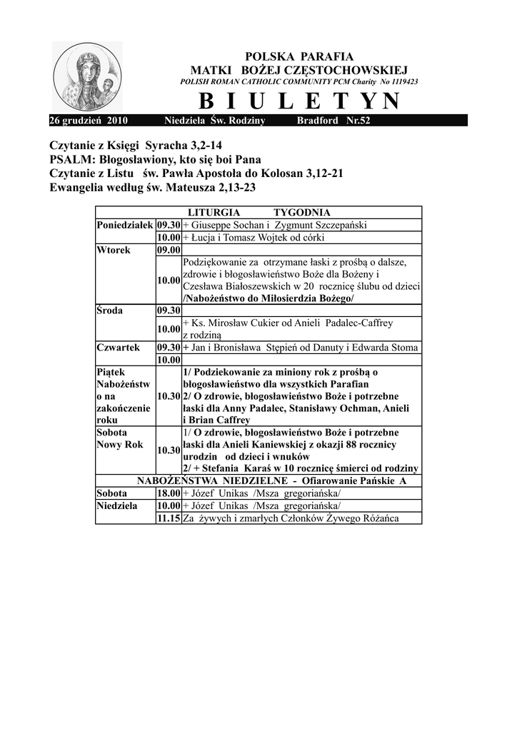 POLSKA PARAFIA MATKI BOŻEJ CZĘSTOCHOWSKIEJ POLISH ROMAN CATHOLIC COMMUNITY PCM Charity No 1119423 B I U L E T YN 26 grudzień 2010 Niedziela Św. Rodziny Bradford Nr.52 Czytanie z Księgi Syracha 3,2-14 PSALM: Błogosławiony, kto się boi Pana Czytanie z Listu św. Pawła Apostoła do Kolosan 3,12-21 Ewangelia według św. Mateusza 2,13-23 LITURGIA TYGODNIA Poniedziałek 09.30 + Giuseppe Sochan i Zygmunt Szczepański 10.00 + Łucja i Tomasz Wojtek od córki Wtorek 09.00 Podziękowanie za otrzymane łaski z prośbą o dalsze, zdrowie i błogosławieństwo Boże dla Bożeny i 10.00 Czesława Białoszewskich w 20 rocznicę ślubu od dzieci /Nabożeństwo do Miłosierdzia Bożego/ Środa 09.30 + Ks. Mirosław Cukier od Anieli Padalec-Caffrey 10.00 z rodziną Czwartek 09.30 + Jan i Bronisława Stępień od Danuty i Edwarda Stoma 10.00 Piątek 1/ Podziekowanie za miniony rok z prośbą o Nabożeństw błogosławieństwo dla wszystkich Parafian o na 10.30 2/ O zdrowie, błogosławieństwo Boże i potrzebne zakończenie łaski dla Anny Padalec, Stanisławy Ochman, Anieli roku i Brian Caffrey Sobota 1/ O zdrowie, błogosławieństwo Boże i potrzebne Nowy Rok łaski dla Anieli Kaniewskiej z okazji 88 rocznicy 10.30 urodzin od dzieci i wnuków 2/ + Stefania Karaś w 10 rocznicę śmierci od rodziny NABOŻEŃSTWA NIEDZIELNE - Ofiarowanie Pańskie A Sobota 18.00 + Józef Unikas /Msza gregoriańska/ Niedziela 10.00 + Józef Unikas /Msza gregoriańska/ 11.15 Za żywych i zmarłych Członków Żywego Różańca Lektorzy - Sobota 01.01.2011 g.18.00 - M. Kączkowska Niedziela 26.12.2011 g. 10.00 - J. Nowicki g. 11.15 – Różaniec Dyżur przedstawiciela PRD Sali św. Brata Alberta, sobota i niedziela 01-02.01.2011J.J. Nowicki OFIARY Na potrzeby kościoła – Aim Language Classes £ 360; Wynajem POK-u £100; Z pogrzebu Ś.P. Heleny Kłysz £51.10. Na kwiaty – H. Kossak £10. Gift Aid 20.11.2010 - £ 49 Druga taca na potrzeby Parafii 19.12.2010 - £ 192.37 Jeżeli ktoś z Parafian pragnie złożyć ofiarę czekiem/na dowolny cel parafialny/, prosimy go wypisać na –L.P.C.M. BRADFORD. Wszystkim ofiarodawcom składamy serdeczne podziękowanie za złożone ofiary na nasze cele parafialne. Bóg zapłać. *** OGŁOSZENIA DUSZPASTERSKIE ***. 1. Dzisiejsza, ostatnia niedziela kończącego się 2010 roku, jest świętem Świętej Rodziny Nazaretańskiej: Jezusa, Maryi i Józefa. Jest to bardzo stosowny moment, aby baczniej spojrzeć na nasze rodziny. Wpatrując się w Ikonę Świętej Rodziny, łatwiej zrozumiemy nasze powołanie do życia w rodzinie. Ona jest wzorem dla naszych rodzin. Pamiętajmy, że zadaniem każdego chrześcijanina jest przede wszystkim troska o własne zbawienie. Dla wszystkich powołanych do życia małżeńskiego i rodzinnego ta troska wyraża się poprzez dobre i przykładne, godne życie w rodzinie i poprzez rodzinę. Prośmy Boga, aby w tych niełatwych czasach, przy tylu zagrożeniach i celowych atakach różnorakich wrogów nasze rodziny stawały się prawdziwym domowym Kościołem. A zawierając autentyczną przyjaźń ze Świętą Rodziną, uczmy się sztuki budowania więzi w oparciu o prawdziwą miłość. 2. Podczas specjalnego nabożeństwa dziękczynno-przebłagalnego w naszym kościele, które będziemy celebrowali w piątego, 31 grudnia, o godz.10.30, podziękujemy Bogu – Dobremu Ojcu w Niebie za miniony czas, za dobro, któregośmy w tym czasie doznali. Przeprosimy za wszelkie błędy i odejścia od miłości. Będziemy również prosić o dalsze błogosławieństwo nad nami, naszymi rodzinami i nad naszą Ojczyzną. W tym czasie warto zapytać siebie: jak wygląda moje życie, jak wygląda moja relacja z Panem Bogiem, czy i na ile wypełniam moje chrześcijańskie zobowiązanie dawania świadectwa wiary wobec bliźnich? Za publiczne odśpiewanie hymnu „Ciebie, Boga, wysławiamy” podczas tego nabożeństwa będzie można uzyskać odpust zupełny. 3. Na początku Nowego Roku w naszej Parafii rozpoczną się odwiedziny duszpasterskie, zwane kolędą. Pragniemy odwiedzić naszych Parafian, aby zanieść do ich domów i rodzin Boże błogosławieństwo. Będzie to przede wszystkim wizyta duszpasterska, podczas której zapraszam wszystkich do wspólnej modlitwy, do zastanowienia się nad naszymi praktykami religijnymi. Kolęda ma także służyć lepszemu wzajemnemu poznaniu się, zbliżeniu duszpasterza do powierzonych jego trosce parafian i odwrotnie. Niech to będzie okazja do rozmowy o radościach i smutkach odwiedzanych rodzin oraz o wspólnych sprawach całej naszej wspólnoty parafialnej. Pamiętajmy, że chrześcijanin przyjmujący kolędującego kapłana daje niejako świadectwo swojej przynależności do Kościoła. Przeżywajmy te odwiedziny kolędowe w duchu bożonarodzeniowej radości, w duchu modlitwy i serdecznej rozmowy z duszpasterzem. Lekcje Callana: Kontakt:Krystyna Trybuła tel.0788 7847 935. Wszystkich naszych Rodaków, którzy chcą należeć do naszej Parafii serdecznie zapraszamy i prosimy o wypełnienie przygotowanego formularza i zwrócenie go duszpasterzowi. Przygotowujący się do sakramentu małżeństwa mogą uczestniczyć w specjalnych katechezach dla narzeczonych i uzyskać dyplom ukończenia kursu z poradnia rodzinną. Następny kurs będzie 19 i 20 lutego 2011/sobota i niedziela/ w g.18.00-22.00 Prosimy o zapisy. Parafialna Rada Duszpasterska, serdecznie zaprasza na uroczysty opłatek, połączony z obiadem w naszym ośrodku parafialnym, który odbędzie się 16 stycznia 2011 o g.13.00. Bilety w cenie Ł 6 do nabycia w Sali Św. Brata Alberta. ”Święta i zbawienna jest myśl modlić się za umarłych, aby od grzechów byli uwolnieni” 2 Mach 12,45. Z naszej wspólnoty parafialnej odeszła do wieczności 12.12.2010 Ś.P. HELENA KŁYSZ L.86 . Polećmy ja Bożemu Miłosierdziu w naszych osobistych modlitwach. W naszej wspólnocie – patrząc na miniony rok. Polecajmy modlitwie zmarłych w 2010 roku w naszej wspólnocie Parafian: 