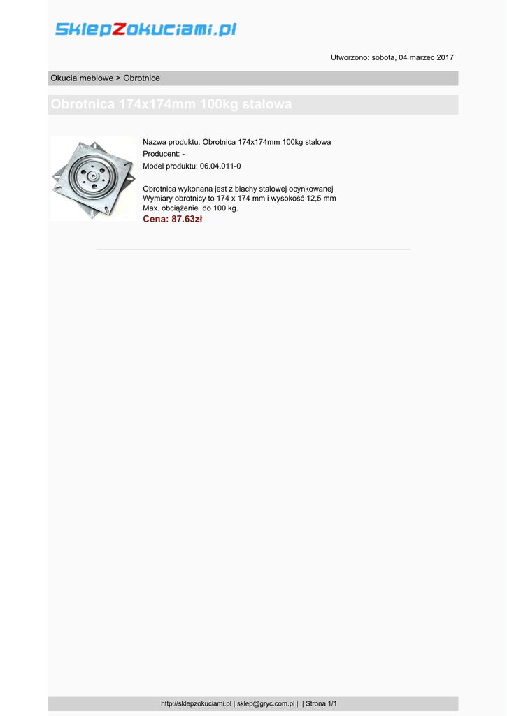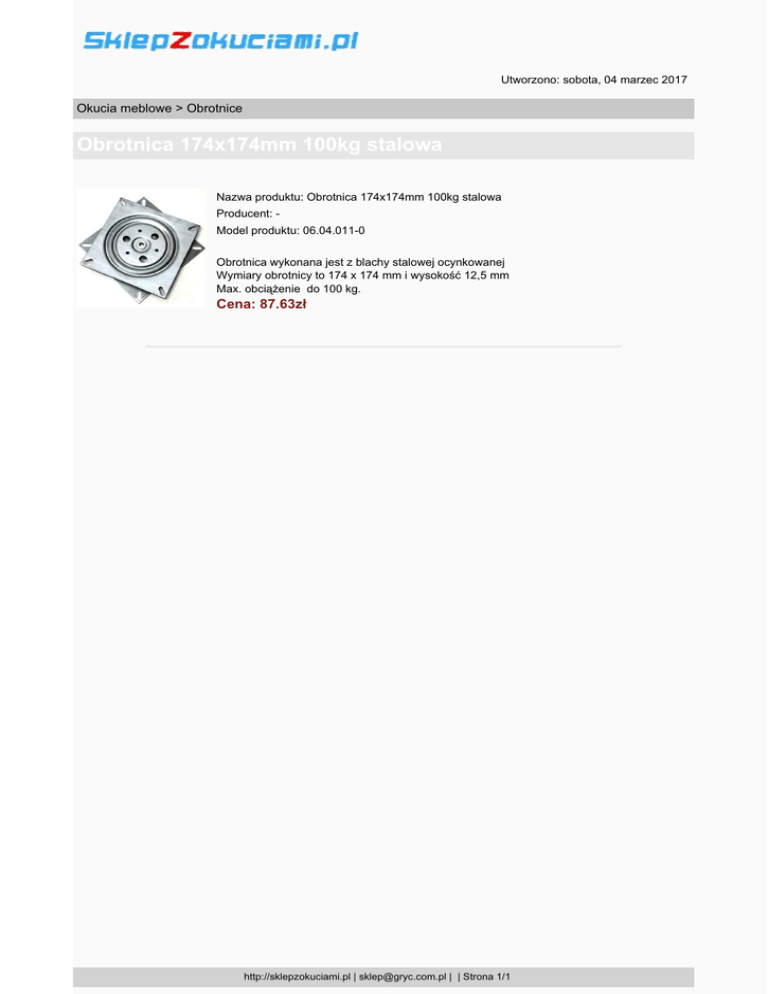 Utworzono: sobota, 04 marzec 2017 Okucia meblowe > Obrotnice Obrotnica 174x174mm 100kg stalowa Nazwa produktu: Obrotnica 174x174mm 100kg stalowa Producent: Model produktu: 06.04.011-0 Obrotnica wykonana jest z blachy stalowej ocynkowanej Wymiary obrotnicy to 174 x 174 mm i wysokość 12,5 mm Max. obciążenie do 100 kg. Cena: 87.63zł http://sklepzokuciami.pl | [email protected] | | Strona 1/1