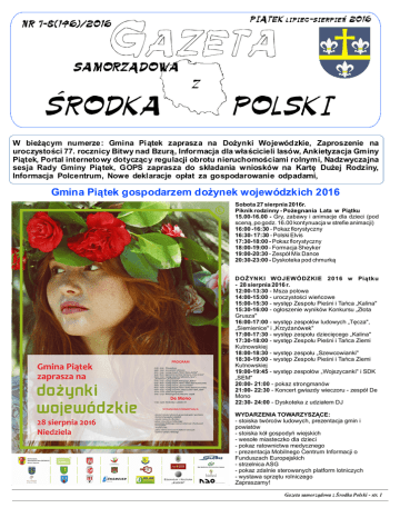 W bie cym numerze: Gmina Pi tek zaprasza na Do ynki Wojewódzkie, Zaproszenie na uroczysto ci 77. rocznicy Bitwy nad Bzur , Informacja dla w cicieli lasów, Ankietyzacja Gminy Pi tek, Portal internetowy dotycz cy regulacji obrotu nieruchomo ciami rolnymi, Nadzwyczajna sesja Rady Gminy Pi tek, GOPS zaprasza do sk adania wniosków na Kart Du ej Rodziny, Informacja Polcentrum, Nowe deklaracje op at za gospodarowanie odpadami, Gmina Pi tek gospodarzem do ynek wojewódzkich 2016 Sobota 27 sierpnia 2016r. Piknik rodzinny - Po egnania Lata w Pi tku 15.00-16.00 - Gry, zabawy i animacje dla dzieci (pod scen , po godz. 16.00 kontynuacja w strefie animacji) 16:00 -16:30 - Pokaz florystyczny 16:30- 17:30 - Polski Elvis 17:30-18:00 - Pokaz florystyczny 18:00-19:00 - Formacja Sheyker 19:00-20:30 - Zespó Mix Dance 20:30-23:00 - Dyskoteka pod chmurk DO YN KI WOJEWÓDZKIE 2016 w Pi tku - 28 sierpnia 2016 r. 12:00-13:30 - Msza polowa 14:00-15:00 - uroczysto ci wie cowe 15:00-15:30 - wyst p Zespo u Pie ni i Ta ca „Kalina" 15:30-16:00 - og oszenie wyników Konkursu „Z ota Grusza" 16:00-17:00 - wyst p zespo ów ludowych „T cza", „Siemienice" i „Krzy anówek" 17:00-17:30 - wyst p zespo u dzieci cego „Kalina" 17:30-18:00 - wyst p Zespo u Pie ni i Ta ca Ziemi Kutnowskiej 18:00-18:30 - wyst p zespo u „Szewcowianki" 18:30-19:00 - wyst p Zespo u Pie ni i Ta ca Ziemi Kutnowskiej 19:00-19:45 - wyst p zespo ów „Wojszycanki" i SDK „SEM" 20:00- 21:00 - pokaz strongmanów 21:00- 22:30 - Koncert gwiazdy wieczoru - zespó De Mono 22:30- 24:00 - Dyskoteka z udzia em DJ WYDARZENIA TOWARZYSZ CE: - stoiska twórców ludowych, prezentacja gmin i powiatów - stoiska kó gospody wiejskich - weso e miasteczko dla dzieci - pokaz ratownictwa medycznego - prezentacja Mobilnego Centrum Informacji o Funduszach Europejskich - strzelnica ASG - pokaz zdalnie sterowanych platform lotniczych - wystawa sprz tu rolniczego Zapraszamy! Gazeta samorz dowa z rodka Polski - str. 1 Uroczysto 77. rocznicy Bitwy nad Bzur K om i t e t O r g a n iz a c y j n y za p r a s za serdecznie mieszka ców Gminy Pi tek na uroczysto obchodów 77. rocznicy Bitwy nad Bzur , która odb dzie si w Pi tku, w niedziel 11 wrze nia 2016 r. Program uroczysto ci: 11:45 - Zbiórka uczestników uroczysto ci Na rynku (przed budynkiem Urz du Gminy Pi tek), przemarsz do ko cio a pw. w. Trójcy, 12:00 - Msza w. 13:00 - Przemarsz kompanii honorowej i uczestników uroczysto ci pod pomnik Bohaterów Bitwy nad Bzur przy ZSMR w Pi tku - ul. Kutnowska 19 13:15 - rozpocz cie uroczysto ci: - wyst pienie Wójta Gminy Pi tek - przemówienia - apel poleg ych - salwa honorowa - z enie kwiatów pod pomnikiem - defilada pododdzia u Zapraszamy serdecznie! Informacja dla cicieli lasów U prze jm ie in fo rmu j e Min ist er rodowiska powiadomi Wojewodów pismem z dnia 20 czerwca 2016 r., znak: DLP-I.062.3.2016.EL o prowadzeniu w latach 2016 - 2020 prac obserwacyjnopomiarowych programu monitoringu lasów wszystkich form w asno ci. Program monitoringu lasów wchodzi w zakres Pa stwowego Monitoringu rodowiska, a zebrane wyniki pos do oceny stanu zdrowotno ci lasów w Polsce w stosunku do zmieniaj cych si warunków rodowiska. Prace terenowe b si odbywa coroczn ie n a s t a y c h po w ie r zch n iac h obserwacyjnych rozmieszczonych w sieci 8x8 km, które s cz ci stszej (4km x 4km) sieci wielkoobszarowej inwentaryzacji stanu lasu zaplanowanej na lata 20152019. Pomiary i obserwacje wykonywane s zgodnie z instrukcj opracowan przez Instytut Badawczy Le nictwa, a zaakceptowan przez Dyrekcj Generaln Lasów Pa stw owyc h, G ówny Inspe kt ora t Ochrony rodowiska i Ministerstwo rodowiska. Prace terenowe b wykonywane przez pracowników Instytutu Badawczego Le nictwa lub przez osoby upowa nione przez Instytut w okresie od 1 czerwca - 30 wrze nia w latach 2016-2020. W zwi zku z powy szym, uprzejmie prosz cicie li lasów n iesta now i cych asno ci Skarbu Pa stwa (w tym lasów prywatnych) o umo liwienie wst pu osobom upowa nionym przez Instytut Badawczy Le nictwa na teren lasów celem dokonania obserwacji i pomiarów na sta ych powierzchniach obserwacyjnych. Z up. WOJEWODY ÓDZKIEGO Beata Konieczniak Zast pca Dyrektora Wydzia u Infrastruktury Gazeta samorz dowa z rodka Polski - str. 2 Ankietyzacja Gminy Pi tek Informujemy, e na terenie Gminy Pi tek w okresie sierpie – wrzesie 2016 roku prowadzona jest ankietyzacja (poprzez spis z natury) w ród mieszka ców przez Pracowników firmy Ekolog Sp. z o.o. z Poznania. W zwi zku z tym, zwracamy si z serdeczn pro o udzielanie wyczerpuj cych odpowiedzi na zadane przez Ankieterów pytania. W razie pyta mo na kontaktowa si z Urz dem Gminy Pi tek, ul. Rynek 16; 99-120 Pi tek; tel. 24 722 11 58; 24 722 19 19; [email protected] lub Wykonawc – firm Ekolog Sp. z o.o., ul. wi towidzka 6/4, 61-058 Pozna , która opracowuje „Plan Gospodarki Niskoemisyjnej” tel.: (61) 877 06 05; [email protected] Regulacje obrotu nieruchomo ciami rolnymi w Internecie Agencja Nieruchomo ci Rolnych, Oddzia Terenowy w Warszawie, Filia w odzi uprzejmie informuj e w dniu 15 czerwca br. Agencja Nieruchomo ci Rolnych uruchomi a specjalny serwis internetowy po wi cony nowym przepisom reguluj cym obrót nieruchomo ciami rolnymi. Ser wis dost pny jest pod adresem www.gospodarstwopolska.pl Informacje zamieszczone na portalu kierowane s do rolników oraz osób zainteresowanych gruntami rolnymi. Ponadto istnieje mo liwo skopiowania na asny komputer nowych aktów prawnych oraz zapoznanie si z problemami obejmuj cymi t tematyk . Zach camy do korzystania z tego serwisu informacyjnego. Nadzwyczajna Sesja Rady Gminy Pi tek W czwartek 21 lipca w sali konferencyjnej Urz du Gminy Pi tek odby a si XVIII nadzwyczajna Sesja Rady Gminy Pi tek. Po otwarciu obrad i stwierdzeniu quorum Radni przyj li proponowany porz dek obrad, na który z o si przyj cie trzech uchwa zwi zanych z gospodark odpadami na terenie Gminy Pi tek. Podj te podczas XVIII sesji uchwa y dotyczy y: - przyj cia Regulaminu utrzyma