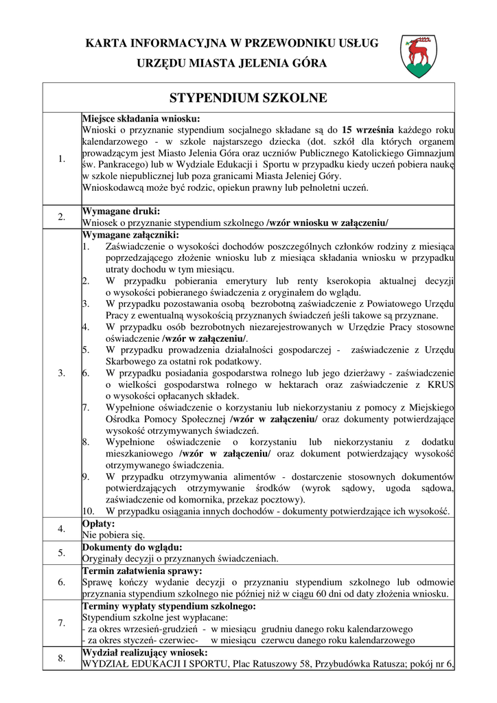 KARTA INFORMACYJNA W PRZEWODNIKU USŁUG URZĘDU MIASTA JELENIA GÓRA STYPENDIUM SZKOLNE 1. 2. 3. 4. 5. 6. 7. 8. Miejsce składania wniosku: Wnioski o przyznanie stypendium socjalnego składane są do 15 września kaŜdego roku kalendarzowego - w szkole najstarszego dziecka (dot. szkół dla których organem prowadzącym jest Miasto Jelenia Góra oraz uczniów Publicznego Katolickiego Gimnazjum św. Pankracego) lub w Wydziale Edukacji i Sportu w przypadku kiedy uczeń pobiera naukę w szkole niepublicznej lub poza granicami Miasta Jeleniej Góry. Wnioskodawcą moŜe być rodzic, opiekun prawny lub pełnoletni uczeń. Wymagane druki: Wniosek o przyznanie stypendium szkolnego /wzór wniosku w załączeniu/ Wymagane załączniki: 1. Zaświadczenie o wysokości dochodów poszczególnych członków rodziny z miesiąca poprzedzającego złoŜenie wniosku lub z miesiąca składania wniosku w przypadku utraty dochodu w tym miesiącu. 2. W przypadku pobierania emerytury lub renty kserokopia aktualnej decyzji o wysokości pobieranego świadczenia z oryginałem do wglądu. 3. W przypadku pozostawania osobą bezrobotną zaświadczenie z Powiatowego Urzędu Pracy z ewentualną wysokością przyznanych świadczeń jeśli takowe są przyznane. 4. W przypadku osób bezrobotnych niezarejestrowanych w Urzędzie Pracy stosowne oświadczenie /wzór w załączeniu/. 5. W przypadku prowadzenia działalności gospodarczej - zaświadczenie z Urzędu Skarbowego za ostatni rok podatkowy. 6. W przypadku posiadania gospodarstwa rolnego lub jego dzierŜawy - zaświadczenie o wielkości gospodarstwa rolnego w hektarach oraz zaświadczenie z KRUS o wysokości opłacanych składek. 7. Wypełnione oświadczenie o korzystaniu lub niekorzystaniu z pomocy z Miejskiego Ośrodka Pomocy Społecznej /wzór w załączeniu/ oraz dokumenty potwierdzające wysokość otrzymywanych świadczeń. 8. Wypełnione oświadczenie o korzystaniu lub niekorzystaniu z dodatku mieszkaniowego /wzór w załączeniu/ oraz dokument potwierdzający wysokość otrzymywanego świadczenia. 9. W przypadku otrzymywania alimentów - dostarczenie stosownych dokumentów potwierdzających otrzymywanie środków (wyrok sądowy, ugoda sądowa, zaświadczenie od komornika, przekaz pocztowy). 10. W przypadku osiągania innych dochodów - dokumenty potwierdzające ich wysokość. Opłaty: Nie pobiera się. Dokumenty do wglądu: Oryginały decyzji o przyznanych świadczeniach. Termin załatwienia sprawy: Sprawę kończy wydanie decyzji o przyznaniu stypendium szkolnego lub odmowie przyznania stypendium szkolnego nie później niŜ w ciągu 60 dni od daty złoŜenia wniosku. Terminy wypłaty stypendium szkolnego: Stypendium szkolne jest wypłacane: - za okres wrzesień-grudzień - w miesiącu grudniu danego roku kalendarzowego - za okres styczeń- czerwiec- w miesiącu czerwcu danego roku kalendarzowego Wydział realizujący wniosek: WYDZIAŁ EDUKACJI I SPORTU, Plac Ratuszowy 58, Przybudówka Ratusza; pokój nr 6, tel. 75 / 75-46-340/344. Tryb odwoławczy: Od decyzji słuŜy prawo wniesienia odwołania do Samorządowego Kolegium Odwoławczego w terminie 14 dni od daty doręczenia decyzji. Opłata za odwołanie: 10. Nie pobiera się. Podstawa prawna: Ustawa z dnia 7 września 1991r. o systemie oświaty (Dz.U. z 2004 roku nr 256, poz 2572 11. ze zm.). Uchwała Rady Miejskiej Jeleniej Góry Nr 492/XLI/2005 z dnia 22 grudnia 2005 roku w sprawie przyjęcia Regulaminu udzielania pomocy materialnej o charakterze socjalnym uczniom zamieszkałym na terenie Miasta Jeleniej Góry. data utworzenia: zatwierdzona przez: Naczelnika Edukacji i Sportu 9.