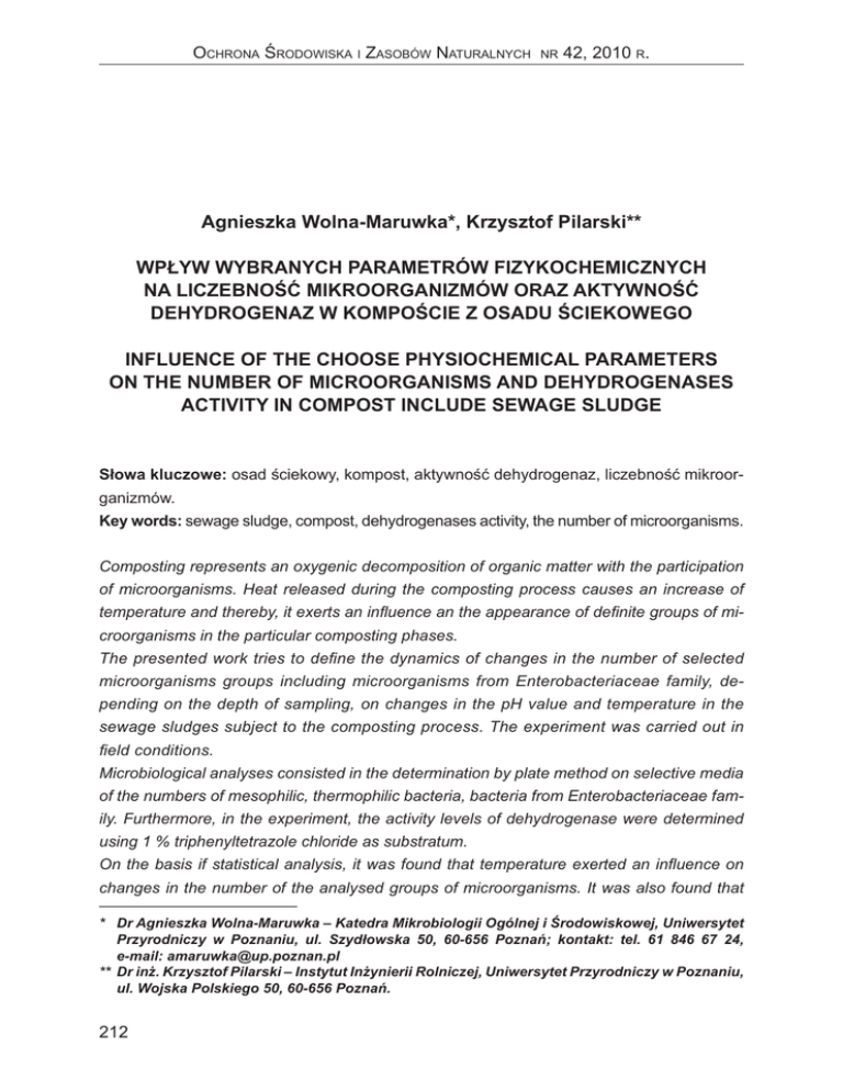 Ochrona Środowiska i Zasobów Naturalnych nr 42, 2010 r. Agnieszka Wolna-Maruwka*, Krzysztof Pilarski** WPŁYW WYBRANYCH PARAMETRÓW FIZYKOCHEMICZNYCH NA LICZEBNOŚĆ MIKROORGANIZMÓW ORAZ AKTYWNOŚĆ DEHYDROGENAZ W KOMPOŚCIE Z OSADU ŚCIEKOWEGO INFLUENCE OF THE CHOOSE PHYSIOCHEMICAL PARAMETERS ON THE NUMBER OF MICROORGANISMS AND DEHYDROGENASES ACTIVITY IN COMPOST INCLUDE SEWAGE SLUDGE Słowa kluczowe: osad ściekowy, kompost, aktywność dehydrogenaz, liczebność mikroorganizmów. Key words: sewage sludge, compost, dehydrogenases activity, the number of microorganisms. Composting represents an oxygenic decomposition of organic matter with the participation of microorganisms. Heat released during the composting process causes an increase of temperature and thereby, it exerts an influence an the appearance of definite groups of microorganisms in the particular composting phases. The presented work tries to define the dynamics of changes in the number of selected microorganisms groups including microorganisms from Enterobacteriaceae family, depending on the depth of sampling, on changes in the pH value and temperature in the sewage sludges subject to the composting process. The experiment was carried out in field conditions. Microbiological analyses consisted in the determination by plate method on selective media of the numbers of mesophilic, thermophilic bacteria, bacteria from Enterobacteriaceae family. Furthermore, in the experiment, the activity levels of dehydrogenase were determined using 1 % triphenyltetrazole chloride as substratum. On the basis if statistical analysis, it was found that temperature exerted an influence on changes in the number of the analysed groups of microorganisms. It was also found that * Dr Agnieszka Wolna-Maruwka – Katedra Mikrobiologii Ogólnej i Środowiskowej, Uniwersytet Przyrodniczy w Poznaniu, ul. Szydłowska 50, 60-656 Poznań; kontakt: tel. 61 846 67 24, e-mail: [email protected] ** Dr inż. Krzysztof Pilarski – Instytut Inżynierii Rolniczej, Uniwersytet Przyrodniczy w Poznaniu, ul. Wojska Polskiego 50, 60-656 Poznań. 212 Wpływ wybranych parametrów fizykochemicznych na liczebność mikroorganizmów... both the changes in the pH and in the depth of sampling exerted an influence on the number of microorganisms in the composted material. It was found that there existed a positive correlation between the number of estimated microorganisms groups and the activity of dehydrogenases in the samples taken from the depth of 20 and 50 cm. Moreover, it was found The composting process didn’t contribute to the total elimination of the Enterobacteriaceae bacteria. The composts didn’t met the sanitary standards, according to Commision Regulations (EC) No 185/2007, from 20 February 2007, amending Regulations (EC) No 809/2003 and (EC) No 110/2003 as regards extension of the validity of the transitional measures for composting and biogas plants under Regulation (EC) No 1774/2002 of the European Parliament and Council and according to the Directive of the Minister of Agriculture and Rural Development (2008). 1. Wprowadzenie Biologiczne metody przeróbki odpadów bazują na rozkładzie substancji organicznych przez zespoły mikroorganizmów. Rozkład ten prowadzi do zmniejszenia pierwotnej ilości substancji organicznych i może następować z doprowadzeniem powietrza lub bez jego udziału [Bilitewski i in. 2006]. Kompostowanie jest metodą zagospodarowania osadów ściekowych i ich ponownego wykorzystania, alternatywną do metod takich, jak spalanie czy składowanie na wysypiskach [Wong, Fang 2000]. W Polsce działa kilkadziesiąt kompostowni. W kompostowaniu odpadów organicznych wykorzystuje się różne technologie – ekstensywne (w pryzmach, stosach) i intensywne (w kontenerach, komorach, wieżach i bębnach) [Błaszczyk 2007]. Zasada pryzmowego kompostowania osadów ściekowych, zarówno z różnymi dodatkami, jak i bez nich, polega na odpowiednim pokierowaniu procesami biotermicznymi. Kompostowana w pryzmie masa osadów powinna być co pewien czas przemieszana w celu umożliwienia dostępu powietrza i przyspieszenia procesu mikrobiologicznej mineralizacji masy organicznej [Czekała i in. 2006]. Ważnym czynnikiem wpływającym na wydajność procesu kompostowania jest temperatura, od której zależy także aktywność i różnorodność mikroorganizmów [Finstein i in. 1986]. Monitorowanie jej zmian jest dobrym narzędziem kontroli procesu kompostowania. W odpowiedniej temperaturze zachodzi bowiem maksymalna dekompozycja materii organicznej przez odpowiednie gatunki mikroorganizmów, a końcowy produkt – humus – jest wolny od patogenów, organizmów niepożądanych i nasion chwastów [Błaszczyk, Fit 2004]. Duże znaczenie ma także utrzymanie właściwej wartości pH – zapewnia dogodne warunki do rozwoju mikroorganizmów oraz zabezpiecza masę kompostową przed stratami 213 Agnieszka Wolna-Maruwka, Krzysztof Pilarski azotu. Może być także dobrym wskaźnikiem przebiegu procesu dojrzewania kompostu [Piotrowska-Cyplik i in. 2008]. Celem przeprowadzonych badań było określenie dynamiki zmian liczebności oraz czasu przeżywalności wybranych grup mikroorganizmów, w tym drobnoustrojów chorobotwórczych z rodziny Enterobacteriaceae, oraz poziomu aktywności dehydrogenaz, w zależności od głębokości pobierania próbek, zmian wartości pH i temperatury w osadzie ściekowym kompostowanym z różnymi dodatkami. 2. MATERIAŁ I METODY BADAŃ Doświadczenie założono w 2008 r., na terenie składowiska odpadów komunalnych miasta Czarnkowo. Do sporządzenia kompostu użyto następujących surowców: 8,3% słomy pszennej (94% s.m.), 6,7% konopi (52,25% s.m.), 39,2% zrębków drewna (42,25% s.m.) i 45,8% osadu ściekowego (14,68% s.m.), pochodzącego z oczyszczalni ścieków w Czarnkowie. Z dokładnie rozdrobnionego i wymieszanego materiału usypano pryzmę długości 10 m i szerokości 2,30 m. Próbki kompostu, niezbędne do przeprowadzenia a