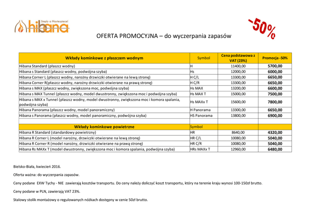 OFERTA PROMOCYJNA – do wyczerpania zapasów Wkłady kominkowe z płaszczem wodnym Hibana Standard (płaszcz wodny) Hibana s Standard (płaszcz wodny, podwójna szyba) Hibana Corner L (płaszcz wodny, narożny drzwiczki otwierane na lewą stronę) Hibana Corner R(płaszcz wodny, narożny drzwiczki otwierane na prawą stronę) Hibana s MAX (płaszcz wodny, zwiększona moc, podwójna szyba) Hibana s MAX Tunnel (płaszcz wodny, model dwustronny, zwiększona moc i podwójna szyba) Hibana s MAX x Tunnel (płaszcz wodny, model dwustronny, zwiększona moc i komora spalania, podwójna szyba) Hibana Panorama (płaszcz wodny, model panoramiczny) Hibana s Panorama (płaszcz wodny, model panoramiczny, podwójna szyba) Wkłady kominkowe powietrzne Hibana R Standard (standardowy powietrzny) Hibana R Corner L (model narożny, drzwiczki otwierane na lewą stronę) Hibana R Corner R (model narożny, drzwiczki otwierane na prawą stronę) Hibana Rs MAXx T (model dwustronny, zwiększona moc i komora spalania, podwójna szyba) H Hs H C/L H C/R Hs MAX Hs MAX T Cena podstawowa z VAT (23%) 11400,00 12000,00 13300,00 13300,00 13200,00 15000,00 Hs MAXx T 15600,00 7800,00 H Panorama HS Panorama 13300,00 13800,00 6650,00 6900,00 Symbol HR HR C/L HR C/R HRs MAXx T 8640,00 10080,00 10080,00 12960,00 4320,00 5040,00 5040,00 6480,00 Symbol Promocja -50% Bielsko-Biała, kwiecień 2016. Oferta ważna: do wyczerpania zapasów. Ceny podane EXW Tychy - NIE zawierają kosztów transportu. Do ceny należy doliczyć koszt transportu, który na terenie kraju wynosi 100-150zł brutto. Ceny podane w PLN, zawierają VAT 23%. Stalowy stolik montażowy o regulowanych nóżkach dostępny w cenie 50zł brutto. 5700,00 6000,00 6650,00 6650,00 6600,00 7500,00