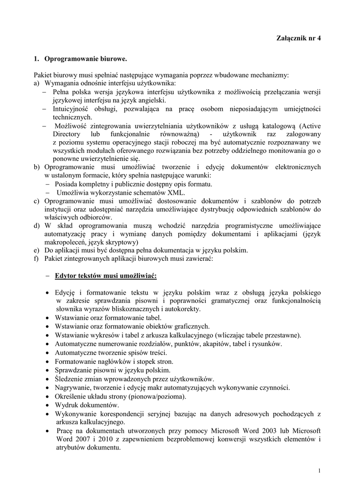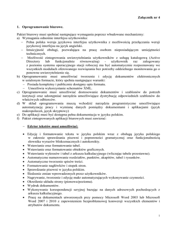 Załącznik nr 4 1. Oprogramowanie biurowe. Pakiet biurowy musi spełniać następujące wymagania poprzez wbudowane mechanizmy: a) Wymagania odnośnie interfejsu użytkownika: Pełna polska wersja językowa interfejsu użytkownika z możliwością przełączania wersji językowej interfejsu na język angielski. Intuicyjność obsługi, pozwalająca na pracę osobom nieposiadającym umiejętności technicznych. Możliwość zintegrowania uwierzytelniania użytkowników z usługą katalogową (Active Directory lub funkcjonalnie równoważną) - użytkownik raz zalogowany z poziomu systemu operacyjnego stacji roboczej ma być automatycznie rozpoznawany we wszystkich modułach oferowanego rozwiązania bez potrzeby oddzielnego monitowania go o ponowne uwierzytelnienie się. b) Oprogramowanie musi umożliwiać tworzenie i edycję dokumentów elektronicznych w ustalonym formacie, który spełnia następujące warunki: Posiada kompletny i publicznie dostępny opis formatu. Umożliwia wykorzystanie schematów XML. c) Oprogramowanie musi umożliwiać dostosowanie dokumentów i szablonów do potrzeb instytucji oraz udostępniać narzędzia umożliwiające dystrybucję odpowiednich szablonów do właściwych odbiorców. d) W skład oprogramowania muszą wchodzić narzędzia programistyczne umożliwiające automatyzację pracy i wymianę danych pomiędzy dokumentami i aplikacjami (język makropoleceń, język skryptowy) e) Do aplikacji musi być dostępna pełna dokumentacja w języku polskim. f) Pakiet zintegrowanych aplikacji biurowych musi zawierać: Edytor tekstów musi umożliwiać: Edycję i formatowanie tekstu w języku polskim wraz z obsługą języka polskiego w zakresie sprawdzania pisowni i poprawności gramatycznej oraz funkcjonalnością słownika wyrazów bliskoznacznych i autokorekty. Wstawianie oraz formatowanie tabel. Wstawianie oraz formatowanie obiektów graficznych. Wstawianie wykresów i tabel z arkusza kalkulacyjnego (wliczając tabele przestawne). Automatyczne numerowanie rozdziałów, punktów, akapitów, tabel i rysunków. Automatyczne tworzenie spisów treści. Formatowanie nagłówków i stopek stron. Sprawdzanie pisowni w języku polskim. Śledzenie zmian wprowadzonych przez użytkowników. Nagrywanie, tworzenie i edycję makr automatyzujących wykonywanie czynności. Określenie układu strony (pionowa/pozioma). Wydruk dokumentów. Wykonywanie korespondencji seryjnej bazując na danych adresowych pochodzących z arkusza kalkulacyjnego. Pracę na dokumentach utworzonych przy pomocy Microsoft Word 2003 lub Microsoft Word 2007 i 2010 z zapewnieniem bezproblemowej konwersji wszystkich elementów i atrybutów dokumentu. 1 Zabezpieczenie dokumentów hasłem przed odczytem oraz przed wprowadzaniem modyfikacji. Wymagana jest dostępność do oferowanego edytora tekstu bezpłatnych narzędzi umożliwiających wykorzystanie go, jako środowiska udostępniającego formularze bazujące na schematach XML z Centralnego Repozytorium Wzorów Dokumentów Elektronicznych, które po wypełnieniu umożliwiają zapisanie pliku XML w zgodzie z obowiązującym prawem. Wymagana jest dostępność do oferowanego edytora tekstu bezpłatnych narzędzi (kontrolki) umożliwiających podpisanie podpisem elektronicznym pliku z zapisanym dokumentem przy pomocy certyfikatu kwalifikowanego zgodnie z wymaganiami obowiązującego w Polsce prawa. Wymagana jest dostępność do oferowanego edytora tekstu bezpłatnych narzędzi umożliwiających wykorzystanie go, jako środowiska udostępniającego formularze i pozwalające zapisać plik wynikowy w zgodzie z Rozporządzeniem o Aktach Normatywnych i Prawnych. Arkusz kalkulacyjny musi umożliwiać: Tworzenie raportów tabelarycznych. Tworzenie wykresów liniowych (wraz linią trendu), słupkowych, kołowych. Wyszukiwanie i zamianę danych. Formatowanie czasu, daty i wartości finansowych z polskim formatem. Tworzenie arkuszy kalkulacyjnych zawierających teksty, dane liczbowe oraz formuły przeprowadzające operacje matematyczne, logiczne, tekstowe, statystyczne oraz operacje na danych finansowych i na miarach czasu. Tworzenie raportów z zewnętrznych źródeł danych (inne arkusze kalkulacyjne, bazy danych zgodne z ODBC, pliki tekstowe, pliki XML, webservice). Obsługę kostek OLAP oraz tworzenie i edycję kwerend bazodanowych i webowych. Narzędzia wspomagające analizę statystyczną i finansową, analizę wariantową i rozwiązywanie problemów optymalizacyjnych. Tworzenie raportów tabeli przestawnych umożliwiających dynamiczną zmianę wymiarów oraz wykresów bazujących na danych z tabeli przestawnych. Wykonywanie analiz danych przy użyciu formatowania warunkowego. Nazywanie komórek arkusza i odwoływanie się w formułach po takiej nazwie. Nagrywanie, tworzenie i edycję makr automatyzujących wykonywanie czynności. Zapis wielu arkuszy kalkulacyjnych w jednym pliku. Zachowanie pełnej zgodności z formatami plików utworzonych za pomocą oprogramowania Microsoft Excel 2003 oraz Microsoft Excel 2007 i 2010, z uwzględnieniem poprawnej realizacji użytych w nich funkcji specjalnych i makropoleceń. Zabezpieczenie dokumentów hasłem przed odczytem oraz przed wprowadzaniem modyfikacji. 2. Wymagane warunki licencji. a) Prawo do bezpłatnej (w okresie przynajmniej 2 lat) instalacji udostępnianych przez producenta uaktualnień i poprawek krytycznych i opcjonalnych w ramach zakupionej wersji oprogramowania. b) Licencje na oprogramowanie biurowe musi pozwalać na swobodne przenoszenie pomiędzy komputerami (np. w przypadku wymiany sprzętu). 2 c) Wymagane jest dostarczenie licencji, których producent zobowiązuje się chronić Zamawiającego przed roszczeniami wnoszonymi w związku z naruszeniem praw własności intelektualnej innych osób przez oferowane oprogramowanie jego produkcji oraz wypłacić wszelkie odszkodowania zasądzone z tego tytułu przez sąd lub wynikające z ugody. 3. Weryfikacja funkcjonalności oprogramowania. Zamawiający zastrzeg