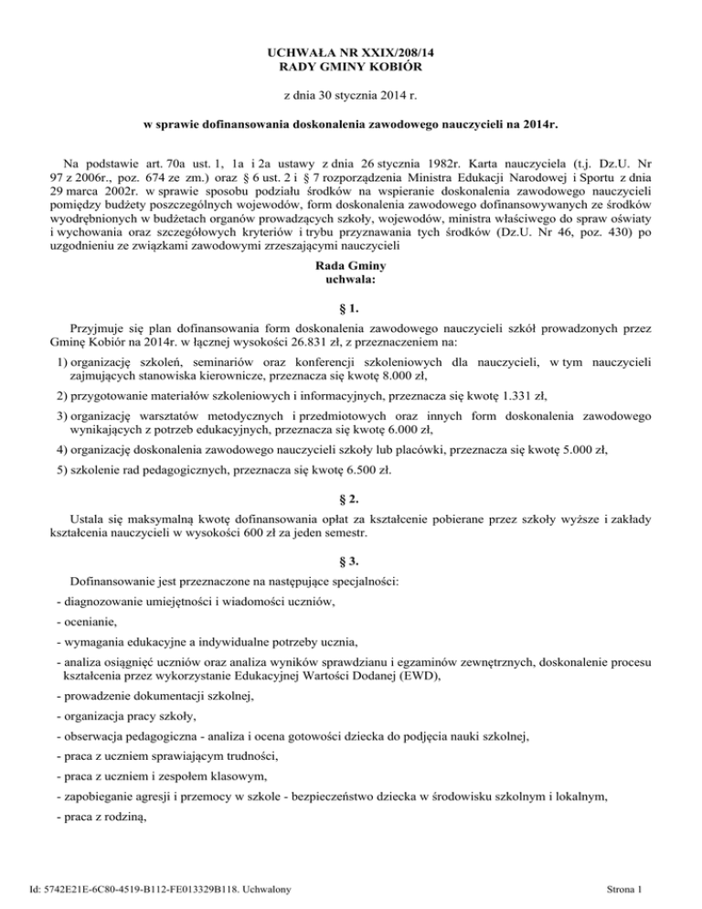 UCHWAŁA NR XXIX/208/14 RADY GMINY KOBIÓR z dnia 30 stycznia 2014 r. w sprawie dofinansowania doskonalenia zawodowego nauczycieli na 2014r. Na podstawie art. 70a ust. 1, 1a i 2a ustawy z dnia 26 stycznia 1982r. Karta nauczyciela (t.j. Dz.U. Nr 97 z 2006r., poz. 674 ze zm.) oraz § 6 ust. 2 i § 7 rozporządzenia Ministra Edukacji Narodowej i Sportu z dnia 29 marca 2002r. w sprawie sposobu podziału środków na wspieranie doskonalenia zawodowego nauczycieli pomiędzy budżety poszczególnych wojewodów, form doskonalenia zawodowego dofinansowywanych ze środków wyodrębnionych w budżetach organów prowadzących szkoły, wojewodów, ministra właściwego do spraw oświaty i wychowania oraz szczegółowych kryteriów i trybu przyznawania tych środków (Dz.U. Nr 46, poz. 430) po uzgodnieniu ze związkami zawodowymi zrzeszającymi nauczycieli Rada Gminy uchwala: § 1. Przyjmuje się plan dofinansowania form doskonalenia zawodowego nauczycieli szkół prowadzonych przez Gminę Kobiór na 2014r. w łącznej wysokości 26.831 zł, z przeznaczeniem na: 1) organizację szkoleń, seminariów oraz konferencji szkoleniowych dla nauczycieli, w tym nauczycieli zajmujących stanowiska kierownicze, przeznacza się kwotę 8.000 zł, 2) przygotowanie materiałów szkoleniowych i informacyjnych, przeznacza się kwotę 1.331 zł, 3) organizację warsztatów metodycznych i przedmiotowych oraz innych form doskonalenia zawodowego wynikających z potrzeb edukacyjnych, przeznacza się kwotę 6.000 zł, 4) organizację doskonalenia zawodowego nauczycieli szkoły lub placówki, przeznacza się kwotę 5.000 zł, 5) szkolenie rad pedagogicznych, przeznacza się kwotę 6.500 zł. § 2. Ustala się maksymalną kwotę dofinansowania opłat za kształcenie pobierane przez szkoły wyższe i zakłady kształcenia nauczycieli w wysokości 600 zł za jeden semestr. § 3. Dofinansowanie jest przeznaczone na następujące specjalności: - diagnozowanie umiejętności i wiadomości uczniów, - ocenianie, - wymagania edukacyjne a indywidualne potrzeby ucznia, - analiza osiągnięć uczniów oraz analiza wyników sprawdzianu i egzaminów zewnętrznych, doskonalenie procesu kształcenia przez wykorzystanie Edukacyjnej Wartości Dodanej (EWD), - prowadzenie dokumentacji szkolnej, - organizacja pracy szkoły, - obserwacja pedagogiczna - analiza i ocena gotowości dziecka do podjęcia nauki szkolnej, - praca z uczniem sprawiającym trudności, - praca z uczniem i zespołem klasowym, - zapobieganie agresji i przemocy w szkole - bezpieczeństwo dziecka w środowisku szkolnym i lokalnym, - praca z rodziną, Id: 5742E21E-6C80-4519-B112-FE013329B118. Uchwalony Strona 1 - metody pracy z uczniem niepełnosprawnych, ze specjalnymi potrzebami edukacyjnymi, w tym kształcenie uczniów - praca z uczniem zdolnym, - wczesne wspomaganie rozwoju dziecka, - metody pracy opiekuńczo-wychowawczej w świetlicy szkolnej, - zastosowanie nowych technologii w procesie dydaktycznym, e-nauczanie, - cyberprzemoc - wpływ internetu i gier wideo na psychikę u dzieci i młodzieży, - uzależnienia - dopalacze, narkotyki, alkohol, substancje psychoaktywne, - działania szkoły na rzecz zdrowia uczniów, w tym pierwsza pomoc przedmedyczna, anoreksja, bulinia i inne zaburzenia odżywiania u młodzieży, - podstawa programowa - planowanie pracy dydaktycznej w kolejnych etapach edukacyjnych, - podręczniki - kryteria wyboru, - realizacja podstawy programowej, wybór programów nauczania, - doradztwo edukacyjno-zawodowe, - edukacja regionalna, - motywowanie uczniów do nauki, - kompetencje w zakresie prowadzenia zajęć terapeutycznych, komunikacji interpersonalnej, pracy z grupą, rozwiązywania konfliktów, mediacji, - przeciwdziałanie demoralizacji, agresji i przestępczości w szkole (środki prawne), - radzenie sobie z prowokacyjnymi zachowaniami uczniów, metody konstruktywnej konfrontacji, - kluczowe kompetencje pedagogiczno-psychologiczne nauczyciela, - psychologiczne uwarunkowania kształcenia, - planowanie i organizacja pracy dydaktyczno-wychowawczo-opiekuńczej w szkole/placówce, - prawo oświatowe oraz inne przepisy prawne w szkole/placówce, - ochrona danych osobowych w szkole w kontekście ustawy o Systemie Informacji Oświatowej, - nadzór pedagogiczny w szkole/placówce, - ewaluacja wewnętrzna szkoły/placówki, - pozyskiwanie funduszy, projekty unijne, projekty lokalne, - bezpieczeństwo w szkole/placówce, - gimnastyka korekcyjna, - język obcy w wychowaniu przedszkolnym, - edukacja wczesnoszkolna. § 4. Dofinansowaniem mogą być objęte następujące formy kształcenia: - studia magisterskie uzupełniające, - studia podyplomowe, - kursy kwalifikacyjne, - kursy doskonalące, - seminaria, Id: 5742E21E-6C80-4519-B112-FE013329B118. Uchwalony Strona 2 - szkolenia, - warsztaty, - konferencje. § 5. Wykonanie uchwały powierza się Wójtowi. § 6. Uchwała wchodzi w życie z dniem podjęcia. Id: 5742E21E-6C80-4519-B112-FE013329B118. Uchwalony Strona 3