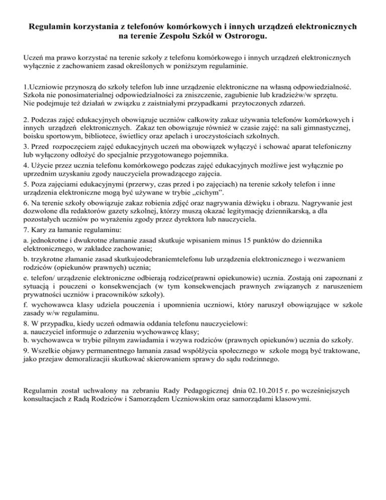 Regulamin korzystania z telefonów komórkowych i innych urządzeń elektronicznych na terenie Zespołu Szkół w Ostrorogu. Uczeń ma prawo korzystać na terenie szkoły z telefonu komórkowego i innych urządzeń elektronicznych wyłącznie z zachowaniem zasad określonych w poniższym regulaminie. 1.Uczniowie przynoszą do szkoły telefon lub inne urządzenie elektroniczne na własną odpowiedzialność. Szkoła nie ponosimaterialnej odpowiedzialności za zniszczenie, zagubienie lub kradzieżw/w sprzętu. Nie podejmuje też działań w związku z zaistniałymi przypadkami przytoczonych zdarzeń. 2. Podczas zajęć edukacyjnych obowiązuje uczniów całkowity zakaz używania telefonów komórkowych i innych urządzeń elektronicznych. Zakaz ten obowiązuje również w czasie zajęć: na sali gimnastycznej, boisku sportowym, bibliotece, świetlicy oraz apelach i uroczystościach szkolnych. 3. Przed rozpoczęciem zajęć edukacyjnych uczeń ma obowiązek wyłączyć i schować aparat telefoniczny lub wyłączony odłożyć do specjalnie przygotowanego pojemnika. 4. Użycie przez ucznia telefonu komórkowego podczas zajęć edukacyjnych możliwe jest wyłącznie po uprzednim uzyskaniu zgody nauczyciela prowadzącego zajęcia. 5. Poza zajęciami edukacyjnymi (przerwy, czas przed i po zajęciach) na terenie szkoły telefon i inne urządzenia elektroniczne mogą być używane w trybie „cichym”. 6. Na terenie szkoły obowiązuje zakaz robienia zdjęć oraz nagrywania dźwięku i obrazu. Nagrywanie jest dozwolone dla redaktorów gazety szkolnej, którzy muszą okazać legitymację dziennikarską, a dla pozostałych uczniów po wyrażeniu zgody przez dyrektora lub nauczyciela. 7. Kary za łamanie regulaminu: a. jednokrotne i dwukrotne złamanie zasad skutkuje wpisaniem minus 15 punktów do dziennika elektronicznego, w zakładce zachowanie; b. trzykrotne złamanie zasad skutkujeodebraniemtelefonu lub urządzenia elektronicznego i wezwaniem rodziców (opiekunów prawnych) ucznia; e. telefon/ urządzenie elektroniczne odbierają rodzice(prawni opiekunowie) ucznia. Zostają oni zapoznani z sytuacją i pouczeni o konsekwencjach (w tym konsekwencjach prawnych związanych z naruszeniem prywatności uczniów i pracowników szkoły). f. wychowawca klasy udziela pouczenia i upomnienia uczniowi, który naruszył obowiązujące w szkole zasady w/w regulaminu. 8. W przypadku, kiedy uczeń odmawia oddania telefonu nauczycielowi: a. nauczyciel informuje o zdarzeniu wychowawcę klasy; b. wychowawca w trybie pilnym zawiadamia i wzywa rodziców (prawnych opiekunów) ucznia do szkoły. 9. Wszelkie objawy permanentnego łamania zasad współżycia społecznego w szkole mogą być traktowane, jako przejaw demoralizacjii skutkować skierowaniem sprawy do sądu rodzinnego. Regulamin został uchwalony na zebraniu Rady Pedagogicznej dnia 02.10.2015 r. po wcześniejszych konsultacjach z Radą Rodziców i Samorządem Uczniowskim oraz samorządami klasowymi.