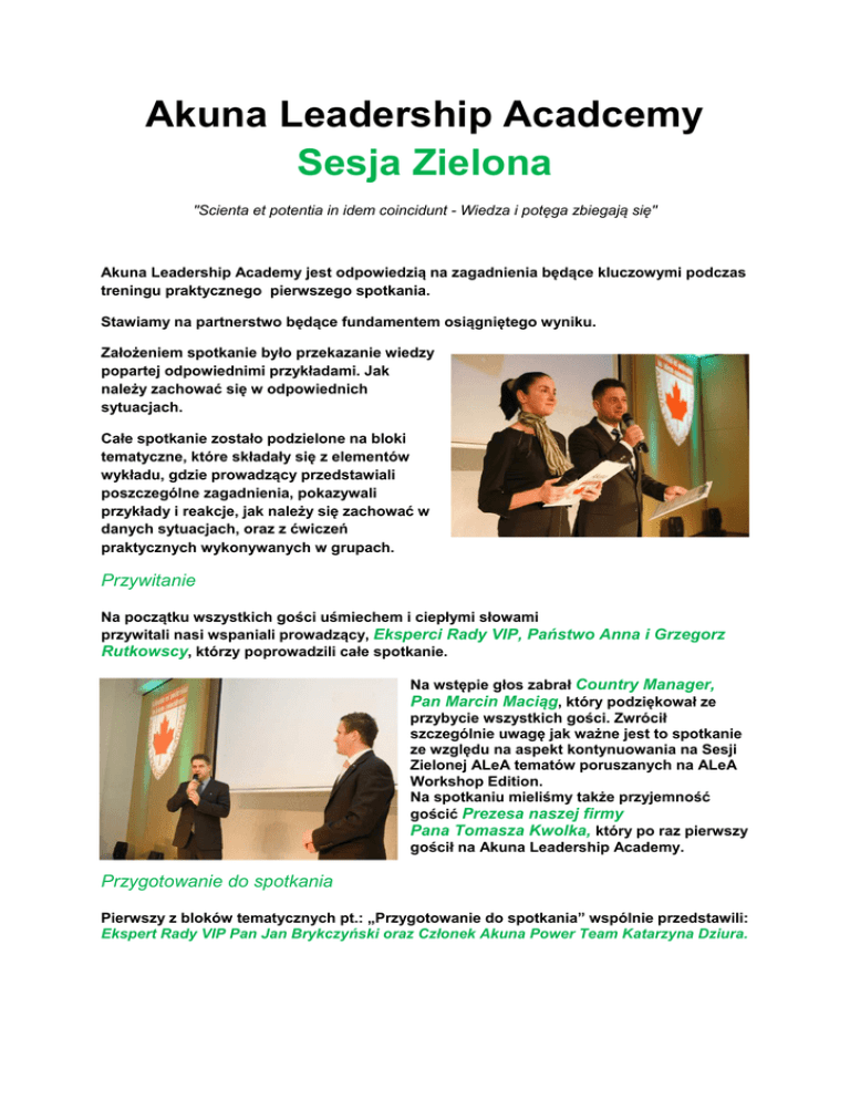 Akuna Leadership Acadcemy Sesja Zielona "Scienta et potentia in idem coincidunt - Wiedza i potęga zbiegają się" Akuna Leadership Academy jest odpowiedzią na zagadnienia będące kluczowymi podczas treningu praktycznego pierwszego spotkania. Stawiamy na partnerstwo będące fundamentem osiągniętego wyniku. Założeniem spotkanie było przekazanie wiedzy popartej odpowiednimi przykładami. Jak należy zachować się w odpowiednich sytuacjach. Całe spotkanie zostało podzielone na bloki tematyczne, które składały się z elementów wykładu, gdzie prowadzący przedstawiali poszczególne zagadnienia, pokazywali przykłady i reakcje, jak należy się zachować w danych sytuacjach, oraz z ćwiczeń praktycznych wykonywanych w grupach. Przywitanie Na początku wszystkich gości uśmiechem i ciepłymi słowami przywitali nasi wspaniali prowadzący, Eksperci Rady VIP, Państwo Anna i Grzegorz Rutkowscy, którzy poprowadzili całe spotkanie. Na wstępie głos zabrał Country Manager, Pan Marcin Maciąg, który podziękował ze przybycie wszystkich gości. Zwrócił szczególnie uwagę jak ważne jest to spotkanie ze względu na aspekt kontynuowania na Sesji Zielonej ALeA tematów poruszanych na ALeA Workshop Edition. Na spotkaniu mieliśmy także przyjemność gościć Prezesa naszej firmy Pana Tomasza Kwolka, który po raz pierwszy gościł na Akuna Leadership Academy. Przygotowanie do spotkania Pierwszy z bloków tematycznych pt.: „Przygotowanie do spotkania” wspólnie przedstawili: Ekspert Rady VIP Pan Jan Brykczyński oraz Członek Akuna Power Team Katarzyna Dziura. Podczas swojego wystąpienia przedstawili oni scenkę obrazującą, jak powinno wyglądać przygotowanie do pierwszego spotkania. Zaznaczyli, że należy zacząć od rozpoznania, od pytań o stan cywilny, o stan zdrowia, o wiek, kto w rodzinie podejmuje decyzje. Te wszystkie pytania doświadczony już sponsor zadaje później swojemu współpracownikowi, tak by dowiedzieć się jak najwięcej o osobie, z którą są umówieni na spotkanie. Następnie Edyfikacja. Edyfikujemy sponsora, gospodarza, a także spotkanie, tak by wzbudzić jak największe zainteresowanie. Kolejny element to zachowanie podczas spotkania, czyli przedstawienie uczestników spotkania, ich edyfikacja oraz umówienie na kolejne spotkanie i pożegnanie się. Nie należy tutaj przeszkadzać sponsorowi, nie można przypominać mu o tym czego jeszcze zapomniał powiedzieć, a także realizować swoich „genialnych” pomysłów. Kolejny element to dopasowanie ubioru, przywitania się i podania ręki. Jednym z ważniejszych elementów jest to co należy zabrać na spotkanie. Są to przede wszystkim: przewodnik z deklaracją członkowską, czasopismo firmowe zawierające informacje interesujące dla klienta, broszura zioła, ulotki reklamowe, dwa piszące długopisy i oczywiście butelkę Alveo. W tym aspekcie bloku tematycznego należy pamiętać szczególnie o punktualności. Po wystąpieniu prowadzących, uczestnicy mieli czas na trening praktyczny, podczas którego ćwiczyli między innymi jak należy podejść do tematu przygotowania do spotkania. Następnie podczas podsumowania na scenie wyrazili opinie na ten temat wraz ze swoimi odczuciami. Pierwsze wrażenie Drugi z wykładów pt.: „Pierwsze wrażenie” przedstawili: Ekspert Rady VIP Pan Marek Wawrzeńczyk oraz Członek Akuna Power Team Hanna Pietroniec. Możemy tutaj zadać pytanie co tak naprawdę ma wpływ na pierwsze wrażenie? Otóż przede wszystkim wygląd zewnętrzny a także używane przez osobę, przedmioty i rekwizyty. Ważna jest także tonacja głosu, a także treść wypowiadanych słów. Pierwsze wrażenie to podanie ręki, wzrok, uśmiech, ale także punktualność, odpowiedni ubiór. Jednym z ważnych elementów jest kwestia obuwia, przede wszystkim zachowanie jego czystości w okresie jesienno – zimowym. Należy także zwrócić uwagę gdzie siadamy tak, by przypadkiem nie zająć miejsca gospodarza. Liczy się przede wszystkim pierwsze 7 sekund. To podczas tego czasu tak naprawdę robimy pierwsze wrażenie u naszego potencjalnego klienta. W takiej formie został przedstawiony blok tematyczny przez wykładowców, a następnie rozpoczęto zajęcia praktyczne w grupach. Uczestnicy mieli za zadanie ćwiczyć przywitanie z gospodarzem ze zwróceniem szczególnej uwagi na podanie dłoni, wzrok, a także zajęcie miejsca. Drugim ćwiczeniem była odpowiednia edyfikacja sponsora, który uczestniczy w spotkaniu. W podsumowaniu uczestnicy wyrażali opinie i zauważone wnioski na temat realizacji poszczególnych zadań. Budowanie relacji Blok tematyczny numer III to: „Budowanie relacji”, który poprowadzili Ekspert Rady VIP Pan Paweł Borecki oraz Członek Akuna VIP Club Pani Ewa Juszczyk. Blok ten to już temat związany z rozmową, jak powinna być ona przeprowadzona. Przede wszystkim zadawanie właściwych pytań. Właściwe pytania dają właściwe odpowiedzi. Należy zadawać w takich sposób pytania, by wzbudzić w rozmówcy zainteresowanie np. Gdybym pokazała Tobie sposób, w jak… to zastanawiam się, na ile jesteś otwarty na nowe rozwiązania lub możliwości? Kolejny element to mowa ciała, czyli uśmiech i pozytywne nastawienie do życia. Dowartościowanie poprzez słowa np.: Piotr, nic się nie zmieniłeś, wyglądasz po prostu wspaniale. Kolejny krok to rozpoznanie na miejscu, w którym zadajemy pytania by rozmówca otworzył się na nas np.: Piotr, interesuje mnie, na ile udało Ci się spełnić Twoje marzenia? Albo: Ale powiedz, czym teraz się zajmujesz? Co porabiasz? Jak w ogóle żyjesz? Ostatni element to dopasowanie i zainspirowanie, w którym przeciągamy rozmówce do siebie. Stosujemy tutaj pytania: - Piotr, przyznam ci się do mojej słabości… że ja właściwie dopiero teraz uświadomiłam sobie, czym tak naprawdę jest WELLNESS. Piotr – A to ciekawe?!! Ale Ty Piotr jesteś tym naprawdę zainteresowany, czy tylko tak mówisz? Piotr – naprawdę.