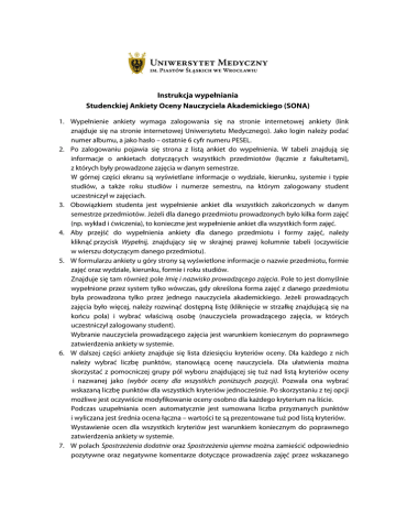 Instrukcja wypełniania Studenckiej Ankiety Oceny Nauczyciela Akademickiego (SONA) 1. Wypełnienie ankiety wymaga zalogowania się na stronie internetowej ankiety (link znajduje się na stronie internetowej Uniwersytetu Medycznego). Jako login należy podać numer albumu, a jako hasło – ostatnie 6 cyfr numeru PESEL. 2. Po zalogowaniu pojawia się strona z listą ankiet do wypełnienia. W tabeli znajdują się informacje o ankietach dotyczących wszystkich przedmiotów (łącznie z fakultetami), z których były prowadzone zajęcia w danym semestrze. W górnej części ekranu są wyświetlane informacje o wydziale, kierunku, systemie i typie studiów, a także roku studiów i numerze semestru, na którym zalogowany student uczestniczył w zajęciach. 3. Obowiązkiem studenta jest wypełnienie ankiet dla wszystkich zakończonych w danym semestrze przedmiotów. Jeżeli dla danego przedmiotu prowadzonych było kilka form zajęć (np. wykład i ćwiczenia), to konieczne jest wypełnienie ankiet dla wszystkich form zajęć. 4. Aby przejść do wypełnienia ankiety dla danego przedmiotu i formy zajęć, należy kliknąć przycisk Wypełnij, znajdujący się w skrajnej prawej kolumnie tabeli (oczywiście w wierszu dotyczącym danego przedmiotu). 5. W formularzu ankiety u góry strony są wyświetlone informacje o nazwie przedmiotu, formie zajęć oraz wydziale, kierunku, formie i roku studiów. Znajduje się tam również pole Imię i nazwisko prowadzącego zajęcia. Pole to jest domyślnie wypełnione przez system tylko wówczas, gdy określona forma zajęć z danego przedmiotu była prowadzona tylko przez jednego nauczyciela akademickiego. Jeżeli prowadzących zajęcia było więcej, należy rozwinąć dostępną listę (kliknięcie w strzałkę znajdującą się na końcu pola) i wybrać właściwą osobę (nauczyciela prowadzącego zajęcia, w których uczestniczył zalogowany student). Wybranie nauczyciela prowadzącego zajęcia jest warunkiem koniecznym do poprawnego zatwierdzenia ankiety w systemie. 6. W dalszej części ankiety znajduje się lista dziesięciu kryteriów oceny. Dla każdego z nich należy wybrać liczbę punktów, stanowiącą ocenę nauczyciela. Dla ułatwienia można skorzystać z pomocniczej grupy pól wyboru znajdującej się tuż nad listą kryteriów oceny i nazwanej jako (wybór oceny dla wszystkich poniższych pozycji). Pozwala ona wybrać wskazaną liczbę punktów dla wszystkich kryteriów jednocześnie. Po skorzystaniu z tej opcji możliwe jest oczywiście modyfikowanie oceny osobno dla każdego kryterium na liście. Podczas uzupełniania ocen automatycznie jest sumowana liczba przyznanych punktów i wyliczana jest średnia ocena łączna – wartości te są prezentowane tuż pod listą kryteriów. Wystawienie ocen dla wszystkich kryteriów jest warunkiem koniecznym do poprawnego zatwierdzenia ankiety w systemie. 7. W polach Spostrzeżenia dodatnie oraz Spostrzeżenia ujemne można zamieścić odpowiednio pozytywne oraz negatywne komentarze dotyczące prowadzenia zajęć przez wskazanego 8. 9. 10. 11. 12. 13. 14. w ankiecie nauczyciela akademickiego. Są to pola opcjonalne i ich wypełnienie nie jest warunkiem koniecznym do poprawnego zatwierdzenia ankiety w systemie. Na zakończenie wypełniania ankiety należy wskazać informację o procencie uczestnictwa studenta w zajęciach (oczywiście dla wskazanego w ankiecie nauczyciela, przedmiotu i formy zajęć). Wypełnienie tej informacji jest warunkiem koniecznym do poprawnego zatwierdzenia ankiety w systemie. Po wypełnieniu całej ankiety należy kliknąć na przycisk Zapisanie ankiety. Jeżeli podane zostały wszystkie wymagane informacje, to ankieta zostanie zapisana w systemie. Jeżeli jakieś wymagane informacje nie zostały wypełnione, wówczas pojawi się okno ze stosownym komunikatem. Aby przerwać edycję ankiety i nie zapisywać jej w systemie, należy wcisnąć przycisk Powrót. Aby przerwać edycję ankiety nie zapisując jej w systemie i wylogować się ze strony ankiety należy wcisnąć przycisk Wylogowanie. W przypadku poprawnego wypełnienia ankiety i zapisania jej w systemie następuje powrót do listy ankiet. W przypadku poprawnie wypełnionej ankiety w kolumnie Prowadzący jest wyświetlane imię i nazwisko nauczyciela akademickiego, w kolumnie Ocena – średnia łączna ocena dla całej ankiety (wszystkie dziesięć kryteriów), w kolumnie Wypełniona pojawia się tekst TAK i wreszcie opis przycisku w kolumnie Działanie zmienia się z Wypełnij na Zmień. Po kliknięciu przycisku Zmień można ponownie przejść do edycji wypełnionej już ankiety i dokonać w niej zmiany (aby zmiany zostały zapisane w systemie należy oczywiście kliknąć na przycisk Zapisanie ankiety. Po poprawnym wypełnieniu wszystkich wymaganych ankiet znajdujących się na liście ankiet można wylogować się z systemu, klikając na przycisk Wylogowanie znajdujący się u dołu strony. Jeżeli wypełniona zostanie tylko część ankiet z wyświetlanej listy, to po wylogowaniu z systemu można oczywiście w dowolnej chwili zalogować się ponownie i uzupełnić pozostałe ankiety oraz poprawić ankiety już wypełnione.
