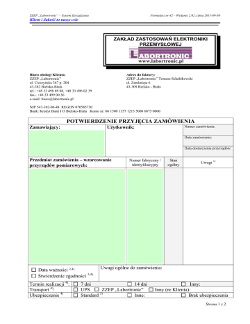 ZZEP „Labortronic” – System Zarządzania Formularz nr 42 – Wydanie 2.02 z dnia 2011-09-30 Klient i Jakość to nasze cele ZAKŁAD ZASTOSOWAŃ ELEKTRONIKI PRZEMYSŁOWEJ Adres do faktury: ZZEP „Labortronic” Tomasz Schabikowski ul. Zamknięta 6 43-309 Bielsko - Biała Biuro obsługi Klienta: ZZEP „Labortronic” ul. Cieszyńska 367 p. 204 43-382 Bielsko-Biała tel.: +48 33 498 69 08, +48 33 496 02 39 fax.: +48 33 499 00 36 e-mail: [email protected] NIP 547-102-06-48 REGON 070585730 Bank: Kredyt Bank I O Bielsko-Biała Konto nr: 06 1500 1357 1213 5000 6875 0000 POTWIERDZENIE PRZYJĘCIA ZAMÓWIENIA Zamawiający: Numer zamówienia: Użytkownik: Data zamówienia: Data dostarczenia przyrządów: Przedmiot zamówienia – wzorcowanie przyrządów pomiarowych: Data ważności 2,4) Stwierdzenie zgodności zgodności 3,4) Stwierdzenie Termin realizacji 4): Transport 4): Ubezpieczenie 4) Numer fabryczny / identyfikacyjny Stan ogólny Uwagi 1) Uwagi ogólne do zamówienia: 7 dni 14 dni UPS ZZEP „Labortronic” Standard 5) Inne: Inny: Inny (nr Klienta): Brak ubezpieczenia Strona 1 z 2 ZZEP „Labortronic” – System Zarządzania Formularz nr 42 – Wydanie 2.02 z dnia 2011-09-30 Klient i Jakość to nasze cele Podczas realizacji usługi wzorcowania obowiązują Ogólne Warunki Świadczenia Usług – Dokument nr 4 wydanie aktualnie obowiązujące w ZZEP „Labortronic”, które mają zastosowanie do wszystkich umów świadczenia usługi przez cały okres ich trwania i są dostępne na stronie internetowej pod adresem www.labortronic.pl/doc/owsu.pdf oraz w Biurze Obsługi Klienta. UWAGI Pola zacienione wypełnia ZZEP „Labortronic” 1) Uwagi dotyczące przedmiotu wzorcowania (np. szczegóły dotyczące stanu technicznego, punkty wzorcowania, wyposażenie dodatkowe itp.). 2) Umieszczenie daty ważności na Świadectwie Wzorcowania wymaga pisemnego ustalenia z Zamawiającym poprzez wypełnienie formularza nr 58 – Informacje dodatkowe na świadectwie wzorcowania. W wymienionym formularzu Zamawiający określa harmonogram wzorcowania przyrządów pomiarowych lub powinien do formularza dołączyć dokument określający czasookresy wzorcowania. Formularz dostępny jest pod adresem www.labortronic.pl/doc/dinsw.pdf lub w Biurze Obsługi Klienta. 3) Celem umieszczenia na świadectwie wzorcowania zgodności z specyfikacją konieczne jest wypełnienie formularza nr 58 – Informacje dodatkowe na świadectwie wzorcowania. Formularz dostępny jest pod adresem www.labortronic.pl/doc/dinsw.pdf lub w Biurze Obsługi Klienta. Stwierdzenie zgodności ze specyfikacją może zostać ustalone zgodnie z wymaganiami metrologicznymi odpowiedniej normy, dokładnością deklarowaną przez producenta lub innym dokumentem wskazanym przez Zamawiającego. Jeżeli Zamawiający wskaże specyfikację a ZZEP „Labortronic” nie dysponuje odpowiednim dokumentem, składający zamówienie powinien udostępnić co najmniej odpowiedni jego fragment. 4) Wyboru dokonuje się poprzez postawienie znaku „X” w okienku przy wybranej opcji 5) Kwota ubezpieczenia ustalona jest w punkcie 11 § 3 Ogólnych Warunków Świadczenia Usługi. Przyjął: ZZEP „Labortronic” Zleceniodawca (podpis osoby upoważnionej) (podpis osoby reprezentującej Zamawiającego) Zatwierdził: Poniższą tabelę wypełnić po realizacji zamówienia Potwierdzam odbiór przyrządów (ilość szt.): Data: Zleceniodawca (podpis osoby reprezentującej Zamawiającego) Potwierdzam odbiór Świadectw (ilość szt.): Data: Zleceniodawca (podpis osoby reprezentującej Zamawiającego) Ustalenia z Zamawiającym podczas realizacji zamówienia: Strona 2 z 2