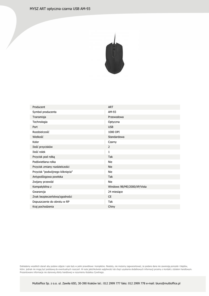 MYSZ ART optyczna czarna USB AM-93 Producent ART Symbol producenta AM-93 Transmisja Przewodowa Technologia Optyczna Port USB Rozdzielczość 1000 DPI Wielkość Standardowa Kolor Czarny Ilość przycisków 2 Ilość rolek 1 Przycisk pod rolką Tak Podświetlana rolka Nie Przycisk zmiany rozdzielczości Nie Przycisk "podwójnego kliknięcia" Nie Antypoślizgowa powłoka Tak Zwijany przewód Nie Kompatybilna z Windows 98/ME/2000/XP/Vista Gwarancja 24 miesiące Znak bezpieczeństwa/zgodności CE Dopuszczenie do obrotu w RP Tak Kraj pochodzenia Chiny Dokładamy wszelkich starań aby podane zdjęcie i opis były w pełni prawidłowe i kompletne. Niestety, nie możemy zagwarantować, że podane dane nie zawierają pomyłek i błędów, które jednak nie mogą być podstawą do ewentualnych roszczeń. W razie jakichkolwiek wątpliwości lub chęci uzyskania dodatkowych informacji prosimy o kontakt z działem handlowym. Prezentowane informacje nie stanowią oferty handlowej w rozumieniu Kodeksu Cywilnego. Multioffice Sp. z o.o. ul. Zawiła 65D, 30-390 Kraków tel.: 012 2999 777 faks: 012 2999 778 e-mail: [email protected]