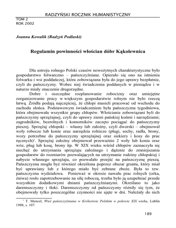 TOM 2 ROK 2002 RADZYŃSKI ROCZNIK HUMANISTYCZNY Joanna Kowalik (Radzyń Podlaski) Regulamin powinności włościan dóbr Kąkolewnica Dla ustroju rolnego Polski czasów nowożytnych charakterystyczne było gospodarstwo folwarczno – pańszczyźniane. Opierało się ono na istnieniu folwarku i wsi poddańczej, która zobowiązana była do jego uprawy bezpłatnie, czyli do pańszczyzny. Wobec niej świadczenia poddanych w pieniądzu i w naturze miały znaczenie drugorzędne. Dobre i oszczędne rozplanowanie robocizny oraz umiejętne zorganizowanie pracy w większym gospodarstwie rolnym nie było rzeczą łatwą. Źródła podają najczęściej, że chłopi musieli pracować od wschodu do zachodu słońca. Podstawowym świadczeniem była pańszczyzna tygodniowa, która obejmowała wszystkie grupy chłopów. Włościanie zobowiązani byli do pańszczyzny sprzężajnej, czyli do uprawy ziemi pańskiej końmi i narzędziami; zagrodników, bezrolnych i komorników zaczęto pociągać do pańszczyzny pieszej. Sprzężaj chłopski – własny lub założny, czyli dworski – obejmował woły robocze lub konie oraz narzędzia rolnicze (pługi, sochy, radła, brony, wozy potrzebne do pańszczyzny sprzężajnej oraz siekiery i kosy do prac ręcznych)1. Sprzężaj założny obejmował przeważnie 2 woły lub konia oraz wóz, pług lub kosę, brony itp. W XIX wieku wśród chłopów zaznaczyła się niechęć do utrzymania sprzężaju założnego i dążenie do zmniejszania gospodarstw do rozmiarów pozwalających na utrzymanie rodziny chłopskiej i nabycie własnego sprzężaju, co pozwalało przejść na pańszczyznę pieszą. Pańszczyzna mogła być również określona poprzez obszar gruntu, który miał być uprawiany lub z którego miało być zebrane zboże. Była to tzw. pańszczyzna wydziałowa. Ponieważ w okresie nawału prac rolnych (orka, żniwa) rosło zapotrzebowanie na siłę roboczą, trzeba było ją uzupełniać przede wszystkim dodatkowymi dniami pańszczyźnianymi. Określano to jako daremszczyzny i tłoki. Daremszczyzny od pańszczyzny różniły się tym, że obejmowały tylko poszczególne czynności nie ujęte w dni. Należały do nich 1 T. Mencel, Wieś pańszczyźniana w Królestwie Polskim w połowie XIX wieku, Lublin 1988, s. 107. 189 Joanna Kowalik głównie roboty kobiece tj. prace w ogrodzie dworskim, sprzędzenie określonej ilości motków lnu lub konopi, grabienie siana, podsiewanie pszenicy. Do męskich zaś: robienie kaszy, tłoczenie oleju oraz nocna straż z narąbaniem drew, przyniesieniem wody, czyszczeniem kominów. Przeliczanie daremszczyzn na dni robocze miało charakter teoretyczny, gdyż wymagano przede wszystkim wykonania określonej pracy2. Natomiast tłoki, zwane także dniami pomocniczymi lub letnimi, obejmowały 3 lub 4 dni pracy „bez naruszenia pańszczyzny” w okresie żniw3. Tam, gdzie pańszczyzna nie wystarczała, zapotrzebowanie na pracę na folwarku uzupełniano najmem wolnym lub przymusowym. Najem przymusowy, zwany także narzutem lub narzutką, obejmował przeważnie 1 dzień tygodniowo pracy chłopskiej opłacanej przez dwór poniżej ceny najmu wolnego, wykonywanego przeważnie przez przybyszów z innych stron kraju. W dobrach narodowych został zniesiony razem z daremszczyznami rozporządzeniem Izby Administracyjnej Dóbr Koronnych z 8 kwietnia 1817 r., a we wsiach dóbr prywatnych przetrwał i był pilnie egzekwowany4. Obok pańszczyzny włościanie zobowiązani byli również do dodatkowych świadczeń i powinności, m.in. prac szarwarkowych (naprawa dróg, mostów, młynów), tzw. podróży (przewóz zboża, drzewa). Ustawa rządowa z 3 maja 1791 roku, zachowując ogólne przywileje szlacheckie, pozbawiła szlachtę prawa najwyższej zwierzchności wobec poddanych, stwierdzając, że rolników przyjmuje się pod opiekę prawa i rządu krajowego. Zachęcała również dziedziców do zawierania umów indywidualnych lub zbiorowych z chłopami, co do rodzaju, rozmiaru i czasu trwania ich świadczeń. Umowy miały wiązać obydwie strony i podpadać pod opiekę rządu. Właściciele ziemscy i ich sukcesorzy nie mogliby samowolnie zmieniać raz zawartej umowy, a chłopi ze swej strony musieliby wykonywać umówione powinności5. Korzystne zmiany przyniosła chłopom, wydana w kwietniu 1792 roku, ustawa o sprzedaży królewszczyzn, której celem było ratowanie skarbu państwa. Zapewniała ona chłopom osiadłym w tych dobrach „własność wieczystą”, czyli własność użytkową ziemi, wolność osobistą, wyrażającą się w możności odejścia z gruntu po rozwiązaniu kontraktu, po wypełnieniu zobowiązań oraz po wprowadzeniu na gospodarstwo innego chłopa. Natomiast 2 Tamże, s. 156-157. Tamże, s. 179. 4 Tamże, s.166. 5 Ustawa rządowa. Prawo uchwalone dnia 3 maia roku 1791. W Warszawie, w drukarni uprzywileiowaney M. Grula, księgarza nadwornego J.K. Mci, s. 8-11, [w:] Próby reform włościańskich Polsce XVIII w., wybór źródeł, oprac. Stefan Inglot, Wrocław 1952, s.224-225. 3 190 Regulamin powinności włościan dóbr Kąkolewnica przy przejmowaniu królewszczyzn przez nowych nabywców lustratorzy państwowi mieli czuwać nad ścisłym określeniem rozmiarów renty oraz zachęcać do zawierania umów o czynszowaniu. Wydany 21 grudnia 1807 r. dekret precyzował zakres przyznanej poddanym wolności, określając warunki ewentualnego opuszczania wsi przez chłopa, a także zapowiadał opiekę państwa nad umowami między chłopstwem a ziemiaństwem. Jednakże dekret ustalał zarazem, że w razie odejścia chłopa ze wsi był on zobowiązany pozostawić panu w całości inwentarz żywy i martwy oraz „zasiewy”. Po upadku powstania listopadowego Rząd Tymczasowy w proklamacji z 13 października 1831 r. pod groźbą egzekucji wojskowej nakazał chłopom odrabiać pańszczyznę, a jednocześnie, chcąc ukarać szlachtę za wzniecenie i kierowanie powstaniem, obiecywał polepszenie położenia chłopów i doprowadzenie d