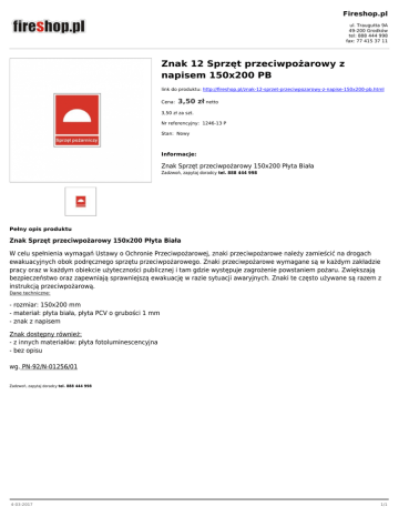 Fireshop.pl ul. Traugutta 9A 49-200 Grodków tel: 888 444 998 fax: 77 415 37 11 Znak 12 Sprzęt przeciwpożarowy z napisem 150x200 PB link do produktu: http://fireshop.pl/znak-12-sprzet-przeciwpozarowy-z-napise-150x200-pb.html Cena: 3,50 zł netto 3,50 zł za szt. Nr referencyjny: 1246-13 P Stan: Nowy Informacje: Znak Sprzęt przeciwpożarowy 150x200 Płyta Biała Zadzwoń, zapytaj doradcy tel. 888 444 998 Pełny opis produktu Znak Sprzęt przeciwpożarowy 150x200 Płyta Biała W celu spełnienia wymagań Ustawy o Ochronie Przeciwpożarowej, znaki przeciwpożarowe należy zamieścić na drogach ewakuacyjnych obok podręcznego sprzętu przeciwpożarowego. Znaki przeciwpożarowe wymagane są w każdym zakładzie pracy oraz w każdym obiekcie użyteczności publicznej i tam gdzie występuje zagrożenie powstaniem pożaru. Zwiększają bezpieczeństwo oraz zapewniają sprawniejszą ewakuację w razie sytuacji awaryjnych. Znaki te często używane są razem z instrukcją przeciwpożarową. Dane techniczne: - rozmiar: 150x200 mm - materiał: płyta biała, płyta PCV o grubości 1 mm - znak z napisem Znak dostępny również: - z innych materiałów: płyta fotoluminescencyjna - bez opisu wg. PN-92/N-01256/01 Zadzwoń, zapytaj doradcy tel. 888 444 998 4-03-2017 1/1