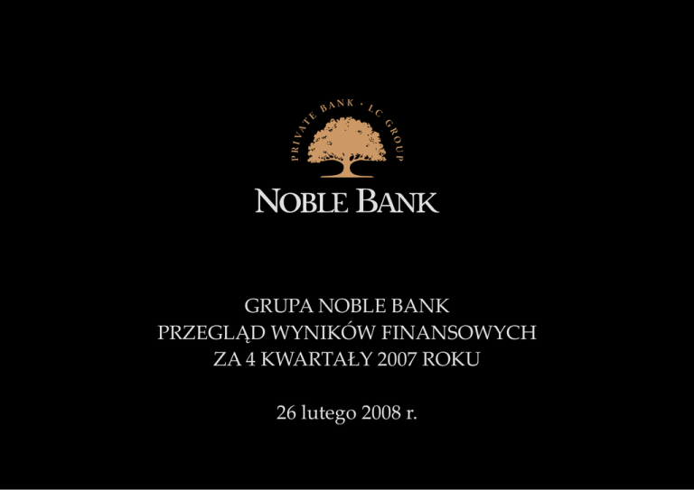 GRUPA NOBLE BANK PRZEGLĄD WYNIKÓW FINANSOWYCH ZA 4 KWARTAŁY 2007 ROKU 26 lutego 2008 r. ZASTRZEŻENIE Niniejsza prezentacja została opracowana wyłącznie w celu informacyjnym na potrzeby klientów i akcjonariuszy Noble Bank SA oraz analityków rynku i nie może być traktowana jako oferta lub rekomendacja do zawierania jakichkolwiek transakcji. Informacje zawarte w materiale pochodzą z ogólnie dostępnych, wiarygodnych źródeł, jednak Noble Bank SA nie może zagwarantować ich kompletności i pełności, Noble Bank SA nie ponosi odpowiedzialności za skutki decyzji podjętych na podstawie informacji zawartych w niniejszym materiale. Informacje zawarte w prezentacji nie były przedmiotem niezależnej weryfikacji i w każdym wypadku mogą być przedmiotem zmian i modyfikacji. Publikowanie przez Noble Bank SA danych zawartych w prezentacji nie stanowi naruszenia prawa obowiązującego spółki, których akcje notowane są na rynku regulowanym. Informacje w niej zawarte zostały przekazane w ramach raportów bieżących lub okresowych przesłanych przez Noble Bank SA lub stanowią ich uzupełnienie nie będąc jednocześnie podstawą od spełnienia obowiązku informacyjnego nałożonego na Bank jako spółkę publiczną. W żadnym wypadku zawartość niniejszej prezentacji nie może być interpretowana jako wyraźne lub dorozumiane oświadczenie czy zapewnienie jakiegokolwiek rodzaju składane przez Spółkę lub jej przedstawicieli. Ponadto, ani Spółka, ani jej przedstawiciele nie ponoszą pod żadnym względem odpowiedzialności (wskutek zaniedbania czy z innego powodu) za jakiekolwiek straty lub szkody, jakie mogą powstać w związku z wykorzystaniem niniejszej prezentacji lub jakichkolwiek treści w niej zawartych lub też w inny sposób mogących powstać w związku z informacjami stanowiącymi część niniejszej prezentacji, Spółka nie jest zobowiązana do podania do publicznej wiadomości żadnych możliwych modyfikacji czy zmian informacji, danych ani oświadczeń stanowiących część niniejszej prezentacji w przypadku zmiany strategii albo zamiarów Spółki lub wystąpienia nieprzewidzianych faktów lub okoliczności, które będą miały wpływ na tę strategię lub zamiary Spółki. Niniejsza prezentacja zawiera informacje dotyczące sektora bankowego w Polsce, w tym także informacje na temat udziału Spółki w rynku. Z wyjątkiem danych, które zostały opisane jako pochodzące wyłącznie z innego źródła, informacje rynkowe, o których mowa powyżej, zostały sporządzone w oparciu o dane pochodzące ze źródeł osób trzecich określonych w niniejszym dokumencie oraz zawierają dane szacunkowe, oceny, korekty i opinie oparte na doświadczeniu Spółki i jej znajomości sektora, w którym Spółka prowadzi działalność. Ponieważ informacje rynkowe, o których mowa powyżej, zostały w części przygotowane w oparciu o dane szacunkowe, oceny, korekty i opinie i nie zostały zweryfikowane przez niezależne osoby trzecie, z wyjątkiem informacji, które zostały oznaczone jako pochodzące ze źródła osób trzecich, informacje te mają do pewnego stopnia charakter subiektywny. Istnieje domniemanie, że powyższe dane szacunkowe, oceny, korekty i opinie są oparte na uzasadnionych podstawach, oraz że przygotowane informacje rynkowe należycie odzwierciedlają sytuację w sektorze bankowym oraz na rynkach, na których Spółka prowadzi działalność, to jednak nie ma pewności, że takie dane szacunkowe, oceny, korekty i opinie są najwłaściwsze do wyciągania wniosków dotyczących informacji rynkowych, ani że informacje rynkowe przygotowane przez inne źródła nie będą różnić się w istotny sposób od informacji rynkowych zawartych w niniejszej prezentacji. Spółka zwraca uwagę, że jedynym wiarygodnym źródłem danych na temat sytuacji Noble Bank SA, prognoz, zdarzeń jej dotyczących, wyników finansowych oraz wskaźników są raporty bieżące i okresowe przekazywane przez Noble Bank SA w ramach wykonywania obowiązków informacyjnych. 1 GRUPA NOBLE BANK PODSUMOWANIE 4 KWARTAŁÓW 2007 r. +70% Sieć dystrybucji Grupy: 54 placówki (8 placówek NB, 46 oddziałów OF i OD). +120% Kapitały własne Grupy*: wzrost do 530,5 mln zł. +138% Skonsolidowany zysk netto Grupy: 126,5 mln zł po 4 kwartałach. +322% Suma aktywów Banku: wzrost do 2,1 mld zł na koniec 2007 r. +660% Depozyty: wzrost salda o 828 mln zł. +844% Portfel kredytowy: wzrost do 1,19 mld zł. * Przypadające na akcjonariuszy jednostki dominującej. 2 GRUPA NOBLE BANK PODSUMOWANIE – JEDNOSTKOWE ZYSKI NETTO (mln zł) Q4 2006 Q4 2007 % ZMIANA 2006 2007 % ZMIANA Zysk netto 16,0 32,0 +100% 38,4 93,4 +143% Zysk netto 4,2 6,8 +62% 19,4 28,7 +47% Zysk netto -0,6 3,8 --- -0,7 14,3 --- Suma jednostkowe 19,6 42,6 +117% 57,1 136,4 +139% Suma skonsolidowane 15,8 37,8 +139% 53,2 126,5 +138% 3 GRUPA NOBLE BANK DYSTRYBUCJA PRZYCHODÓW I ZYSK NETTO 2007 vs. 2006 Jednostkowe przychody Spółek Grupy Skonsolidowany zysk netto Spółek Grupy w mln zł w mln zł 400 160 38,2 350 140 14,3 300 -9,9 120 +160% 28,7 146,9 250 100 200 376,7 80 +137% 0,7 150 -3,9 19,4 78,2 100 126,5 -0,7 60 93,4 40 191,6 144,5 53,2 50 20 38,4 65,6 0 0 2006 2007 2006 Noble Bank Noble Funds Skonsolidowany zysk netto Open Finance Przychody Grupy Wyłączenia konsolidacyjne i udział mniejszości 2007 4 GRUPA NOBLE BANK NAJWAŻNIEJSZE INFORMACJE PO 4 KWARTAŁACH 2007 r. Noble Bank SA n Środki klientów pod zarządzaniem Grupy Noble Bank: 2,8 mld zł n Liczba pozyskanych nowych klientów w obszarze bankowości prywatnej: 2700 klientów n Dynamiczny wzrost akcji kredytowej Metrobank: portfel kredytowy 1,19 mld zł Noble Funds TFI SA n Wartość zarządzanych aktywów: ponad 1,5 mld zł po roku działalności n Prognozowany zysk netto 14,3 mln zł n 2 nowe Fundusze (MIŚS i Luxury) Open Finance SA n Utrzymanie pozycji lidera w Polsce w kredytach hipotecznych (~12% udział w rynku) i produktów inwestycyjnych n Silny wzrost 