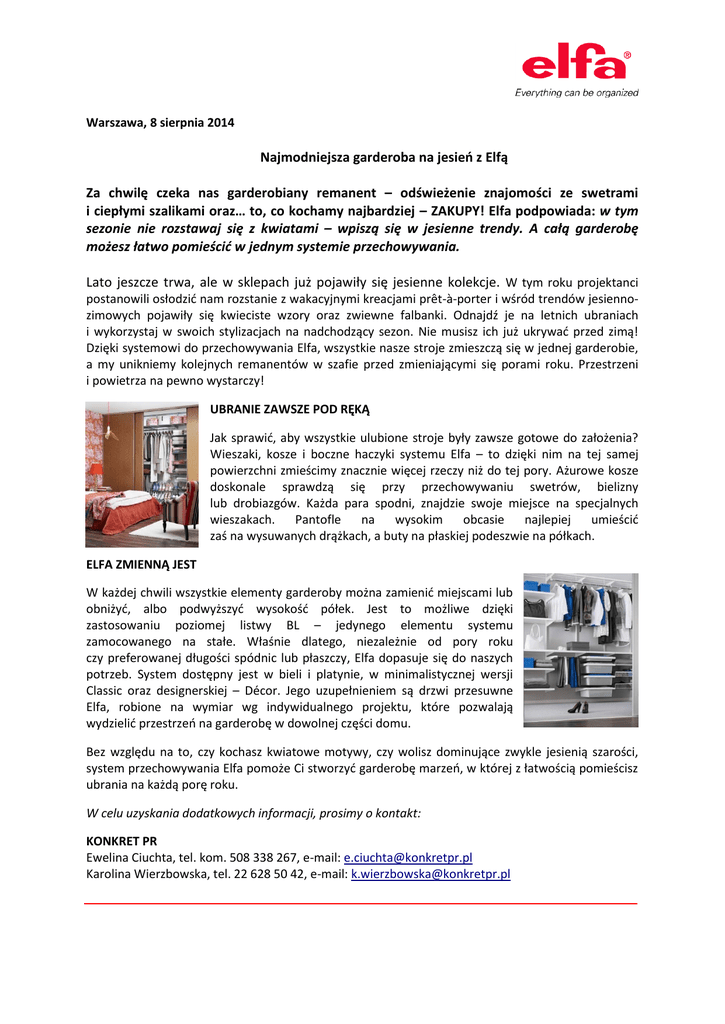 Warszawa, 8 sierpnia 2014 Najmodniejsza garderoba na jesień z Elfą Za chwilę czeka nas garderobiany remanent – odświeżenie znajomości ze swetrami i ciepłymi szalikami oraz… to, co kochamy najbardziej – ZAKUPY! Elfa podpowiada: w tym sezonie nie rozstawaj się z kwiatami – wpiszą się w jesienne trendy. A całą garderobę możesz łatwo pomieścić w jednym systemie przechowywania. Lato jeszcze trwa, ale w sklepach już pojawiły się jesienne kolekcje. W tym roku projektanci postanowili osłodzić nam rozstanie z wakacyjnymi kreacjami prêt-à-porter i wśród trendów jesiennozimowych pojawiły się kwieciste wzory oraz zwiewne falbanki. Odnajdź je na letnich ubraniach i wykorzystaj w swoich stylizacjach na nadchodzący sezon. Nie musisz ich już ukrywać przed zimą! Dzięki systemowi do przechowywania Elfa, wszystkie nasze stroje zmieszczą się w jednej garderobie, a my unikniemy kolejnych remanentów w szafie przed zmieniającymi się porami roku. Przestrzeni i powietrza na pewno wystarczy! UBRANIE ZAWSZE POD RĘKĄ Jak sprawić, aby wszystkie ulubione stroje były zawsze gotowe do założenia? Wieszaki, kosze i boczne haczyki systemu Elfa – to dzięki nim na tej samej powierzchni zmieścimy znacznie więcej rzeczy niż do tej pory. Ażurowe kosze doskonale sprawdzą się przy przechowywaniu swetrów, bielizny lub drobiazgów. Każda para spodni, znajdzie swoje miejsce na specjalnych wieszakach. Pantofle na wysokim obcasie najlepiej umieścić zaś na wysuwanych drążkach, a buty na płaskiej podeszwie na półkach. ELFA ZMIENNĄ JEST W każdej chwili wszystkie elementy garderoby można zamienić miejscami lub obniżyć, albo podwyższyć wysokość półek. Jest to możliwe dzięki zastosowaniu poziomej listwy BL – jedynego elementu systemu zamocowanego na stałe. Właśnie dlatego, niezależnie od pory roku czy preferowanej długości spódnic lub płaszczy, Elfa dopasuje się do naszych potrzeb. System dostępny jest w bieli i platynie, w minimalistycznej wersji Classic oraz designerskiej – Décor. Jego uzupełnieniem są drzwi przesuwne Elfa, robione na wymiar wg indywidualnego projektu, które pozwalają wydzielić przestrzeń na garderobę w dowolnej części domu. Bez względu na to, czy kochasz kwiatowe motywy, czy wolisz dominujące zwykle jesienią szarości, system przechowywania Elfa pomoże Ci stworzyć garderobę marzeń, w której z łatwością pomieścisz ubrania na każdą porę roku. W celu uzyskania dodatkowych informacji, prosimy o kontakt: KONKRET PR Ewelina Ciuchta, tel. kom. 508 338 267, e-mail: [email protected] Karolina Wierzbowska, tel. 22 628 50 42, e-mail: [email protected] Elfa International AB jest spółką matką grupy kapitałowej Elfa, posiada pięć fabryk oraz dziewięć przedstawicielstw handlowych w Szwecji, Norwegii, Finlandii, Danii, Francji, Niemczech i Polsce. Elfa sprzedaje swoje produkty pod pięcioma markami; elfa, Sparring, Lumi, Noga oraz Kirena. Firma została założona w 1948 roku i obecnie jest światowym liderem w dostarczaniu kreatywnych systemów przechowywania. Asortyment obejmuje systemy koszy, systemy półek wykonane ze stali i drewna oraz robione na miarę drzwi przesuwne. Produkty elfa są sprzedawane w ponad 25 krajach poprzez oddziały, domy sieciowe typu DIY oraz niezależnych dystrybutorów. Grupa zatrudnia ponad 630 osób, a obroty przekraczają 900 milionów koron szwedzkich. www.elfa.com