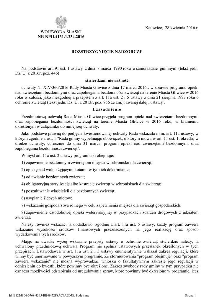 Katowice, 28 kwietnia 2016 r. WOJEWODA ŚLĄSKI NR NPII.4131.1.234.2016 ROZSTRZYGNIĘCIE NADZORCZE Na podstawie art. 91 ust. 1 ustawy z dnia 8 marca 1990 roku o samorządzie gminnym (tekst jedn. Dz. U. z 2016r. poz. 446) stwierdzam nieważność uchwały Nr XIV/360/2016 Rady Miasta Gliwice z dnia 17 marca 2016r. w sprawie programu opieki nad zwierzętami bezdomnymi oraz zapobiegania bezdomności zwierząt na terenie Miasta Gliwice w 2016 roku w całości, jako niezgodnej z przepisem z art. 11a ust. 2 i 5 ustawy z dnia 21 sierpnia 1997 roku o ochronie zwierząt (tekst jedn. Dz. U. z 2013r. poz. 856 ze zm.), zwanej dalej „ustawą”. Uzasadnienie Przedmiotową uchwałą Rada Miasta Gliwice przyjęła program opieki nad zwierzętami bezdomnymi oraz zapobiegania bezdomności zwierząt na terenie Miasta Gliwice w 2016 roku, w brzmieniu określonym w załączniku do niniejszej uchwały. Jako podstawę prawną do podjęcia kwestionowanej uchwały Rada wskazała m.in. art. 11a ustawy, w którym zgodnie z ust. 1 "Rada gminy wypełniając obowiązek, o którym mowa w art. 11 ust. 1, określa, w drodze uchwały, corocznie do dnia 31 marca, program opieki nad zwierzętami bezdomnymi oraz zapobiegania bezdomności zwierząt". W myśl art. 11a ust. 2 ustawy program taki obejmuje: 1) zapewnienie bezdomnym zwierzętom miejsca w schronisku dla zwierząt; 2) opiekę nad wolno żyjącymi kotami, w tym ich dokarmianie; 3) odławianie bezdomnych zwierząt; 4) obligatoryjną sterylizację albo kastrację zwierząt w schroniskach dla zwierząt; 5) poszukiwanie właścicieli dla bezdomnych zwierząt; 6) usypianie ślepych miotów; 7) wskazanie gospodarstwa rolnego w celu zapewnienia miejsca dla zwierząt gospodarskich; 8) zapewnienie całodobowej opieki weterynaryjnej w przypadkach zdarzeń drogowych z udziałem zwierząt. Należy również wskazać, iż dodatkowo, zgodnie z art. 11a ust. 5 ustawy, każdy program zawiera wskazanie wysokości środków finansowych przeznaczonych na jego realizację oraz sposób wydatkowania tych środków. Mając na uwadze wyżej wskazane przepisy ustawy o ochronie zwierząt stwierdzić należy, iż uchwalony przedmiotową uchwałą Program nie spełnia ustawowych przesłanek określonych w tych przepisach. Ustawodawca w art. 11a ust. 2 i 5 ustawy enumeratywnie wskazał zakres regulacji, które winny być unormowane w powyższym programie. Ze sformułowania "program obejmuje" oraz "program zawiera wskazanie" nie można wyprowadzać wniosku o fakultatywnym zakresie jego regulacji w odniesieniu do kwestii, które powinny być określone. Zakres swobody rady gminy w tym przypadku nie oznacza możliwości odstąpienia od uregulowania spraw, które powinny być określone w programie, lecz Id: B1234804-0768-4395-BB49-72F8AC9A6D3E. Podpisany Strona 1 zobowiązuje do określenia w nim wszystkich wskazanych w delegacji ustawowej elementów. Brak jakiegokolwiek z wymienionych powyżej elementów skutkuje bezwzględną nieważnością całego aktu. Tymczasem analizując regulacje kwestionowanej uchwały, należy stwierdzić, że zawiera ona uchybienia w zakresie realizacji delegacji ustawowej określonej w art. 11a ust. 2 i 5 ustawy. Mianowicie w przedmiotowym Programie opieki nad zwierzętami bezdomnymi oraz zapobiegania bezdomności zwierząt na terenie Miasta Gliwice brak jest prawidłowej regulacji dotyczącej: - odławiania bezdomnych zwierząt (art. 11a ust. 2 pkt 3 ustawy). Rada Miasta nie określiła bowiem stosownie do wymogu § 2 rozporządzenia Ministra Spraw Wewnętrznych i Administracji z dnia 26 sierpnia 1998r. w sprawie zasad i warunków wyłapywania bezdomnych zwierząt (Dz. U. Nr 116 poz. 753) czy wyłapywanie bezdomnych zwierząt ma charakter stały, czy też okresowy. Według treści tego przepisu wyłapywanie zwierząt bezdomnych ma charakter stały lub okresowy, w zależności od treści uchwały, o której mowa w art. 11 ust. 3 ustawy (odsyłającym do uchwały podjetej na podstawie art. 11a ustawy). Należy stwierdzić, że - wbrew temu co twierdzi strona w ramach składanych w dniu 28 kwietnia 2016r. wyjaśnień - zapis uchwały: "są odławiane" wcale nie jest równoznaczne z odławianiem stałym. Równie dobrze sformułowanie to może oznaczać, że zwierzęta "są odławiane" okresowo. W konsekwencji należy stwierdzić, że obowiązek wnikający z art. 11a ust. 2 pkt 3 ustawy nie został w pełni zrealizowany (por. wyrok Wojewódzkiego Sądu Administracyjnego we Wrocławiu z dnia 17 grudnia 2013r. sygn. akt II SA/Wr 774/13, wyrok Wojewódzkiego Sądu Administracyjnego we Wrocławiu z dnia 4 grudnia 2013r. sygn. akt II SA/Wr 649/13, Centralna Baza Orzeczeń Sądów Administracyjnych). - zapewnienia bezdomnym zwierzętom miejsca w schronisku dla zwierząt (art. 11a ust. 2 pkt 1 ustawy). Regulacje prawne uchwały w tym zakresie powinny dotyczyć wszystkich „zwierząt bezdomnych” z terenu miasta Gliwice. Zaakcentowanie przez Radę Miasta Gliwice, że do schroniska przyjmowane będą „głównie psy i koty” stwarza obawę, że inne zwierzęta – poza tymi – do schroniska nie będą przyjmowane. W ocenie organu nadzoru ograniczanie przez Radę Miasta możliwości umieszczania w schronisku innych zwierząt niż psy i koty przesądza o niewłaściwej realizacji delegacji ustawowej; ustosunkowując się do złożonych przez stronę wyjaśnień, należy stwierdzić, że wobec istnienia legalnej definicji pojęcia "zwierzęta bezdomne" nie ma potrzeby, posługiwać się w uchwale dodatkowym katalogiem przykładowym zwierząt. Tym bardziej, że posłużenie się sformułowaniem "głównie" jednoznacznie sugeruje nastawienie się Miasta na przyjmowanie do schroniska psów i kotów, podczas, gdy gatunki pozostałe będa przyjmowane w drodze wyjątku. Takie zaś działanie Miasta byłoby sprzeczne z wolą ustawodawcy; - obligatoryjnej sterylizacji albo kastracji zwierząt w schroniskach dla zwierząt (art. 11a ust. 2 pkt 4 ustawy). Regulacje prawne uchwały w tym 